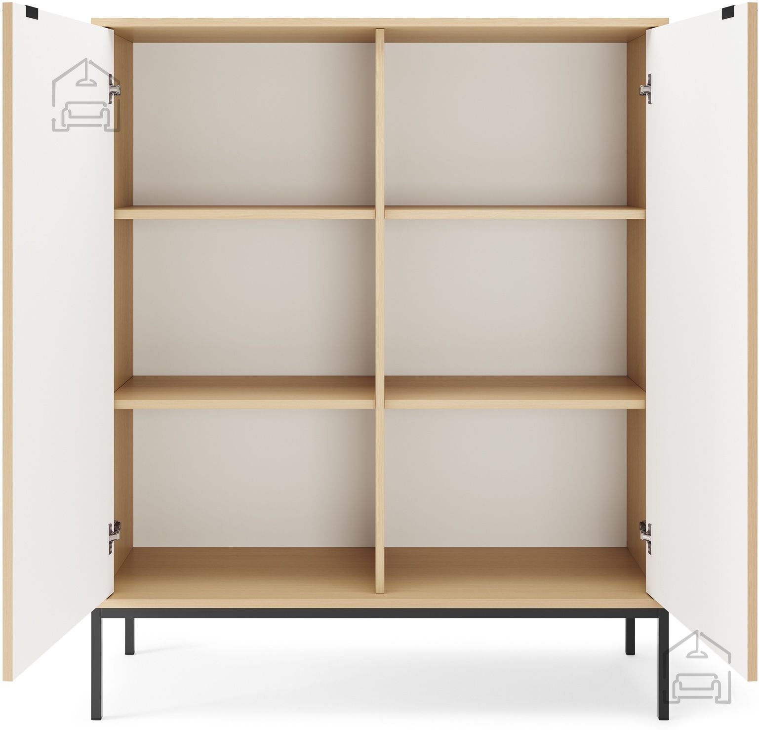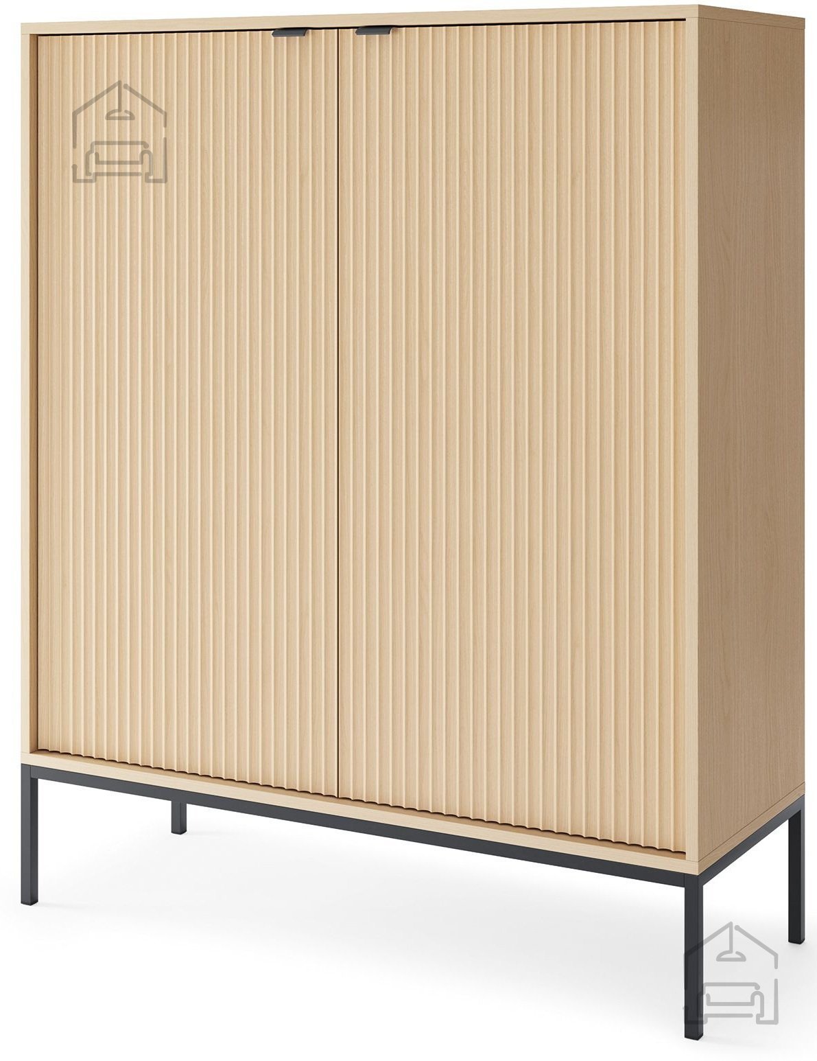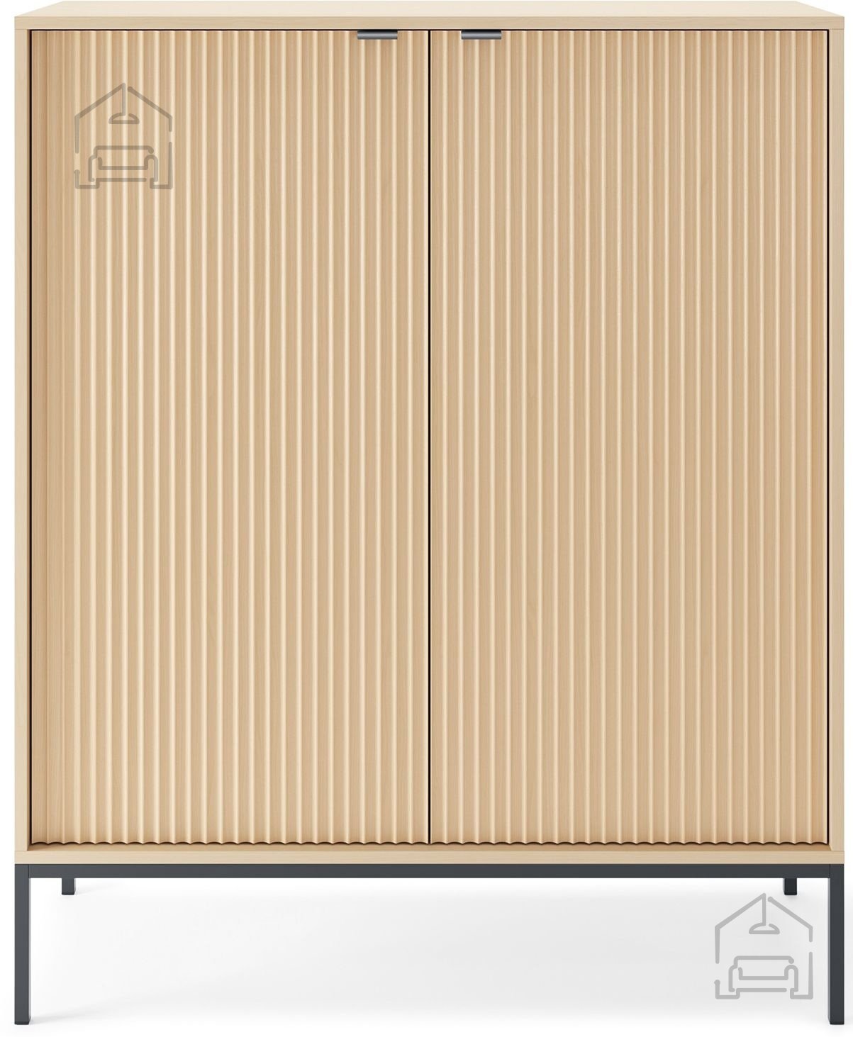 Eden izmed prepoznavnih elementov komode Nova K104 so njeni kovinski ročaji v elegantni črni barvi. Ti ne služijo le kot praktičen element za odpiranje vrat, temveč tudi kot dekorativni poudarek, ki se lepo ujema z barvo nog. Noge so prav tako kovinske in so na voljo v dveh izvedbah – črni ali zlati. S tem lahko izberete videz, ki najbolj ustreza vašemu prostoru in osebnemu slogu.