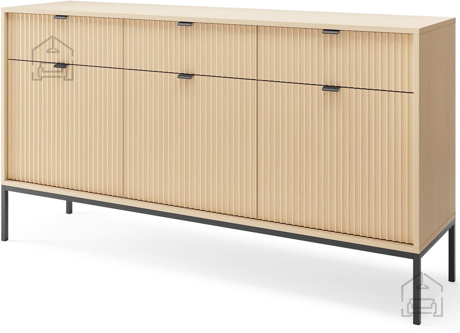 Komoda Nova KSZ154 stoji na kovinskih nogah, ki so na voljo v dveh izvedbah: črni ali zlati barvi. Takšna izbira omogoča prilagoditev estetskemu značaju prostora – črna različica poudari industrijski videz, medtem ko zlata doda pridih elegance in topline. Kovinske noge niso le dekorativen element, temveč tudi praktičen dodatek, saj olajšajo čiščenje tal pod komodo in zagotavljajo dodatno stabilnost.