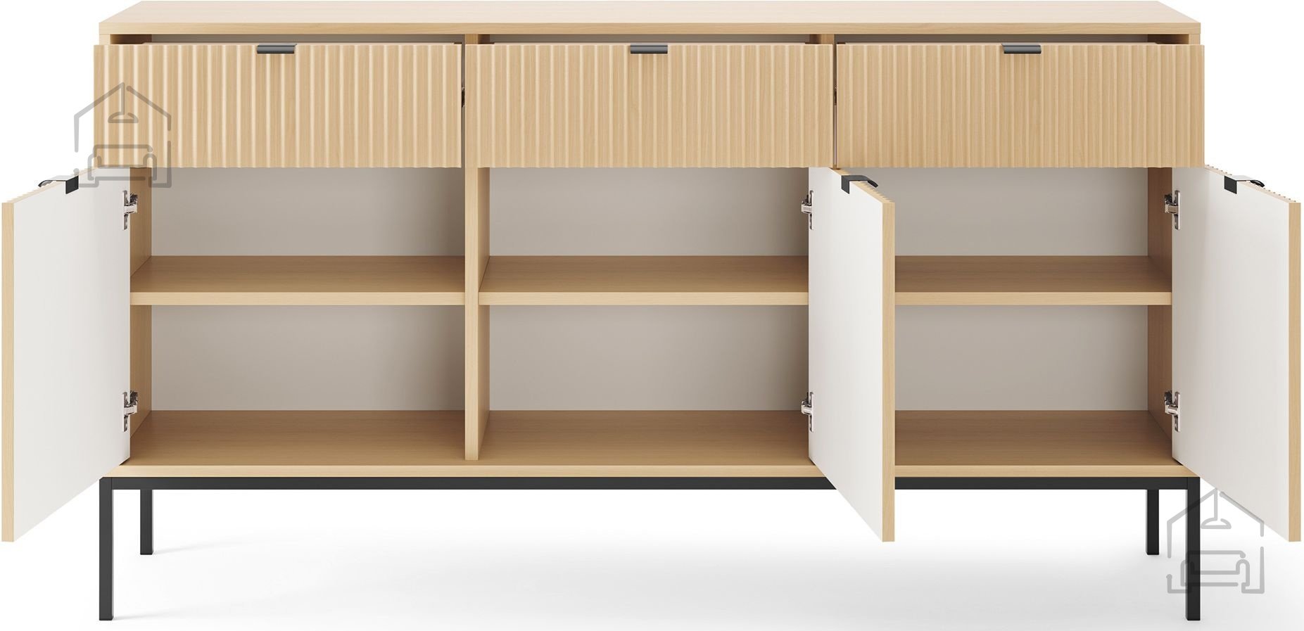 Komoda Nova KSZ154 – Piaski se odlično ujema z drugimi elementi v odtenku hrasta vicenza, kot so TV-omarice, regali ali jedilne mize. Zaradi svojega nevtralnega videza jo je mogoče kombinirati tudi z belimi ali črnimi površinami. V sodobnih interierjih se lepo poda k svetlim stenam in kovinskim dodatkom, v klasičnih pa poudari toplino lesa.