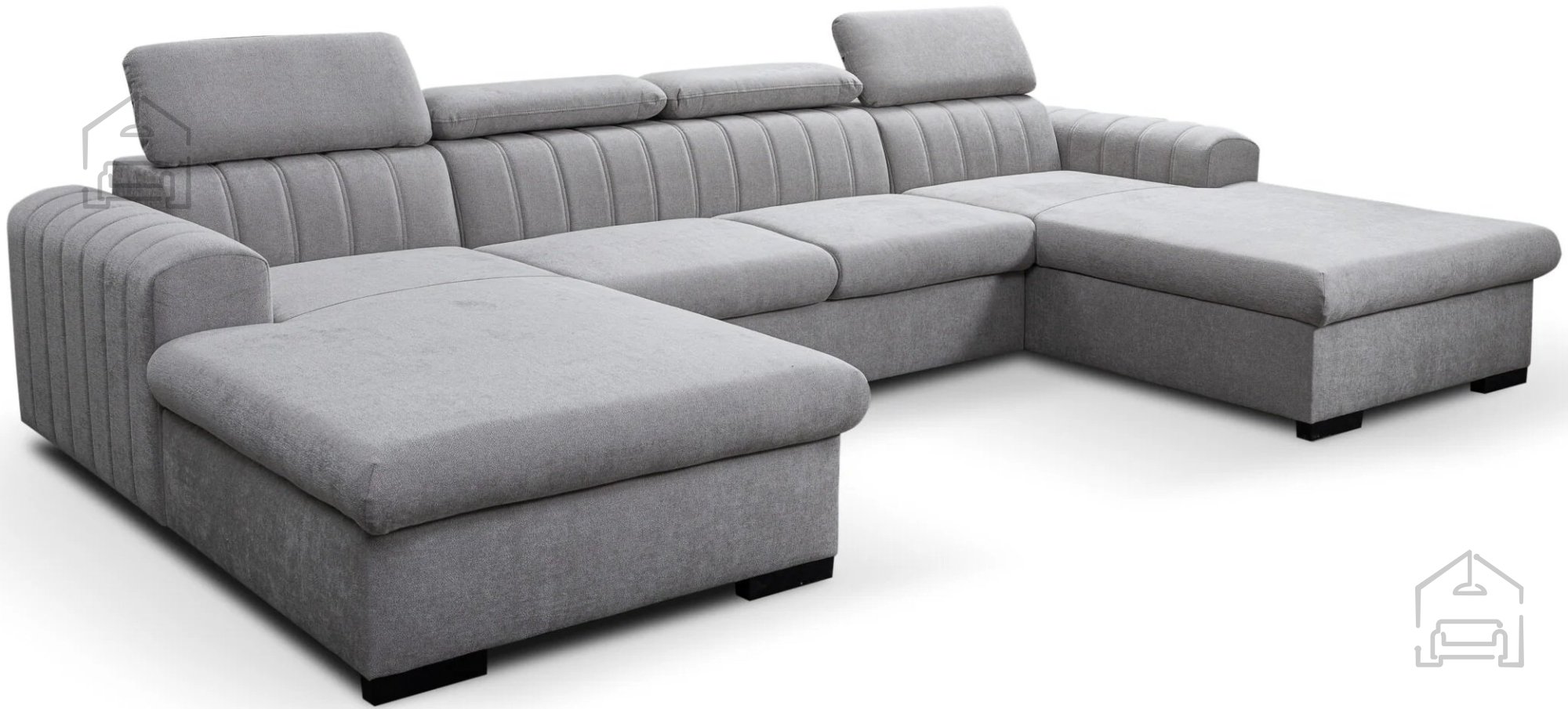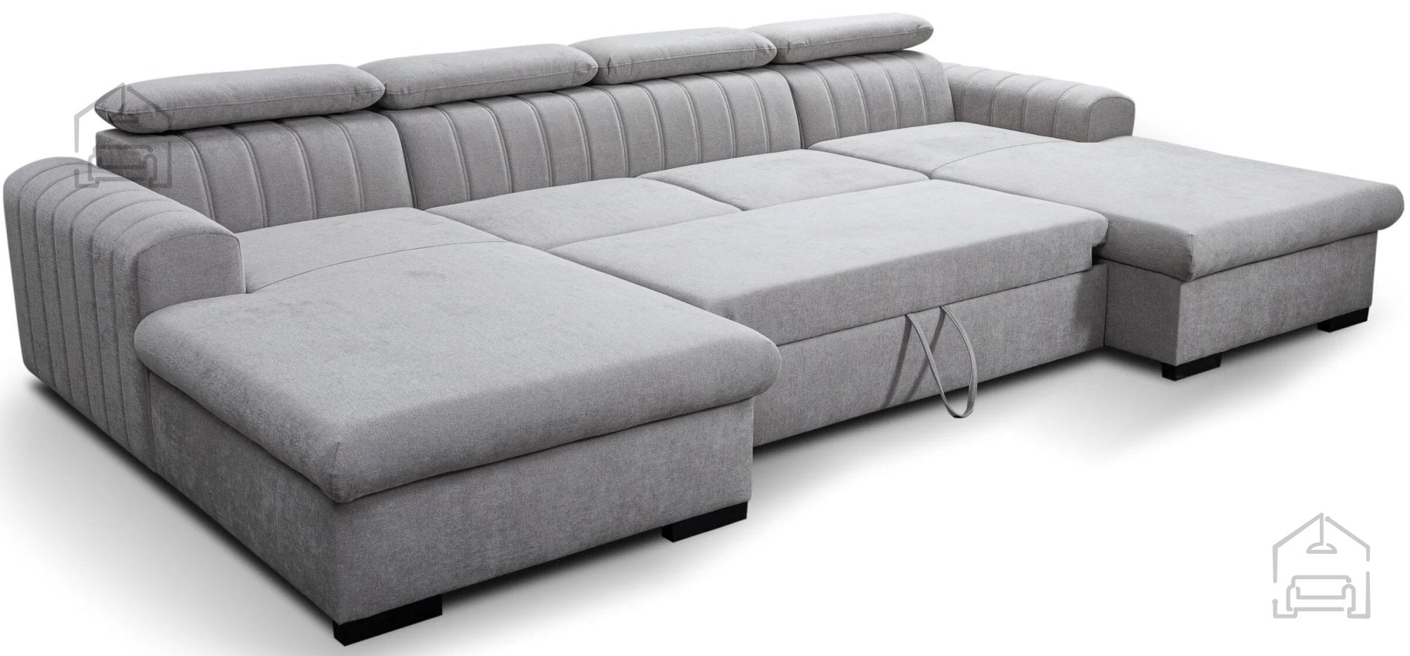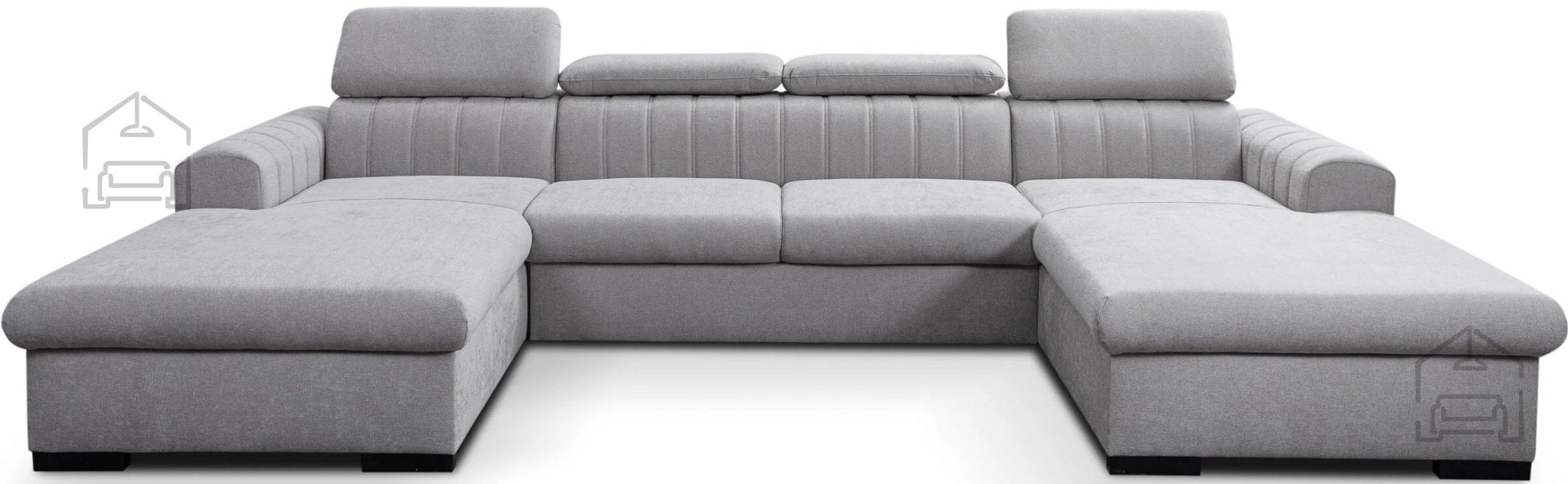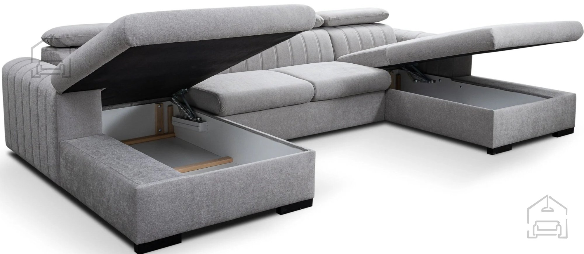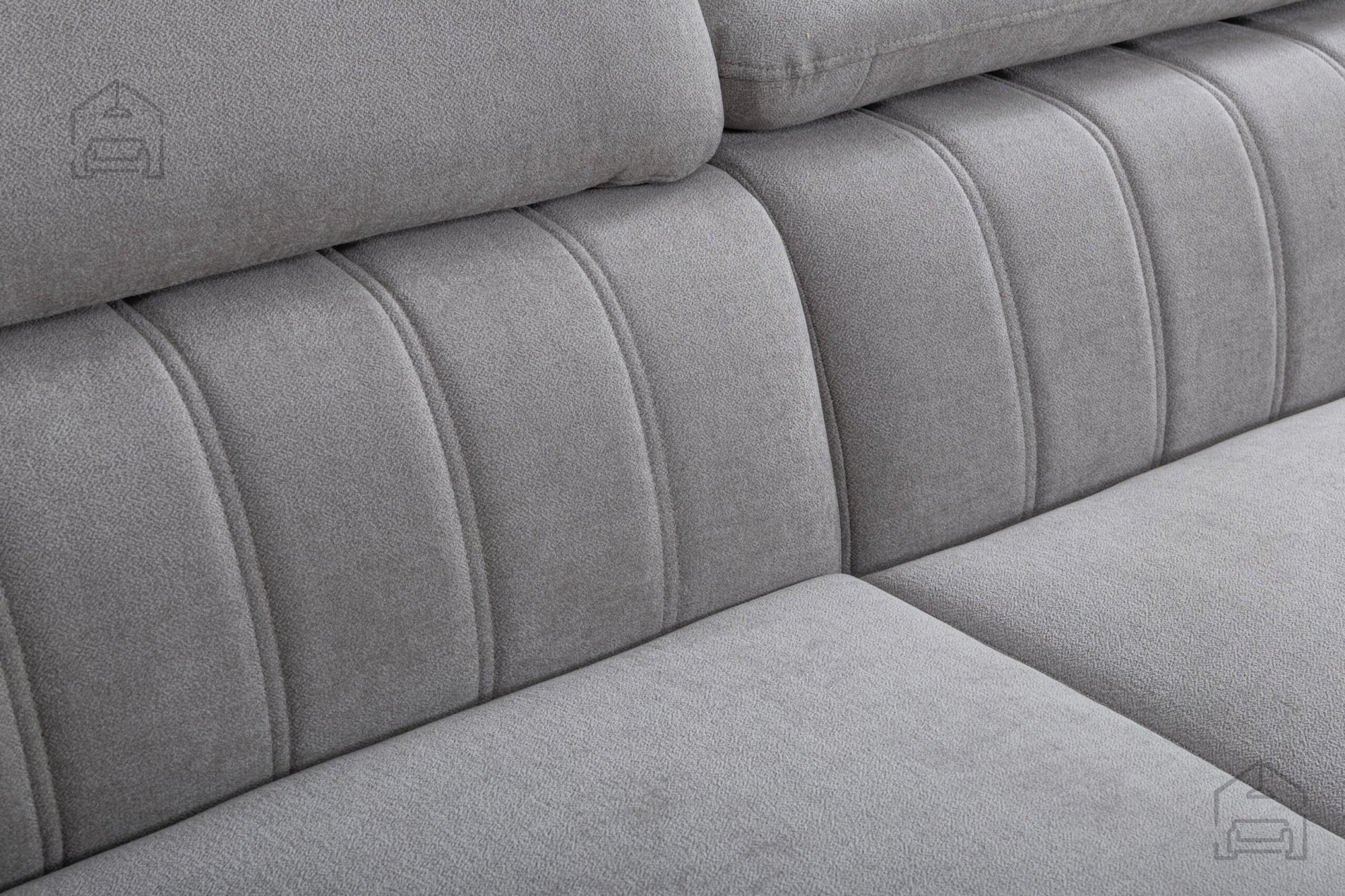 Poleg spalne funkcije vključuje garnitura tudi posodo za posteljnino, ki se nahaja pod enim od sedišč. Ta praktična rešitev omogoča priročno shranjevanje odej, vzglavnikov ali drugih tekstilnih dodatkov, kar pomaga ohranjati dnevni prostor urejen in prostorsko učinkovit. Nastavljivi vzglavniki nudijo dodatno možnost prilagoditve udobja glede na trenutno potrebo – bodisi za sproščeno branje, gledanje televizije ali pogovor.