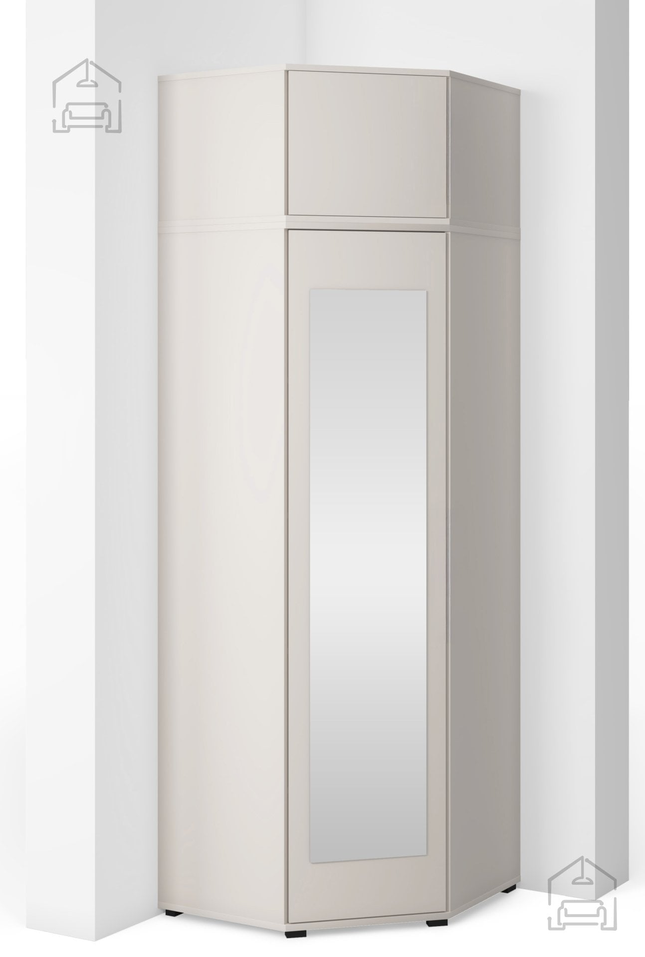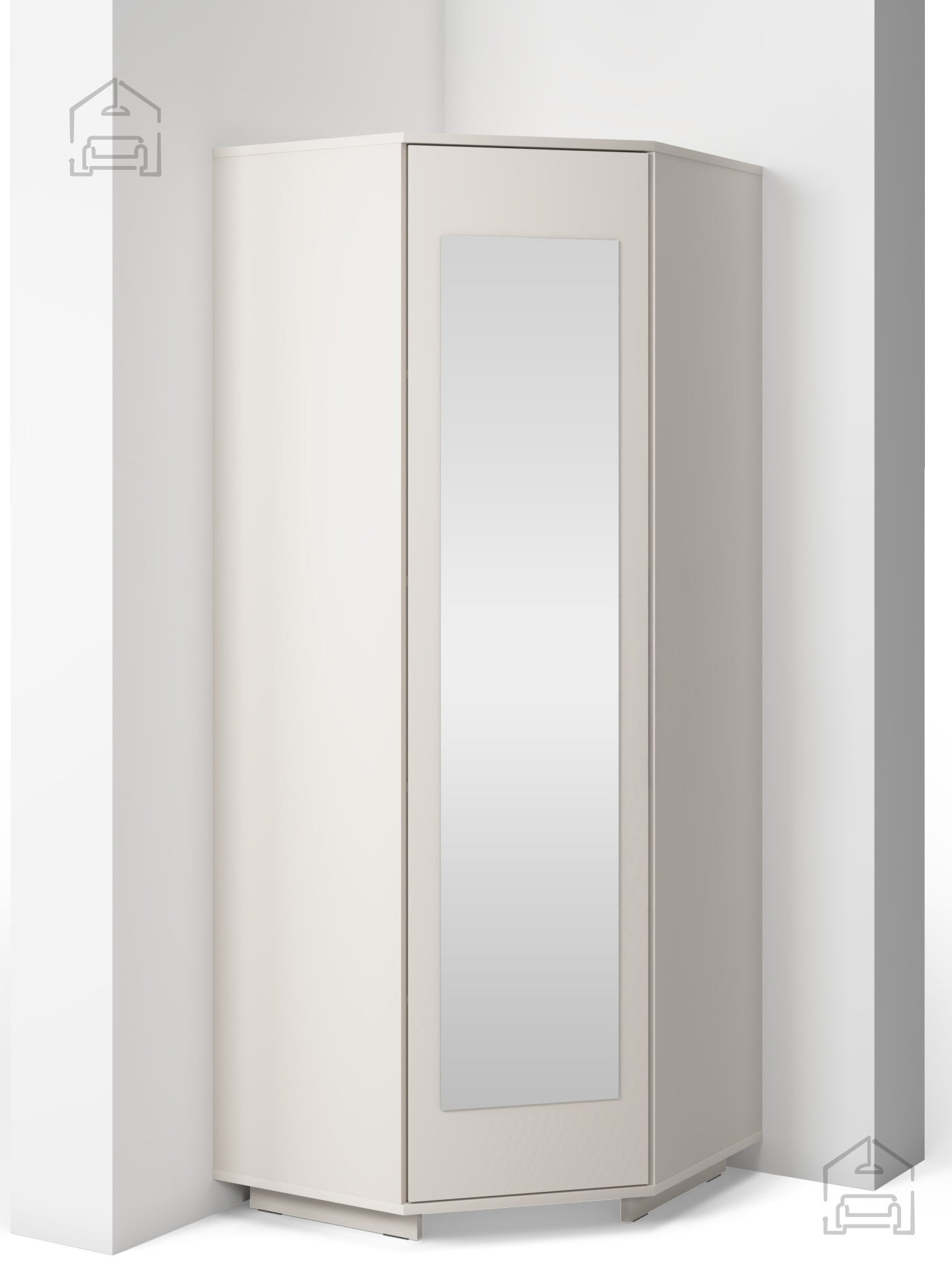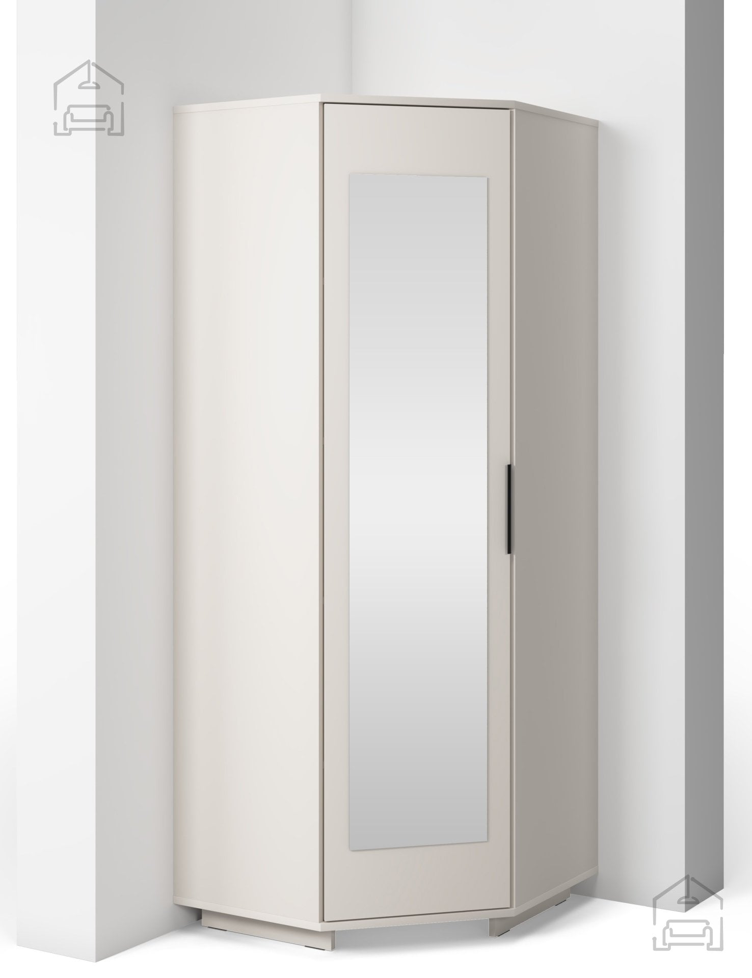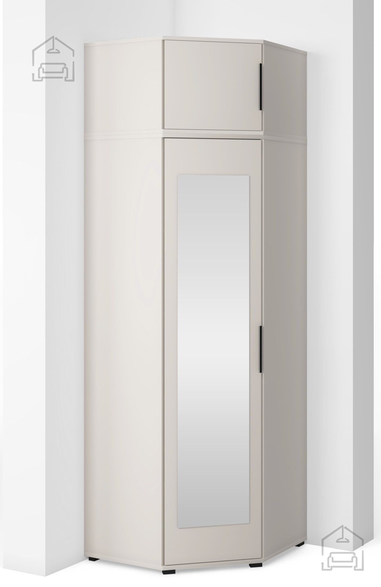 Kotna garderobna omara z ogledalom Bianco je zasnovana za funkcionalno in estetsko dovršeno ureditev spalnice ali predsobe. Njen sodoben videz v barvi kašmirja se lepo ujema z različnimi slogi notranje opreme, od minimalistične do klasične. Omara je izdelana iz kakovostne laminirane plošče debeline 16 mm, kar zagotavlja trdnost in dolgo življenjsko dobo. Vgrajeno ogledalo na vratih vizualno poveča prostor in doda praktično vrednost pri vsakodnevni uporabi.
