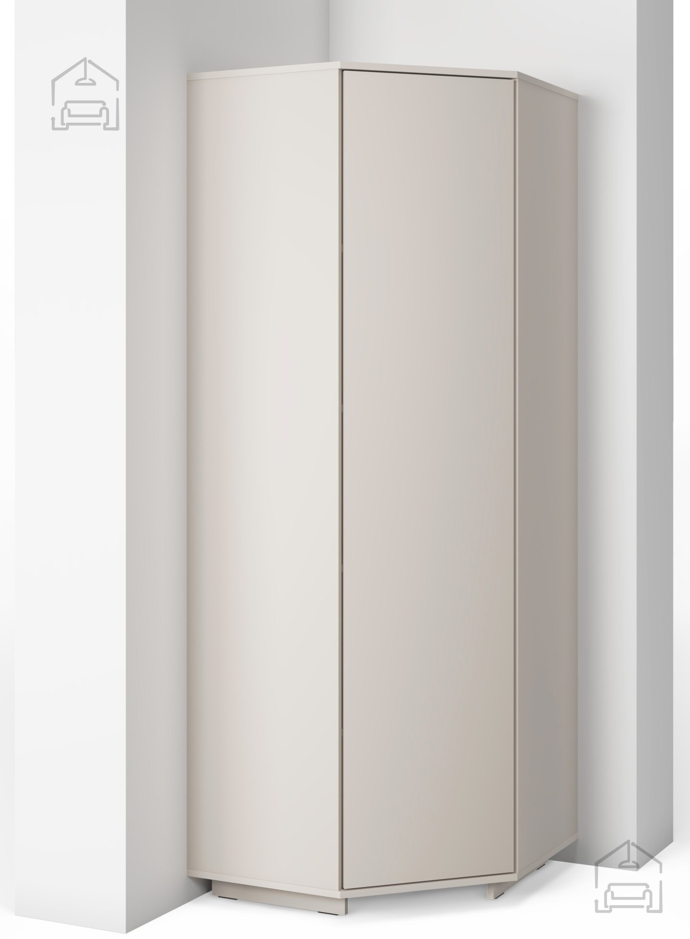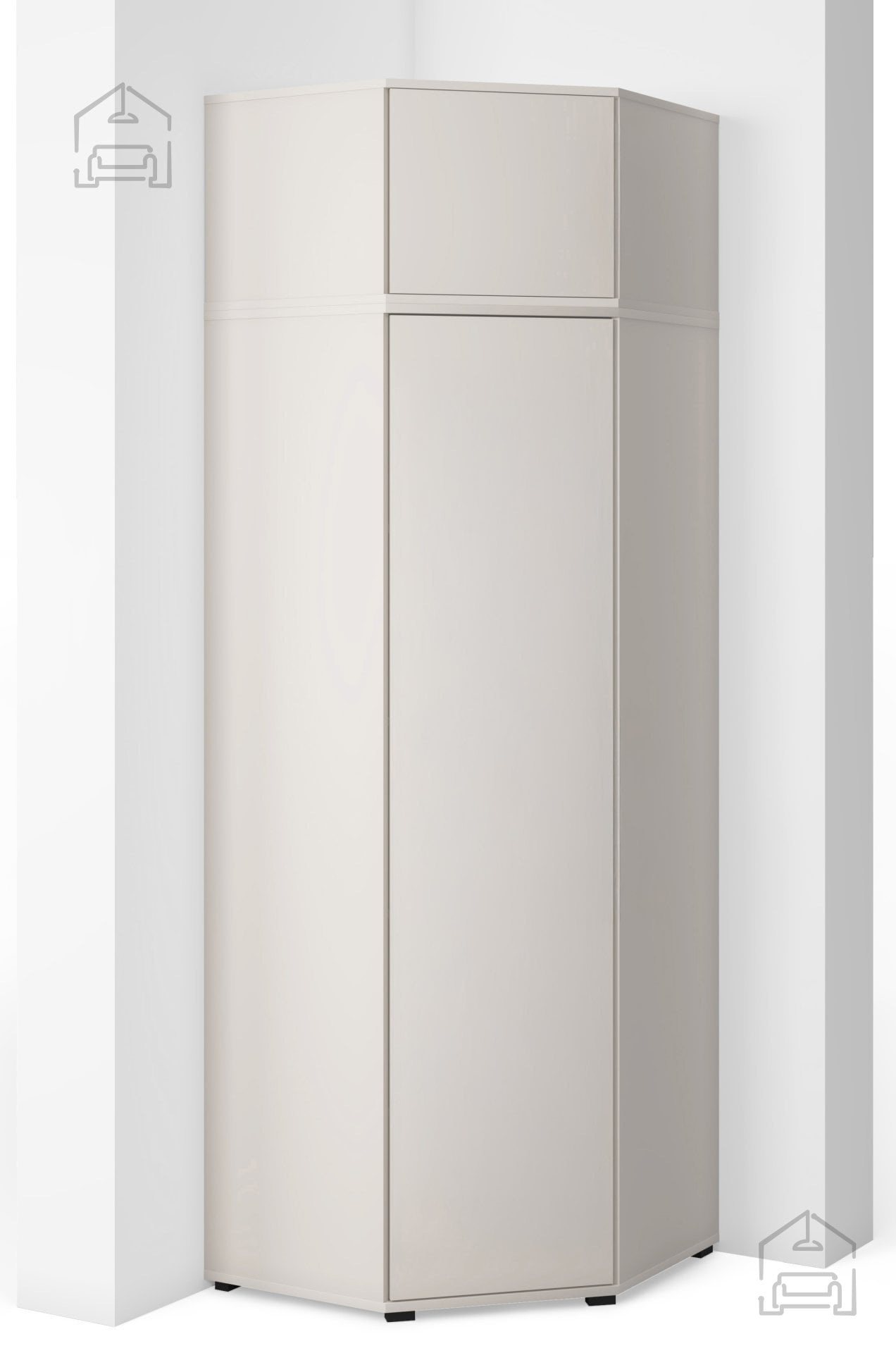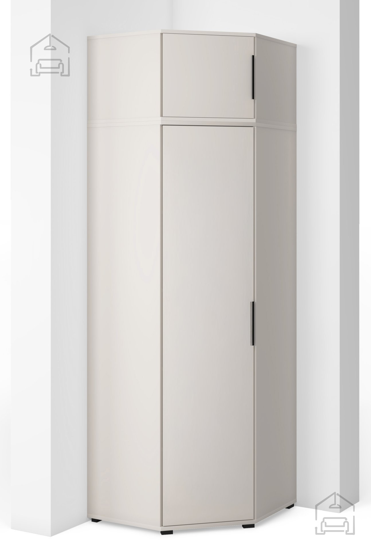 Kotna garderobna omara Bianco se zaradi svojih dimenzij 70x70x189 cm odlično prilega v kote sob in s tem maksimalno izkoristi prostor, ki bi sicer ostal neizkoriščen. Lahko jo kombinirate z drugimi omarami iz iste kolekcije, da ustvarite celovit garderobni sistem. Z dodatkom podaljška v barvi kašmirja se omara razširi in ponudi še več prostora za oblačila, čevlje ali dodatke. Notranja razporeditev omogoča pregledno shranjevanje, kar olajša vsakodnevno organizacijo.