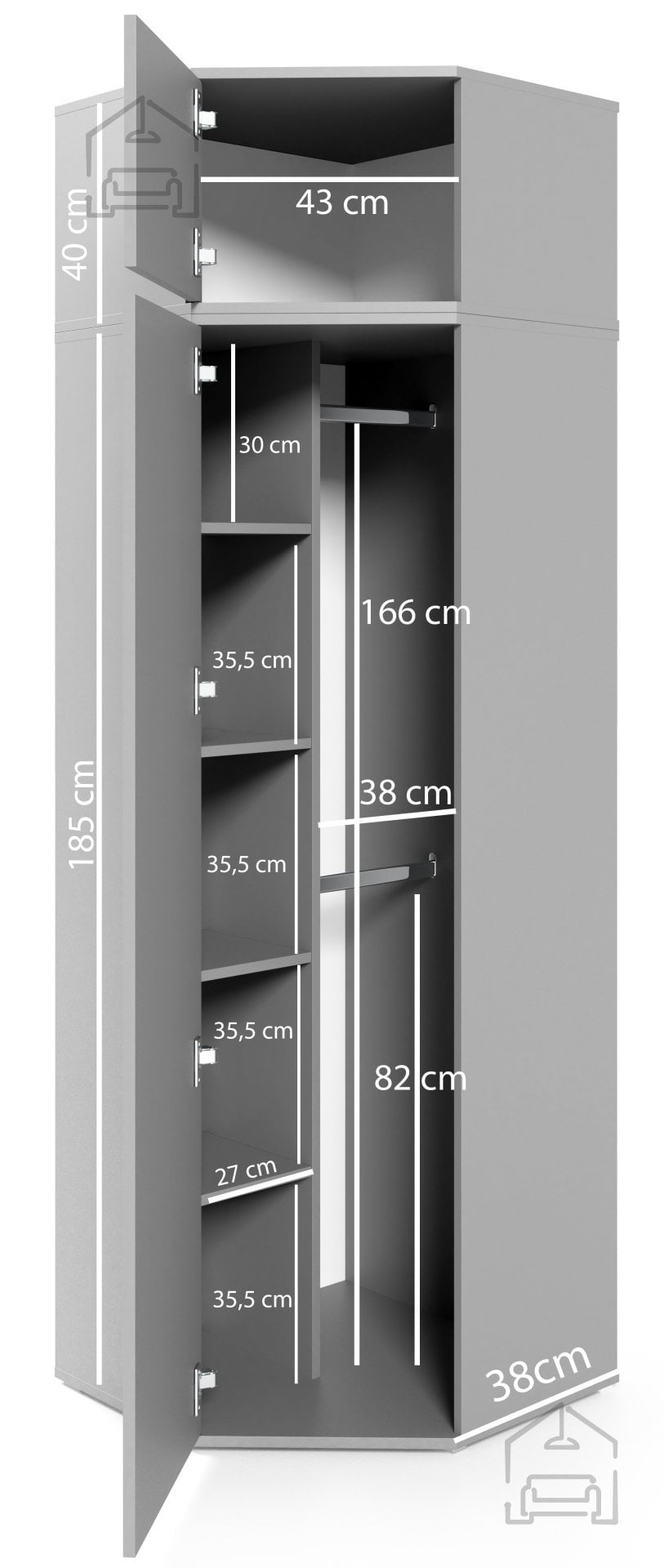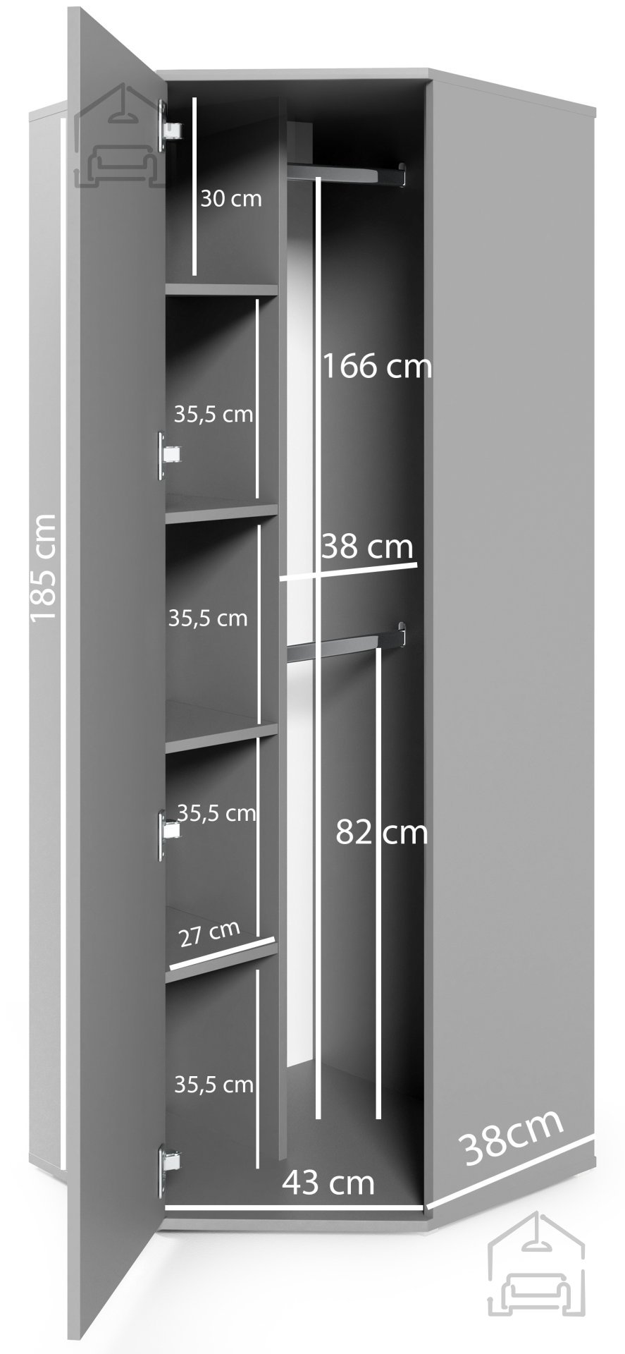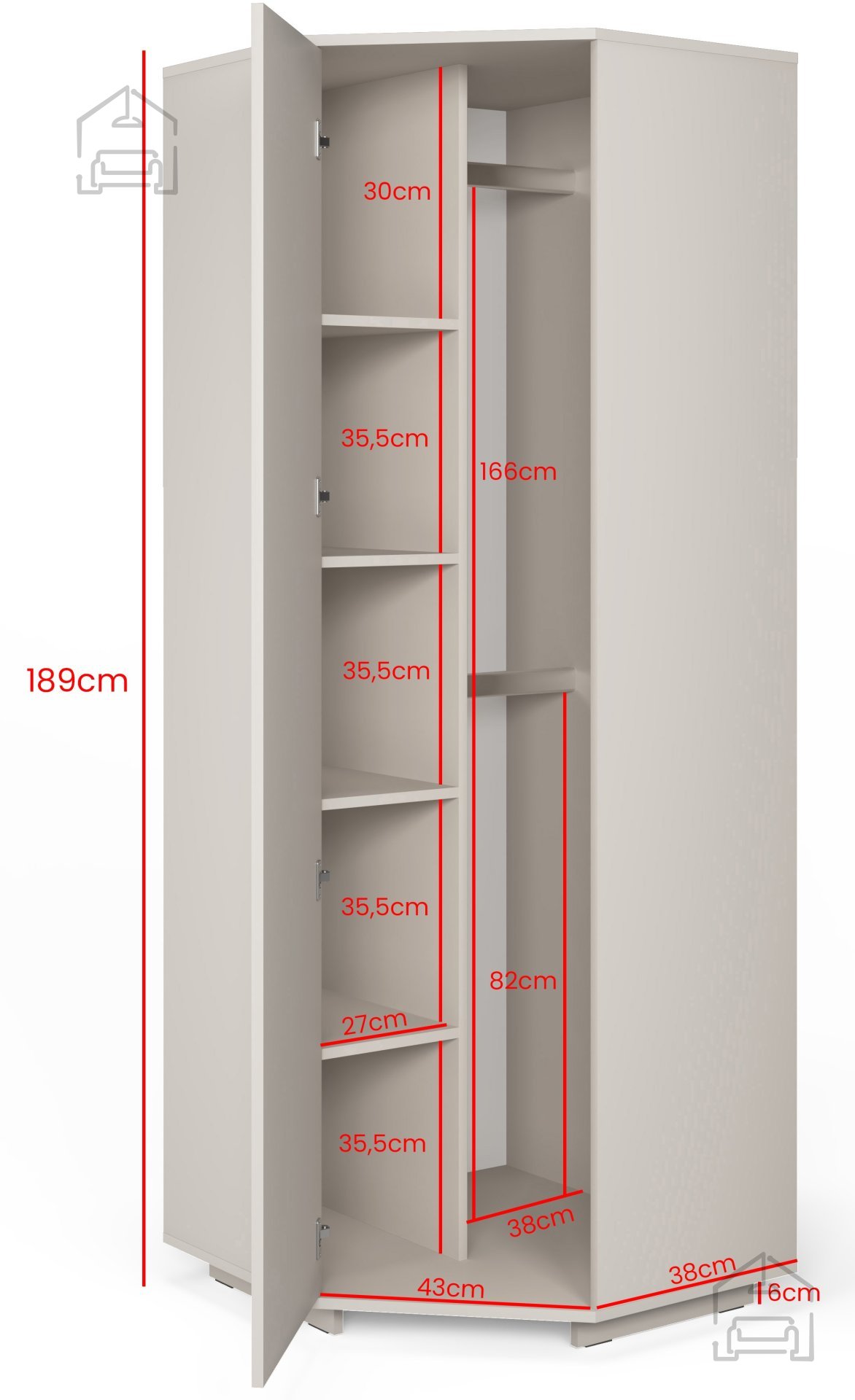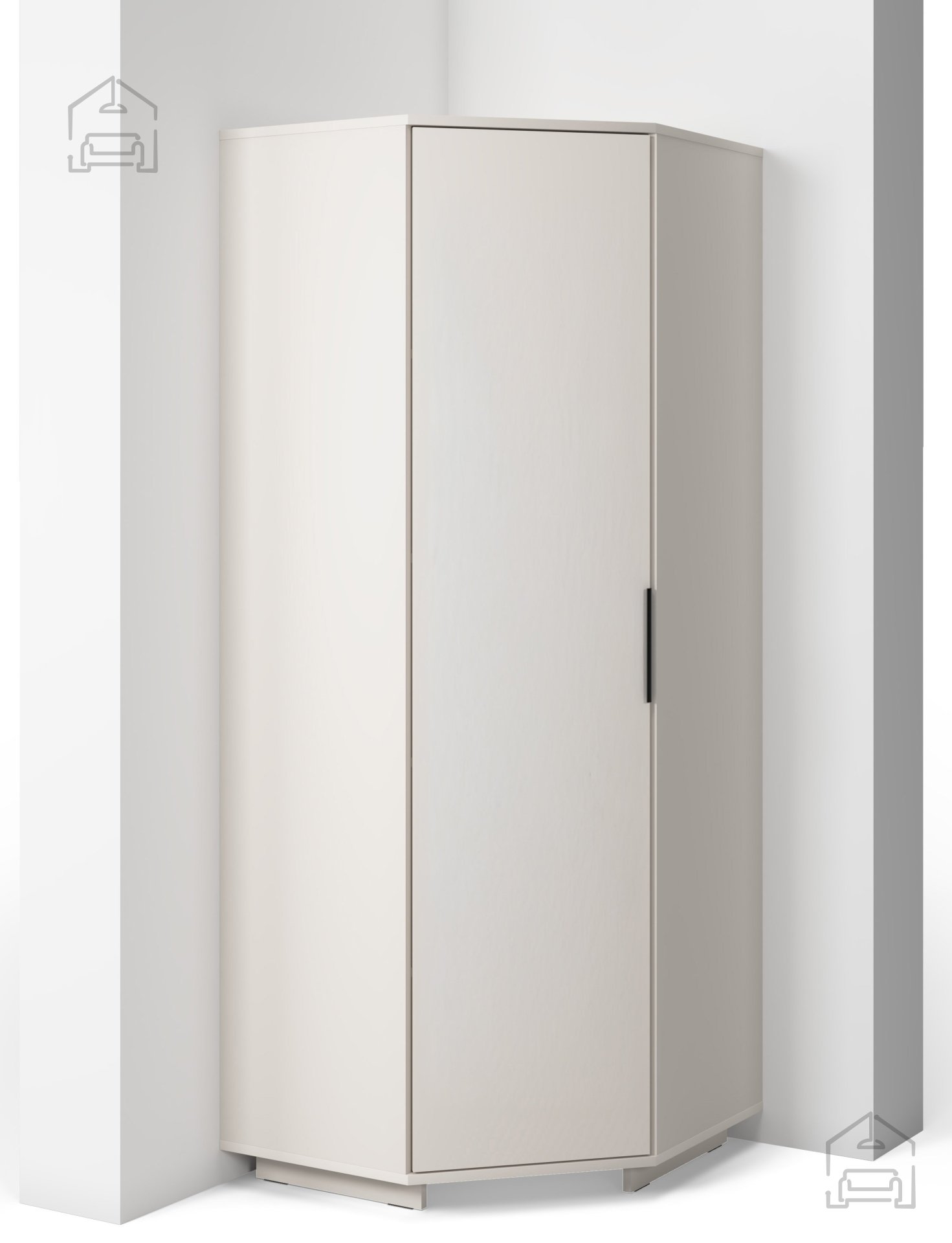 Kotna garderobna omara Bianco se zaradi svojih dimenzij 70x70x189 cm odlično prilega v kote sob in s tem maksimalno izkoristi prostor, ki bi sicer ostal neizkoriščen. Lahko jo kombinirate z drugimi omarami iz iste kolekcije, da ustvarite celovit garderobni sistem. Z dodatkom podaljška v barvi kašmirja se omara razširi in ponudi še več prostora za oblačila, čevlje ali dodatke. Notranja razporeditev omogoča pregledno shranjevanje, kar olajša vsakodnevno organizacijo.