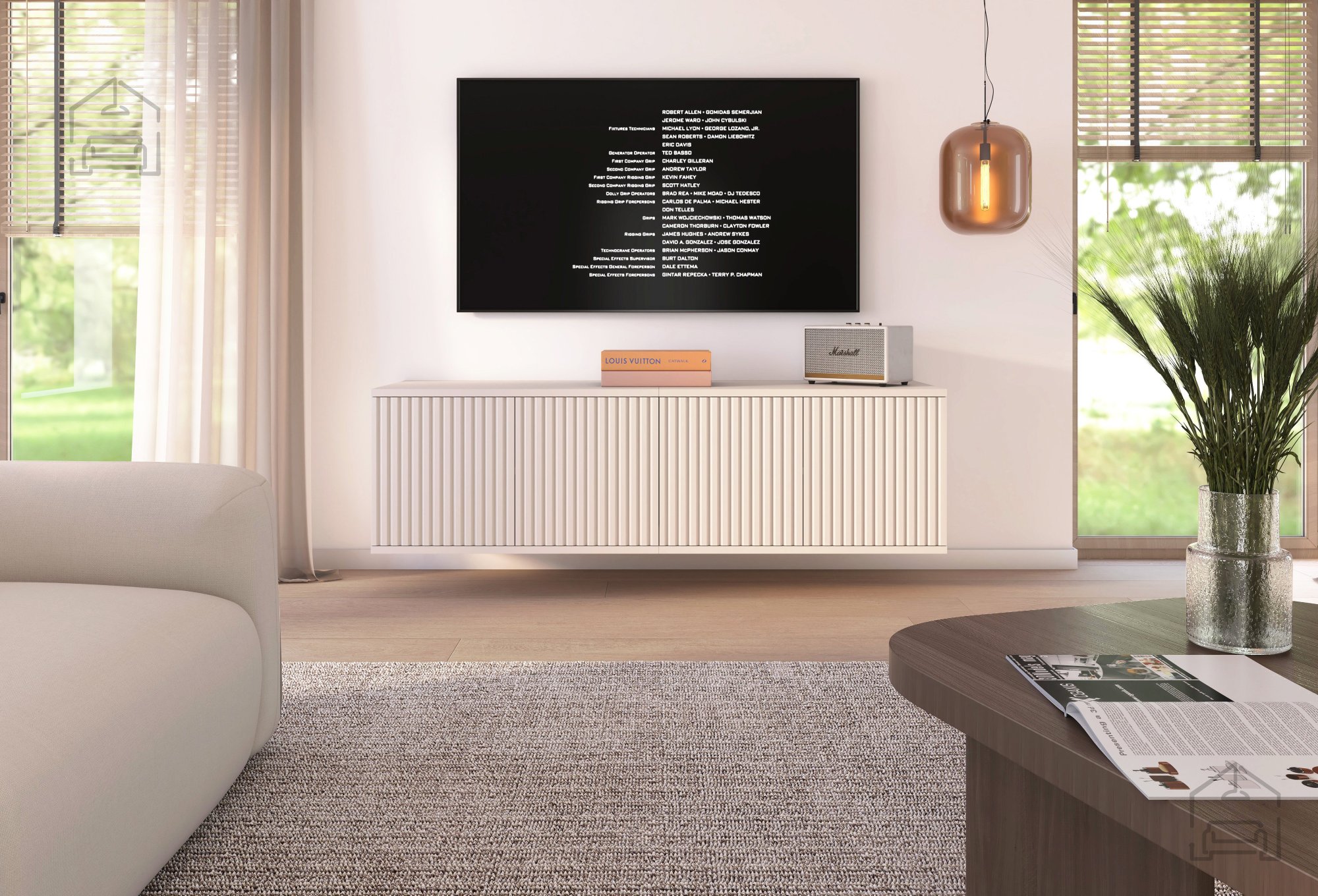 Komoda nudi dovolj prostora za shranjevanje elektronskih naprav, multimedijskih pripomočkov in dodatkov. Zaradi svoje viseče konstrukcije omogoča preprosto organizacijo kablov ter estetsko urejen videz brez nepotrebnega nereda. V notranjosti se lahko nahajajo odprti ali zaprti predali, odvisno od različice, kar omogoča prilagoditev glede na potrebe uporabnika in razpoložljiv prostor.