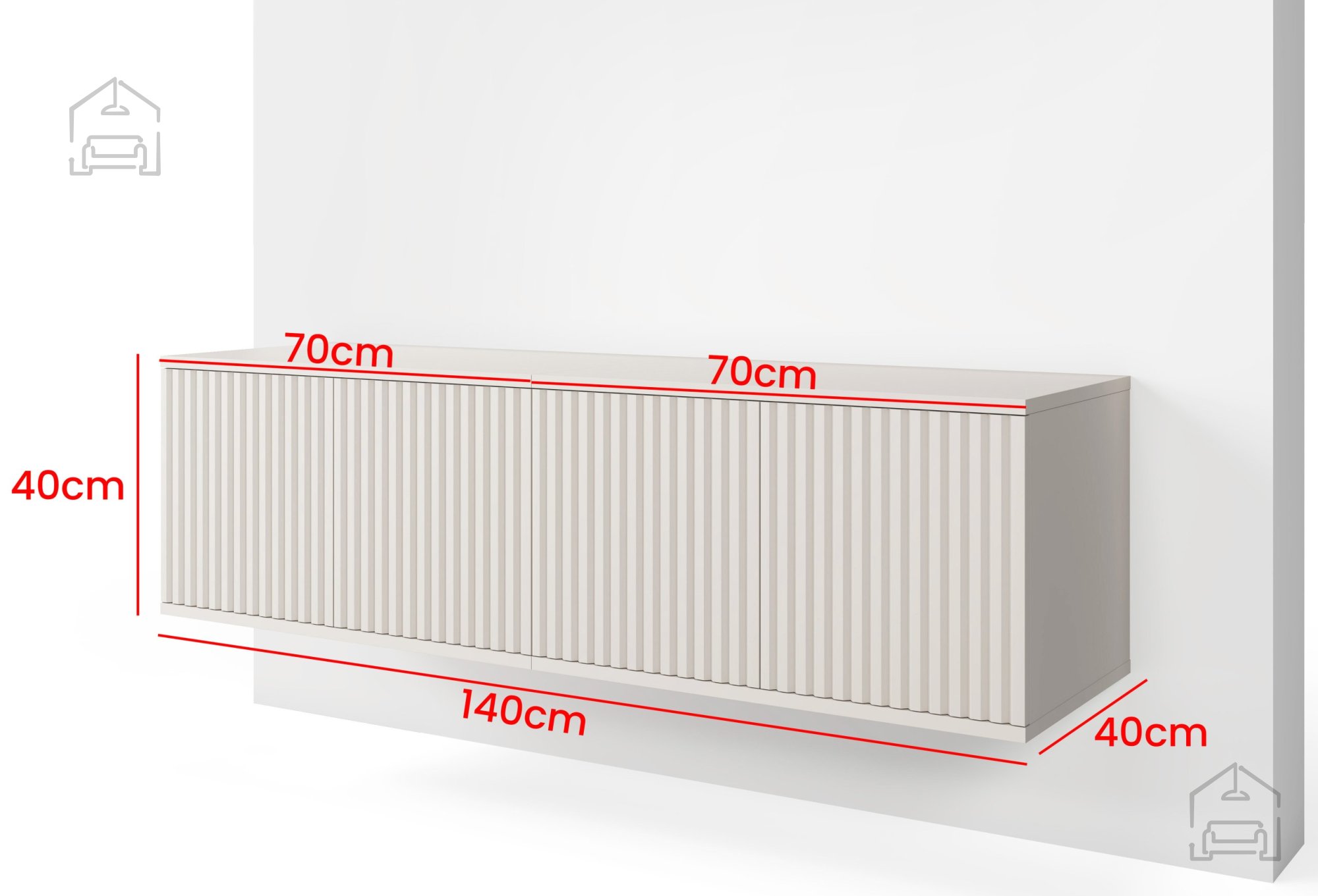 Komoda meri 140x40x40 cm, kar pomeni, da ponuja dovolj prostora za televizorje različnih velikosti, ne da bi zavzela preveč prostora na steni. Viseča postavitev omogoča lažje čiščenje tal in ustvarja občutek lebdenja, ki prispeva k sodobnemu videzu prostora. Minimalistične linije in brezročajna zasnova poudarjata sodoben slog in omogočata, da se komoda harmonično zlije z drugimi kosi pohištva.