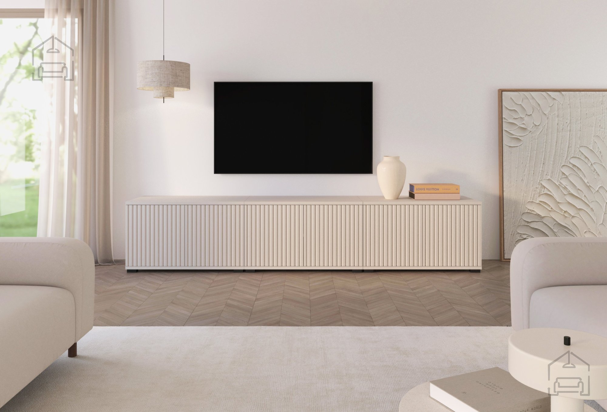 TV komoda Rayo 210 – PKMebel je sodobno zasnovan kos pohištva, ki združuje preprosto eleganco, funkcionalnost in kakovostno izdelavo. S svojim umirjenim videzom v barvi kašmir se zlahka ujema z različnimi slogi notranje opreme, od minimalističnih do klasičnih dnevnih sob. Njene čiste linije in uravnoteženi proporci ustvarjajo občutek reda in prostornosti, medtem ko premišljeni materiali zagotavljajo trpežnost in enostavno vzdrževanje.