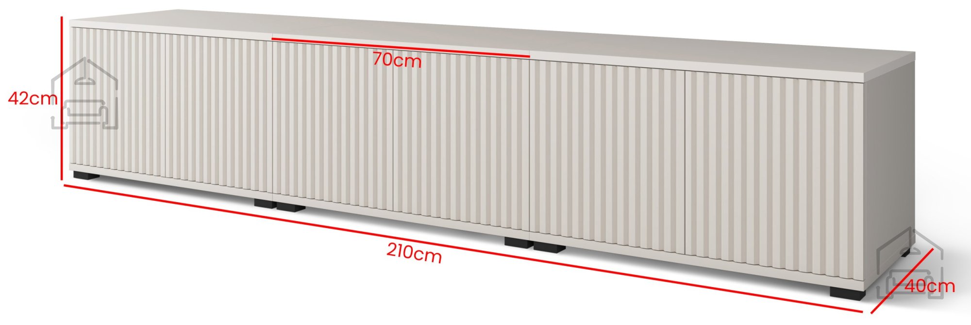 Komoda ima zunanje mere 210x40x42 cm. Ta dolžina omogoča stabilno postavitev večjih televizorjev, hkrati pa ponuja dovolj prostora za shranjevanje dodatne opreme, kot so igralne konzole, zvočniki ali sprejemniki. Višina 42 cm ohranja nizko, elegantno silhueto, ki ne zapira prostora in omogoča udoben pogled na zaslon s sedežne garniture.