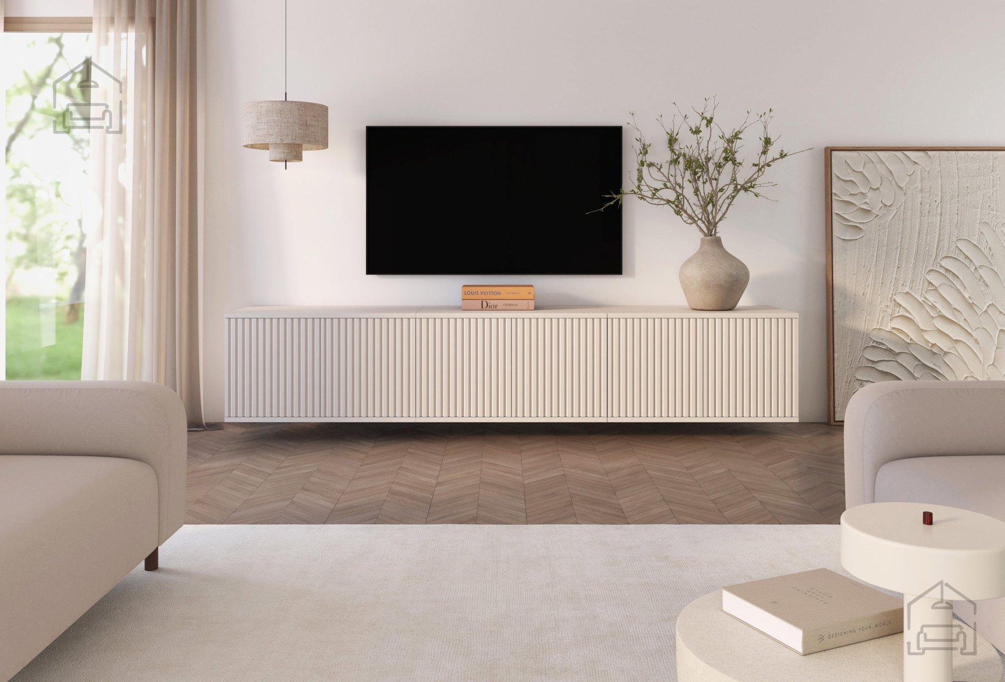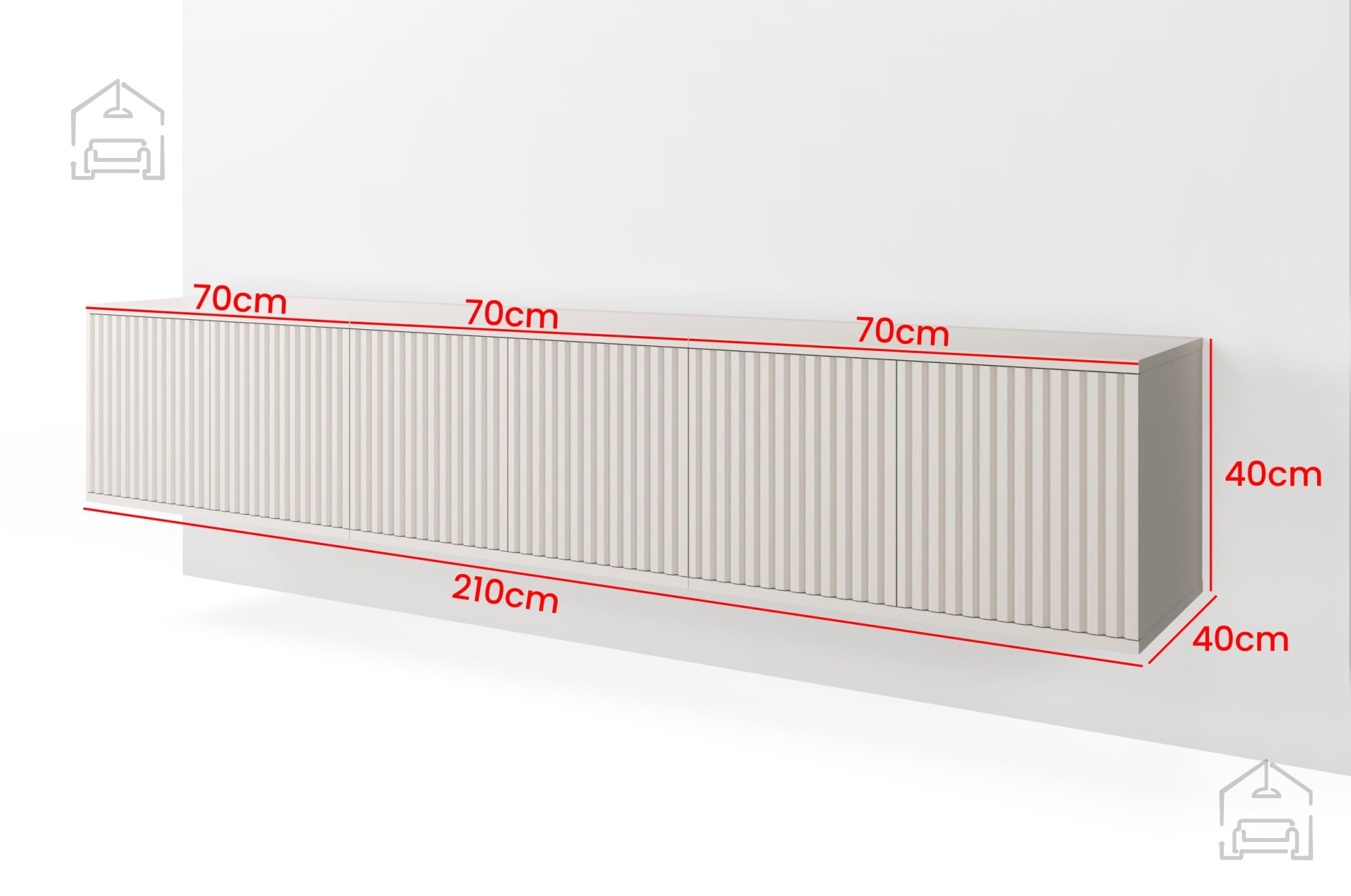 Če iščete sodoben in funkcionalen kos pohištva, ki bo v vašo dnevno sobo vnesel toplino in eleganco, je TV komoda Rayo 210 – PKMebel prava izbira. Njena viseča konstrukcija, kakovostna izdelava in prefinjena barva cashmere ustvarjajo harmoničen videz prostora, ki bo navdušil vsakogar, ki ceni minimalistično estetiko in premišljene detajle.