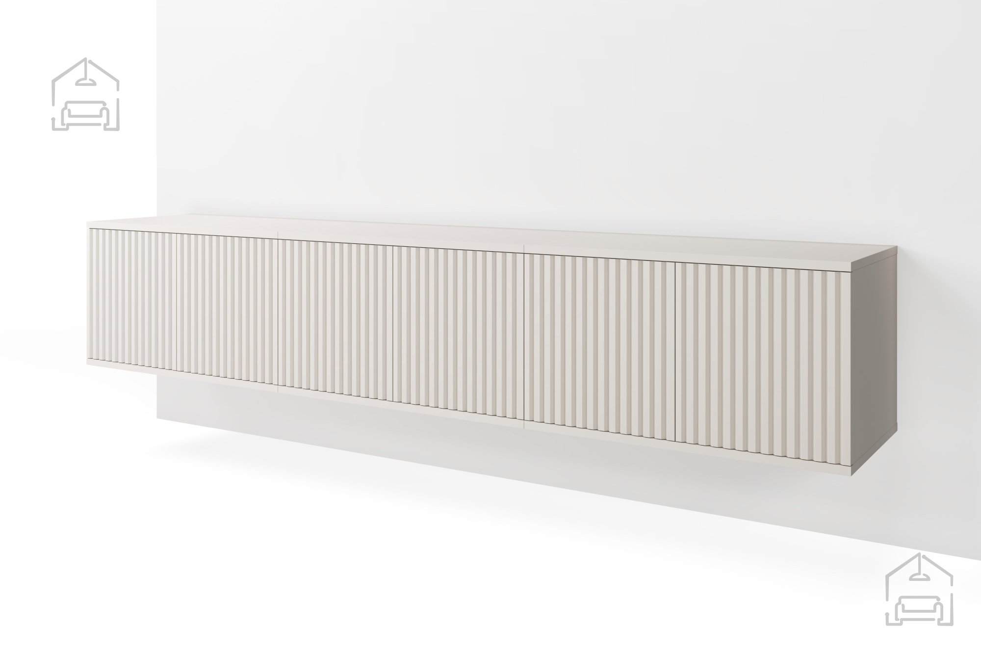 TV komoda Rayo 210 – viseča, blagovne znamke PKMebel, združuje sodoben dizajn, funkcionalnost in minimalistično eleganco. Izdelana je iz kakovostne laminirane plošče debeline 16 mm, ki zagotavlja trdnost in dolgo življenjsko dobo. Površina v nežnem odtenku cashmere (kašmir) daje pohištvu toplino in prefinjen videz, ki se odlično ujema z različnimi barvnimi kombinacijami v dnevni sobi. Komoda je zasnovana kot viseči element, kar omogoča lažje čiščenje prostora pod njo in ustvarja občutek lebdenja ter prostornosti.