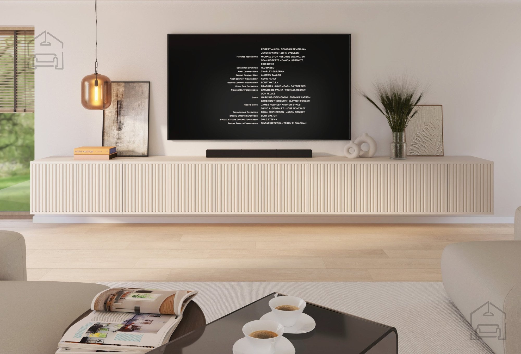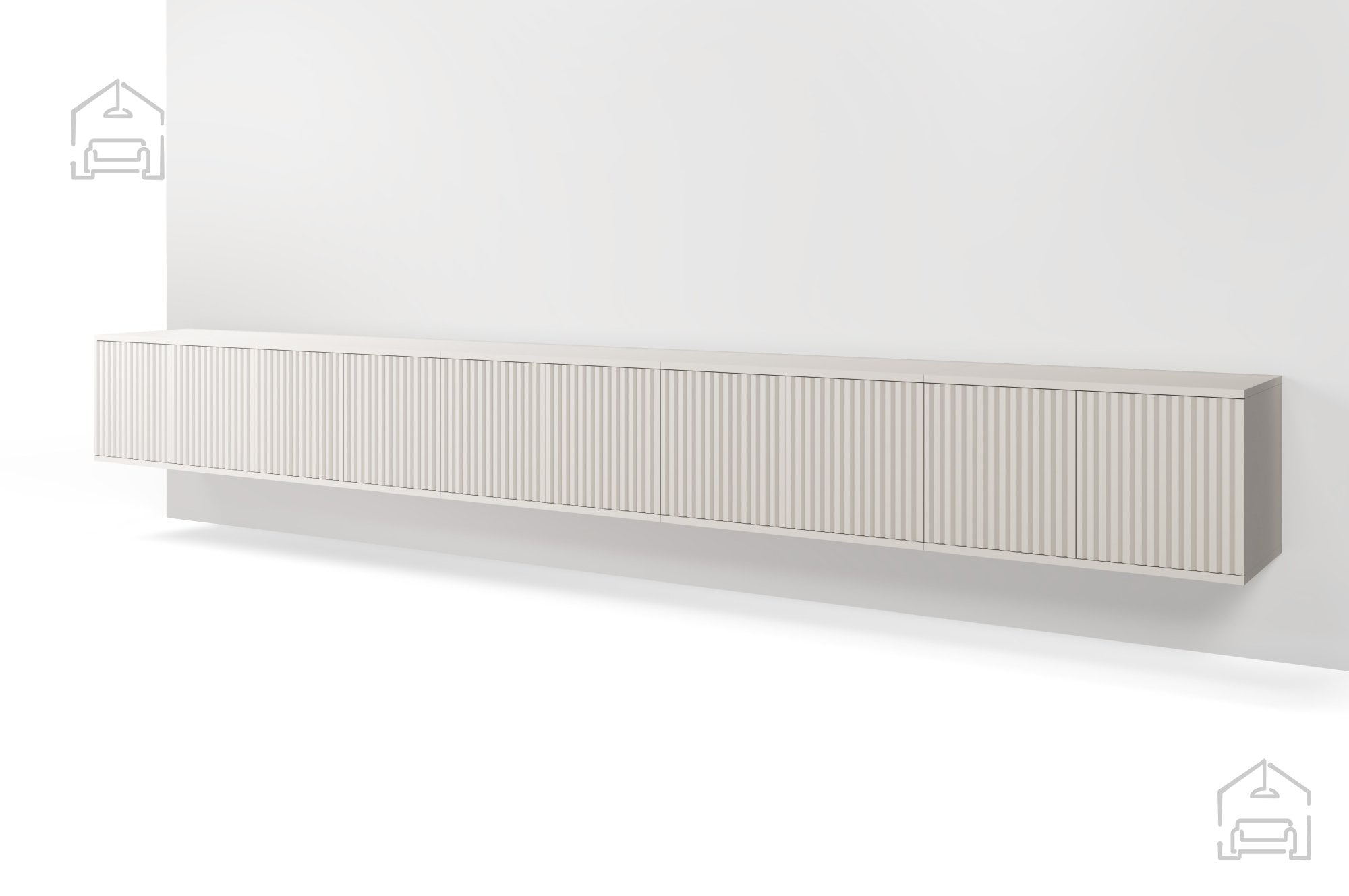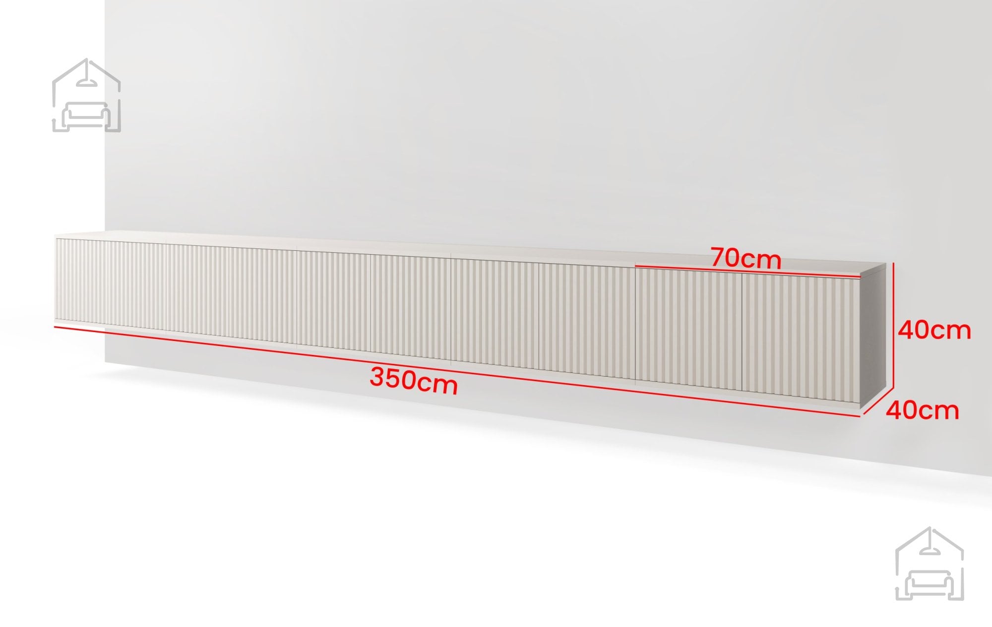 TV komoda Rayo 350 – viseča, v barvi toplih odtenkov kašmirja, je sodoben kos pohištva, ki se popolnoma zlije z različnimi slogi notranje opreme. S svojo širino 350 cm, višino 40 cm in globino 40 cm ponuja dovolj prostora za shranjevanje multimedijskih naprav, dodatkov ali dekorativnih predmetov, hkrati pa ohranja zračen in urejen videz dnevnega prostora. Zahvaljujoč viseči montaži ustvarja občutek lahkotnosti ter omogoča enostavno čiščenje tal pod elementom.
