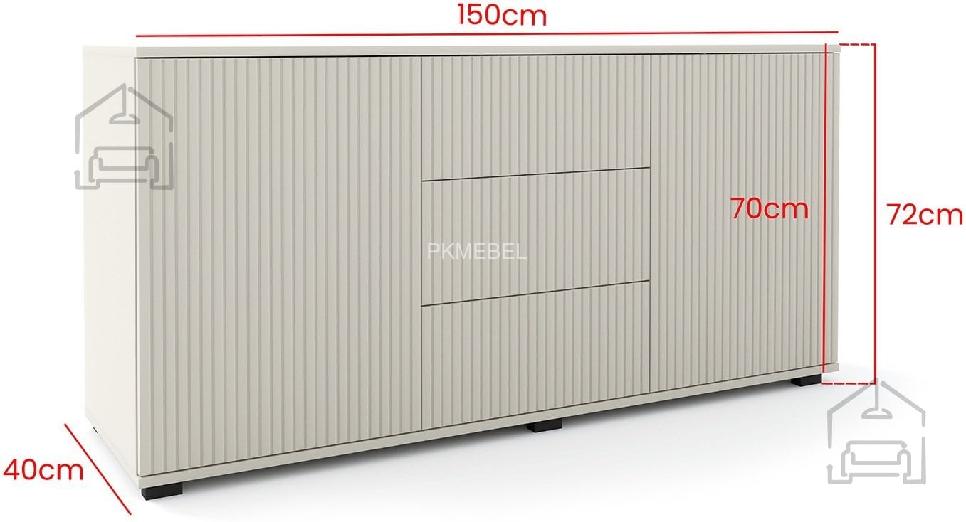 Komoda 2D3S Agnes – PKMebel je prefinjen kos pohištva, ki združuje sodobno estetiko, praktično zasnovo in kakovostno izdelavo. Njen umirjen odtenek kašmirja deluje toplo in elegantno, zato se komoda brez težav poda tako v minimalistične kot tudi v bolj klasične interierje. S svojo uravnoteženo širino 150 cm, globino 40 cm in višino 72 cm nudi dovolj prostora za shranjevanje, ne da bi obremenila prostor. Izdelana je iz iverala, kar zagotavlja trdnost, stabilnost in enostavno vzdrževanje površine.