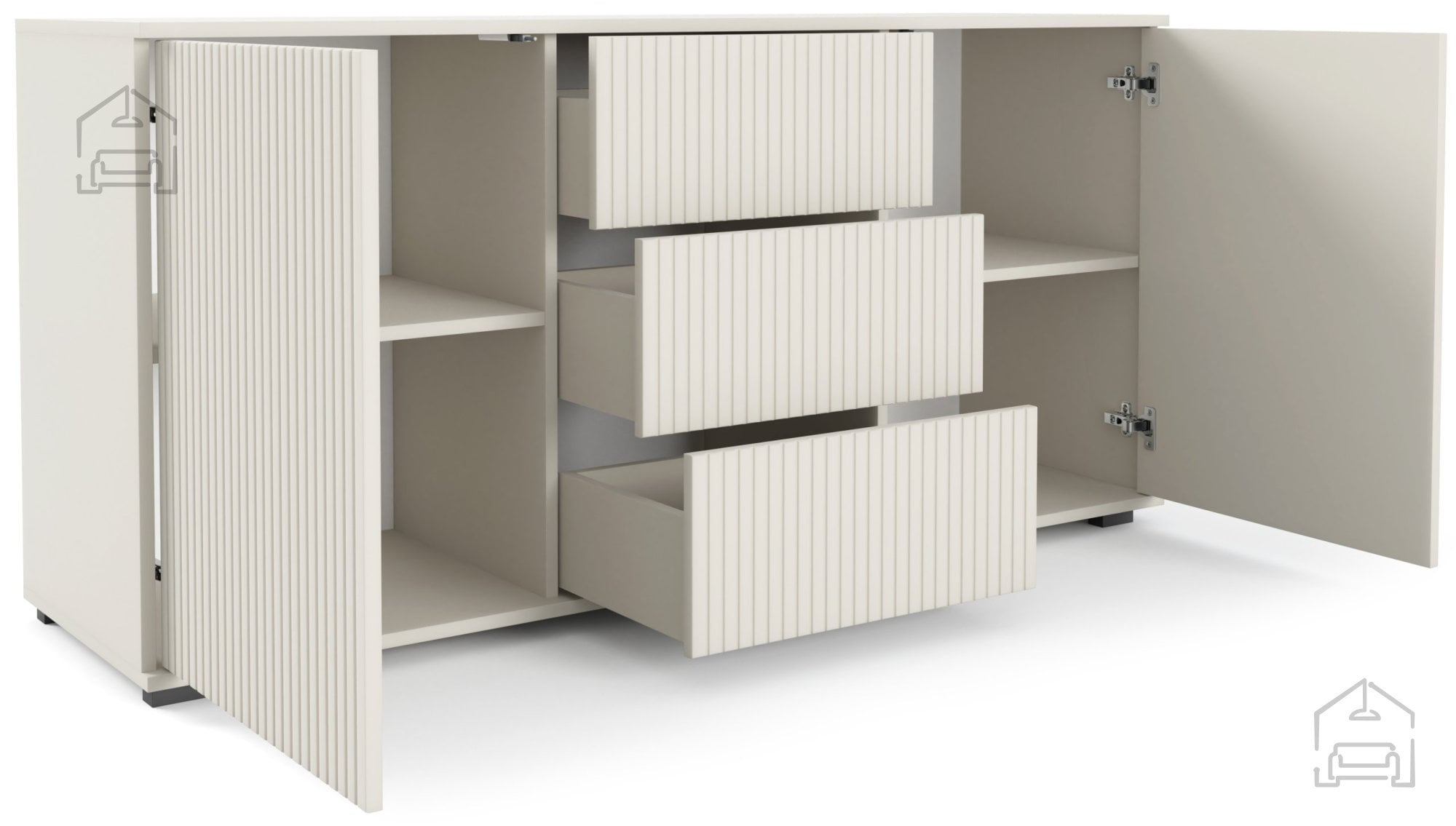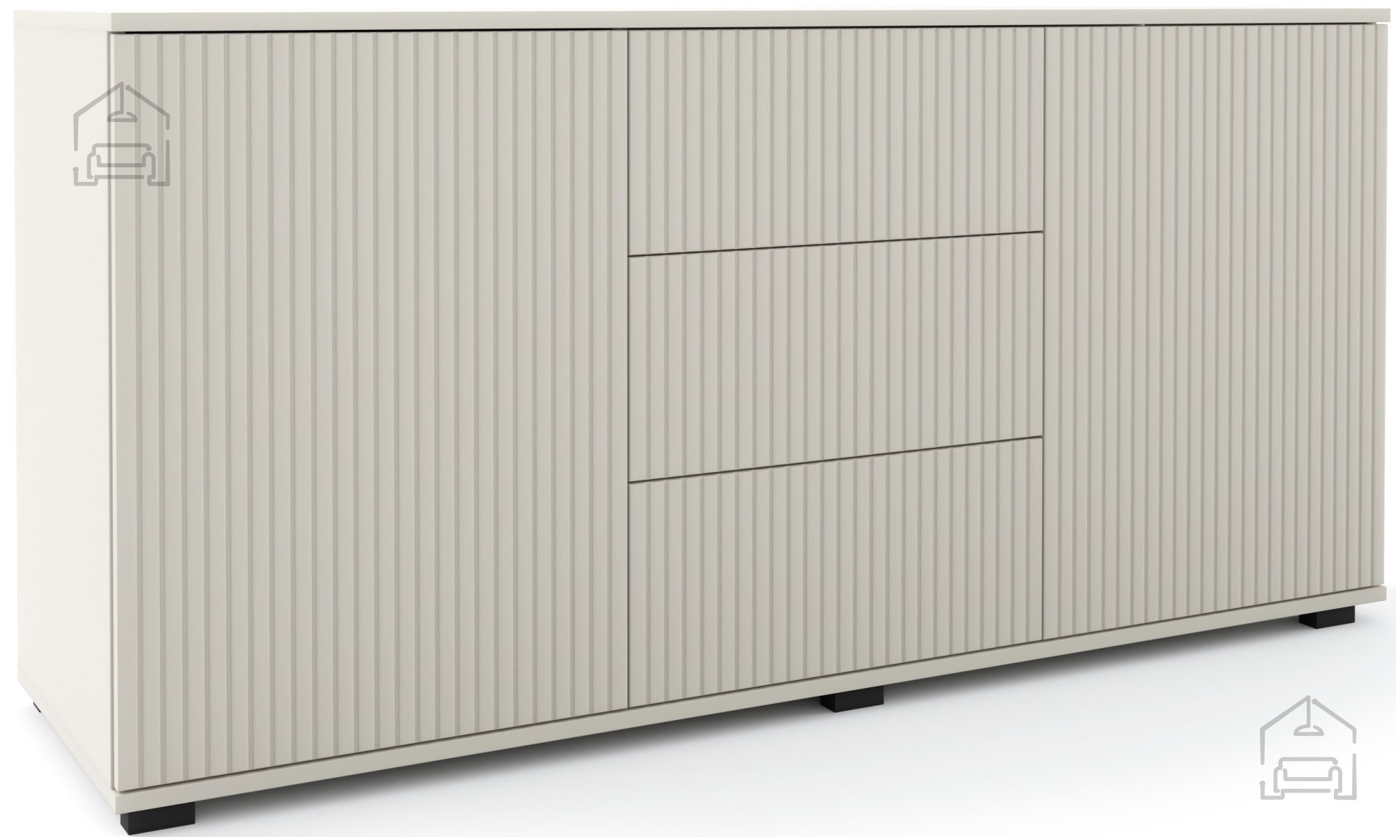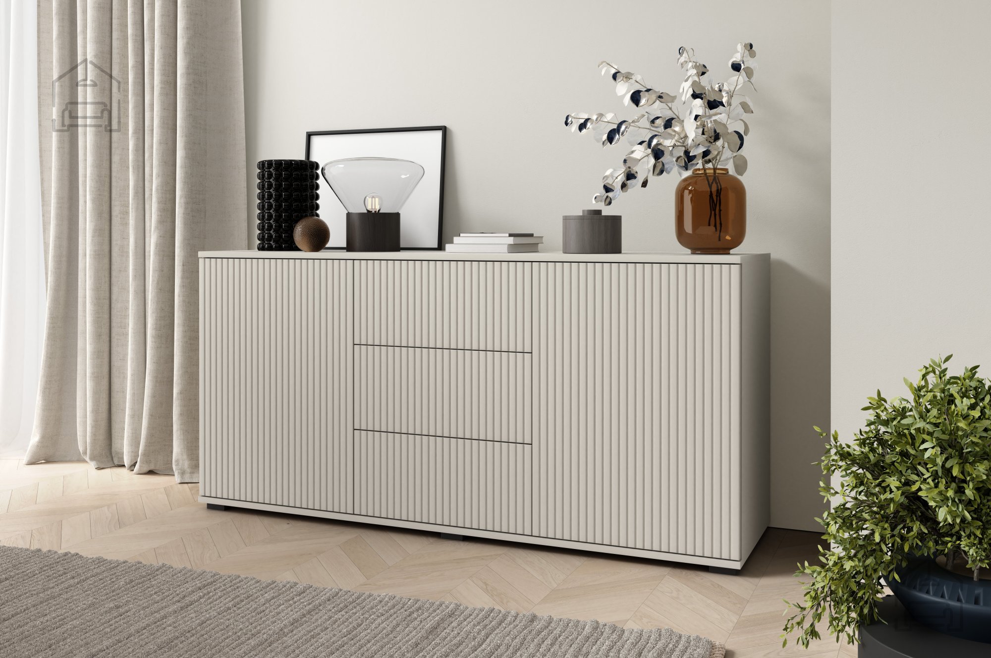Ena od značilnosti komode Agnes so ryflowani fronti oziroma lamelne površine, ki dodajo teksturo in globino videzu. Tak detajl ustvarja občutek dinamike in svetlobne igre, kar pohištvo vizualno obogati. Kombinacija gladkega korpusa in strukturiranih vrat poskrbi za zanimiv kontrast, ki je značilen za sodobne notranje trende.