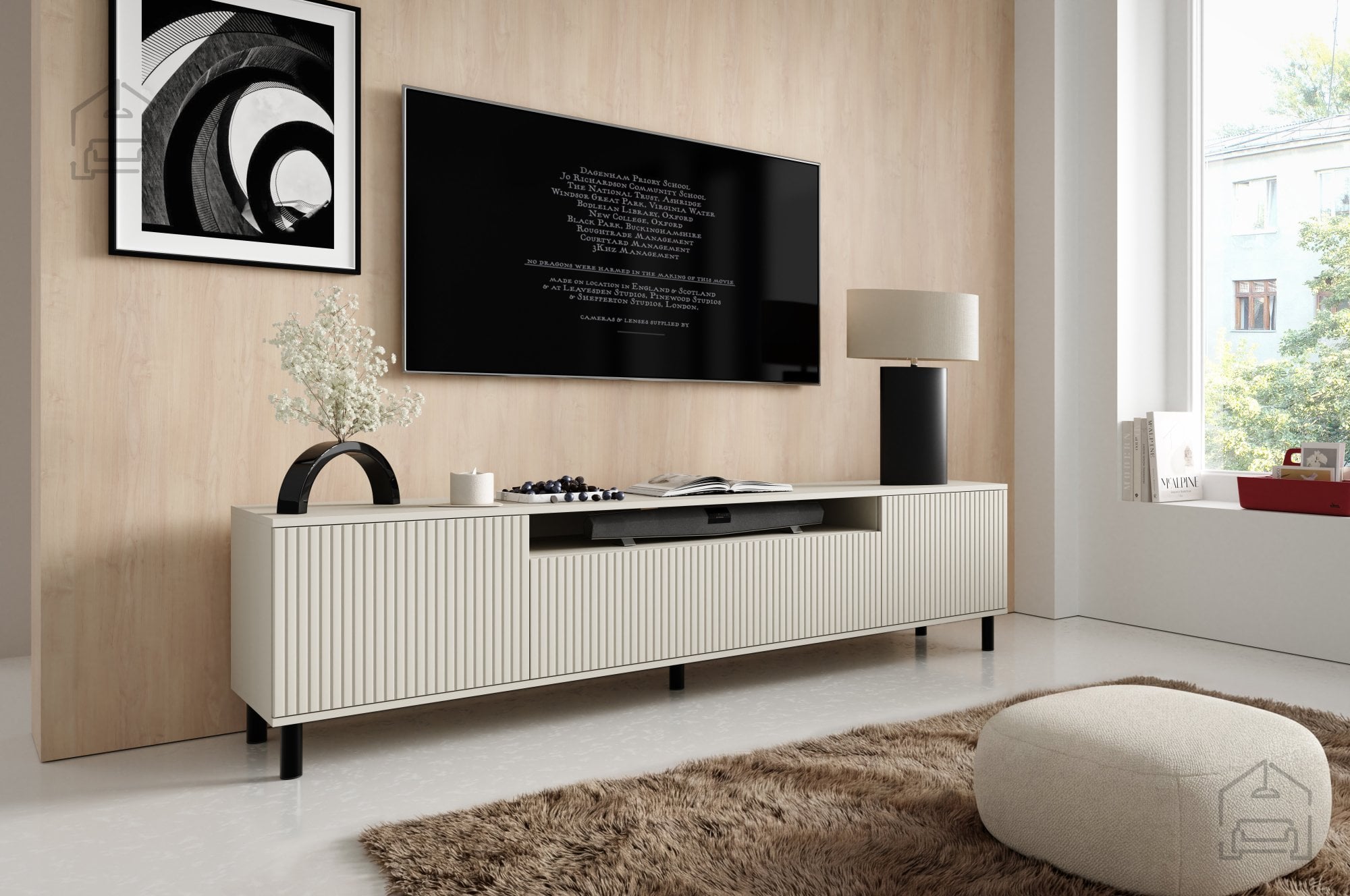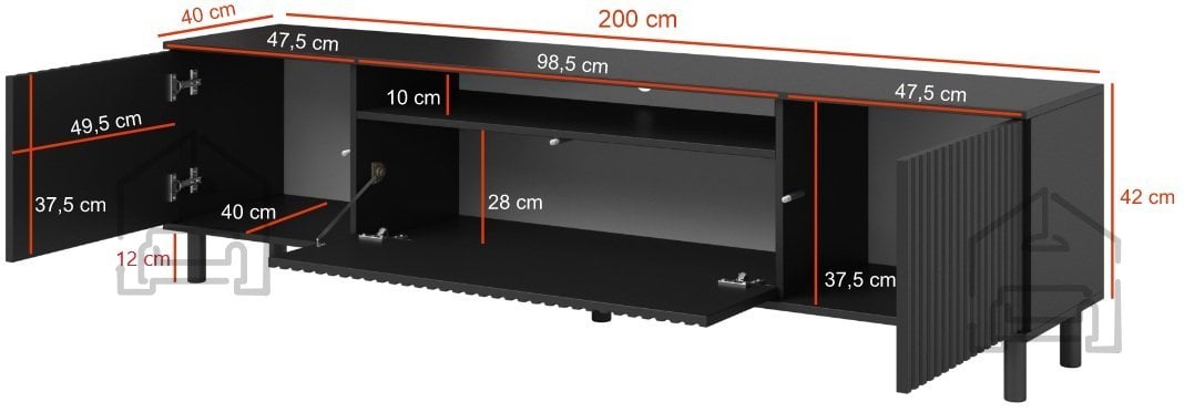 Komoda Agnes omogoča nadgradnjo z dodatnim 2-točkovnim belim LED osvetlitvenim sistemom, ki poudari njeno obliko in ustvari prijetno ambientalno svetlobo v prostoru. Osvetlitev lahko uporabite za poudarjanje dekorativnih elementov ali kot diskretno večerno svetlobo v dnevnem prostoru. Zaradi svoje širine 200 cm je komoda primerna za televizorje večjih dimenzij, hkrati pa ponuja dovolj površine za dodatne predmete, kot so zvočniki, rože ali umetniški dodatki.