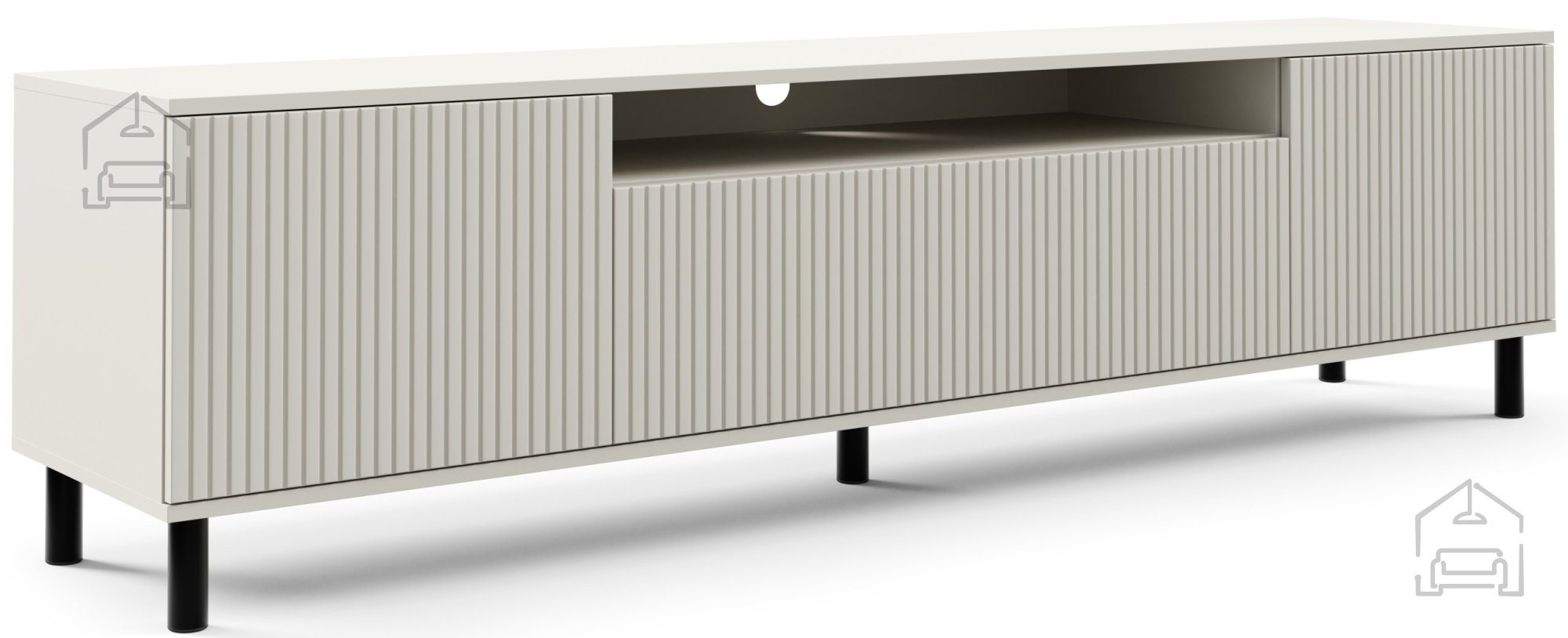 Barva kašmir je sodobna in topla nevtralna barva, ki se lepo zlije z različnimi notranjimi slogi – od minimalističnega do skandinavskega ali celo industrijskega. Površina komode je gladka in enostavna za vzdrževanje, MDF plošče pa omogočajo natančno obdelavo robov in čiste linije. Fronta komode je izdelana iz 18 mm debele MDF plošče z rahlo frezanimi detajli, ki dodajo subtilno teksturo in občutek kakovosti. Kovinske nogice v črni ali zlatni barvi poudarijo kontrast s toplo barvo korpusa in dodajo pridih modernosti.
