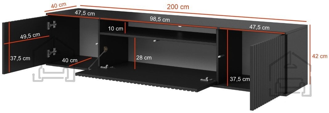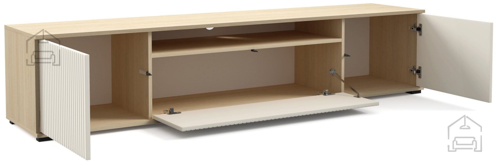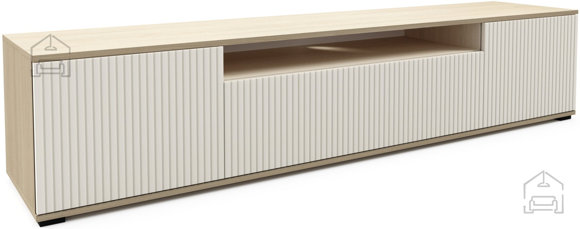 TV komoda Agnes nudi dovolj prostora za shranjevanje medijskih naprav, kablov, daljinskih upravljalnikov ali drugih vsakodnevnih predmetov. Zaradi širine 200 cm jo lahko uporabite kot osnovo za večje televizorje, hkrati pa na površini ostane prostor za dekorativne elemente, kot so vaze, knjige ali okvirjene fotografije. S svojo višino 42 cm omogoča udobno gledanje televizije iz kavča ali fotelja.