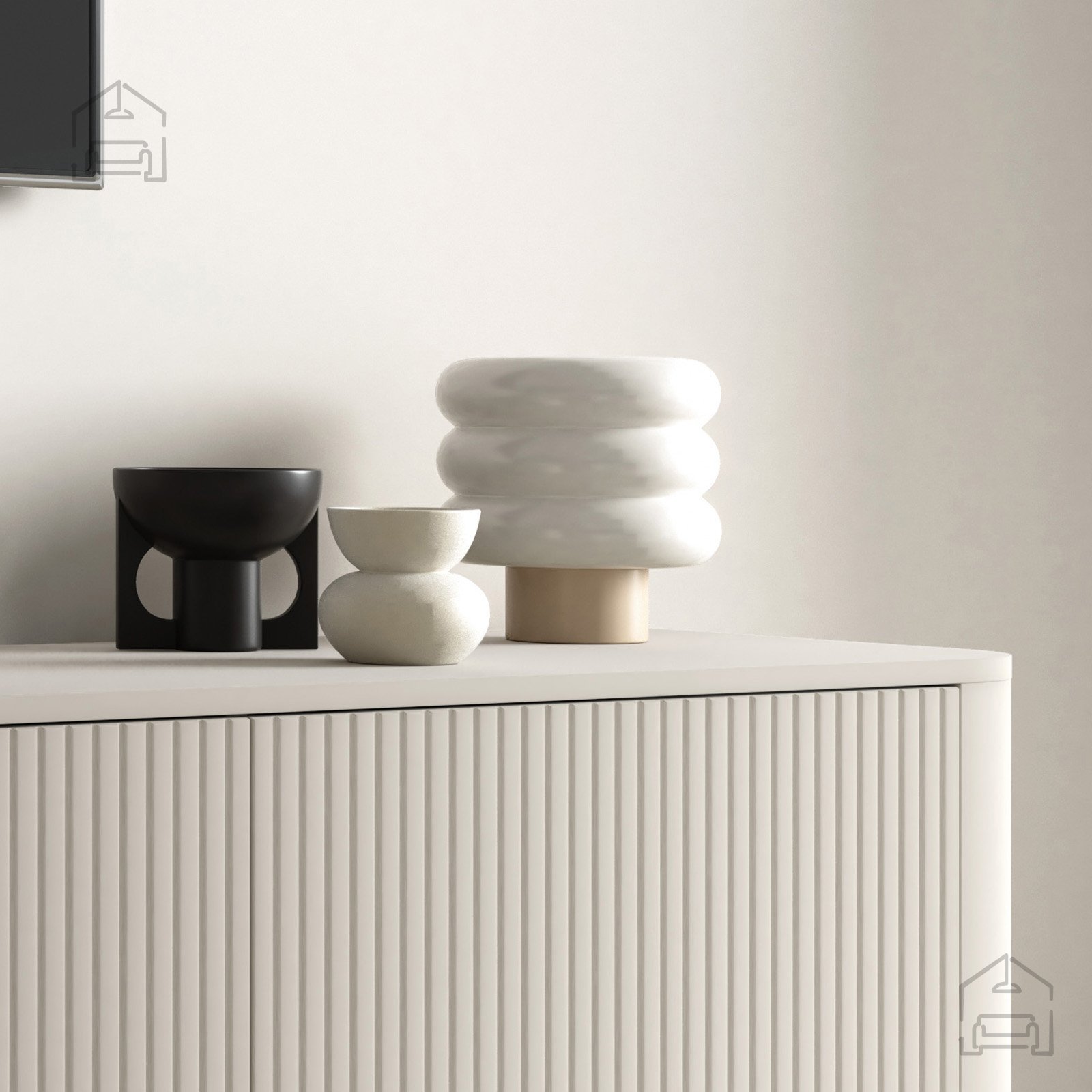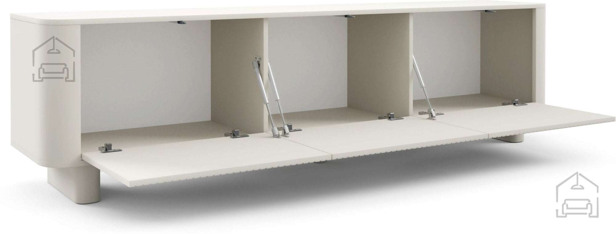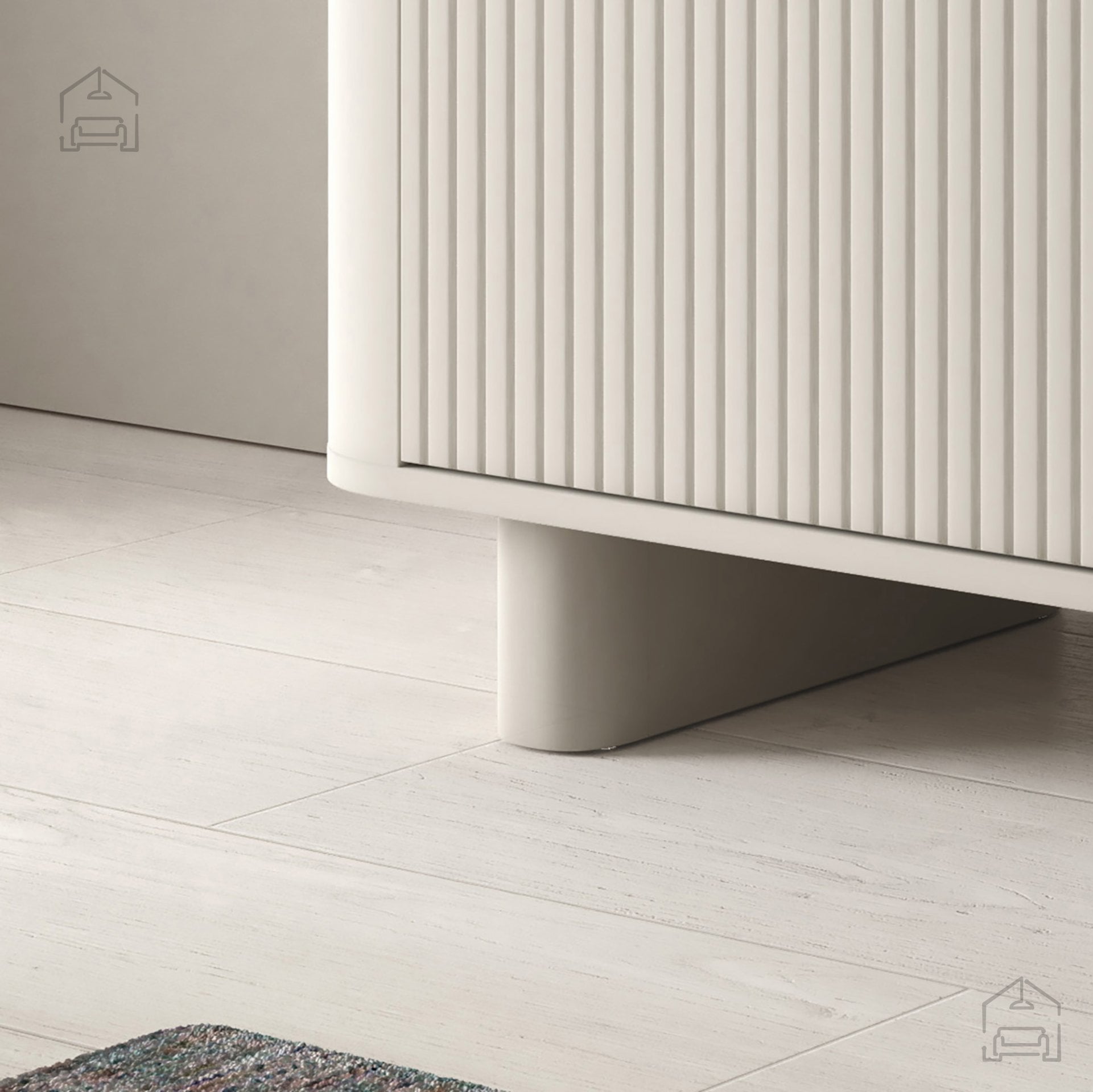 Barva kašmir spada med najbolj priljubljene nevtralne tone, ki se zlahka kombinirajo z različnimi materiali in barvnimi poudarki v notranji opremi. Površina TV komode Trenza ima subtilen mat učinek, ki ne odseva svetlobe in poudarja naravno teksturo laminirane plošče. Ryflowani oziroma rebrasti sprednji deli vrat ustvarjajo zanimivo igro svetlobe in senc, kar daje kosu pohištva dinamičen, a hkrati eleganten videz. Kombinacija gladkih površin in lamel ustvarja uravnoteženo oblikovno kompozicijo, ki izžareva sodoben značaj brez odvečnih detajlov.