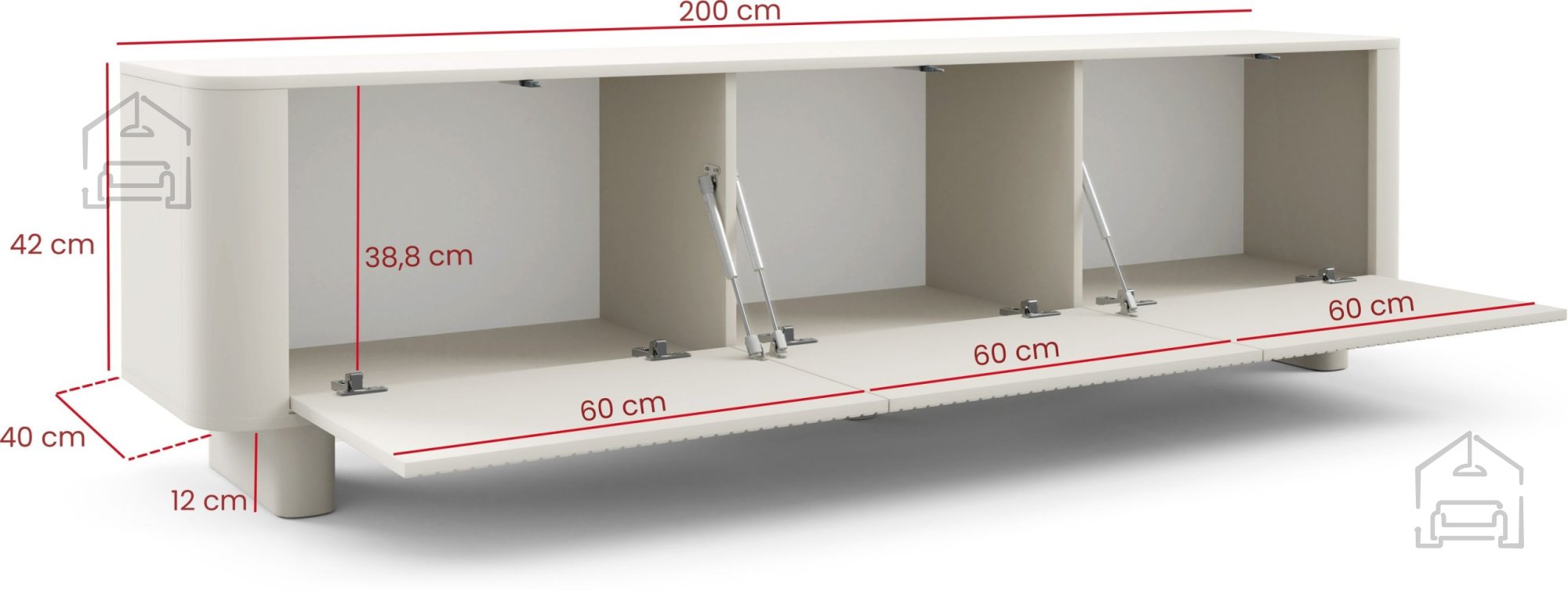 Zaradi svoje dolžine 200 cm ponuja TV komoda Trenza dovolj prostora za televizor, multimedijske naprave, knjige in dekorativne elemente. Notranjost je razdeljena na več zaprtih segmentov, ki omogočajo diskretno shranjevanje kablov, daljincev in drugih dodatkov. Takšna razporeditev ohranja urejen videz dnevnega prostora, hkrati pa omogoča enostaven dostop do vsebine.