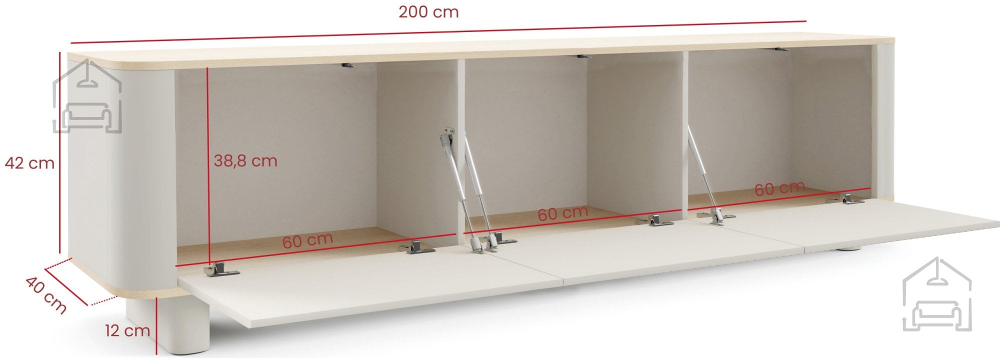 V notranjosti ponuja TV komoda Trenza dovolj prostora za shranjevanje različnih predmetov. Za vrati in v predalih je mogoče urediti prostor za multimedijsko opremo, dokumente ali druge osebne predmete. Sistem brez ročajev ohranja zunanjost čisto, notranjost pa praktično in pregledno. Zaradi premišljenih mer (200x40x54 cm) se komoda odlično prilega tako večjim kot manjšim dnevnim sobam, ne da bi delovala preobsežno.