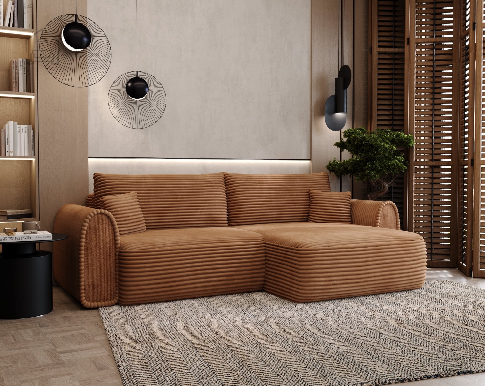 Kotna sedežna garnitura Nella predstavlja popolno ravnovesje med sodobnim dizajnom in vsakodnevno uporabnostjo. Primerna je za vse, ki iščejo udobno, elegantno in trpežno rešitev za svoj dom. Ne glede na to, ali jo uporabite kot glavni prostor za sprostitev ali kot dodatno ležišče, vas bo navdušila s svojo funkcionalnostjo in estetsko dovršenostjo.