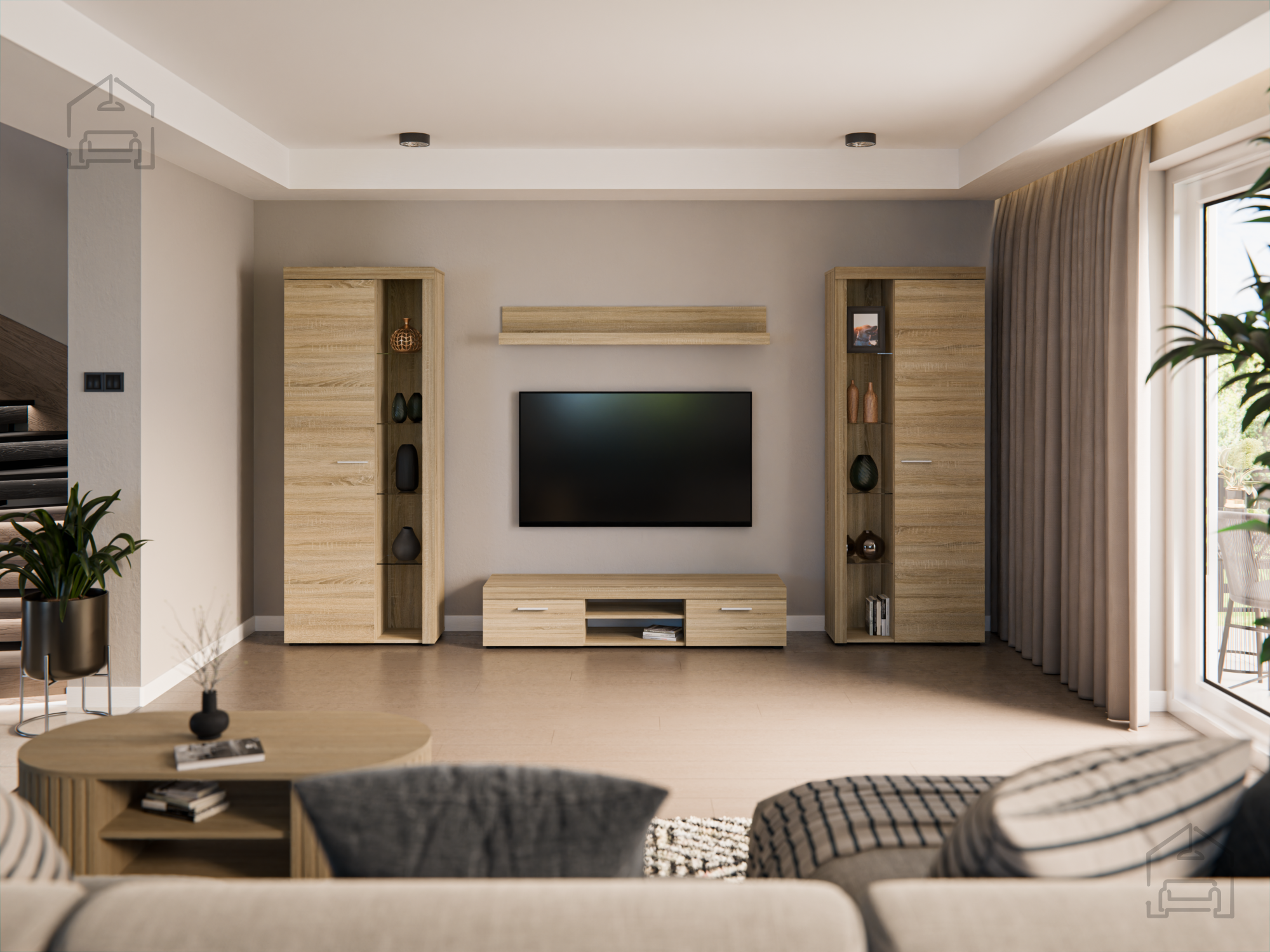 Barva hrast sonoma je med najbolj priljubljenimi v sodobnem pohištvenem oblikovanju, saj uspešno združuje naravni videz lesa z nevtralnimi toni, primernimi za različne barvne sheme prostora. V kombinaciji z mehko osvetlitvijo ali kontrastnimi dodatki, kot so črne kovinske noge, svetli tekstil ali stekleni detajli, regal Rumba XL pridobi še izrazitejšo vizualno globino. Topel odtenek lesa spodbuja občutek domačnosti in sproščenosti, zato se regal odlično znajde tako v dnevni sobi kot tudi v sobi za goste ali večnamenskem prostoru, kjer želimo ustvariti prijetno atmosfero.
