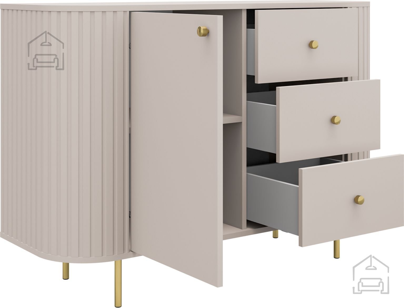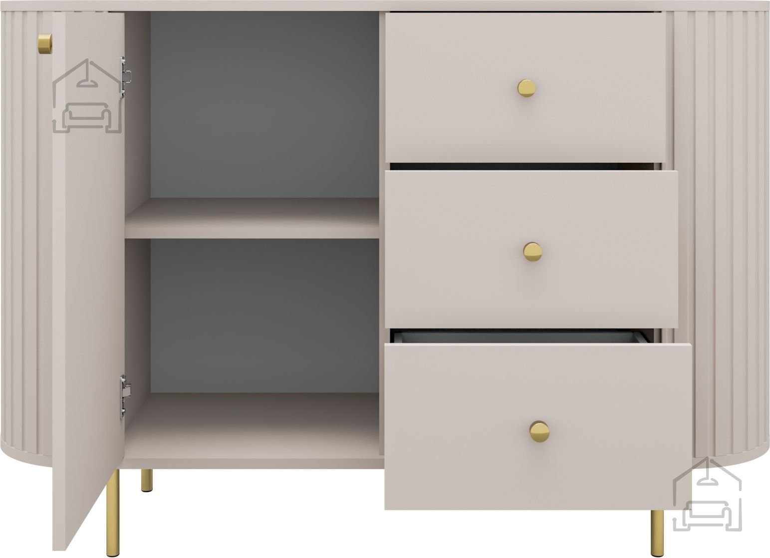 Peščeno bež odtenek ustvarja občutek topline in miru, ki se odlično ujema z naravnimi toni lesa, belimi stenami ali kovinskimi poudarki. Komoda Ovalio se zaradi nevtralne barve lepo zlije z različnimi notranjimi slogi – od minimalističnega do skandinavskega ali celo rustikalnega. Površina iz laminirane plošče je prijetna na dotik, obenem pa odporna proti praskam in enostavna za čiščenje. To pomeni, da bo komoda dolgo ohranila svež in urejen videz.