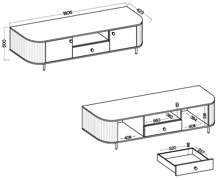 RTV komoda 2F1S Ovalio je zasnovana tako, da omogoča praktično shranjevanje in estetsko organizacijo zabavne elektronike ter dodatkov. Ima dva prostorna predala z vratci (2F) in en sredinski predal (1S), kar omogoča enostavno ločevanje kablov, daljincev, zvočnih naprav ali drugih pripomočkov. Zunanja dolžina komode znaša 180,6 cm, globina 42,3 cm in višina 50 cm – dimenzije, ki omogočajo optimalno razporeditev prostora tako v manjših kot večjih dnevnih sobah.