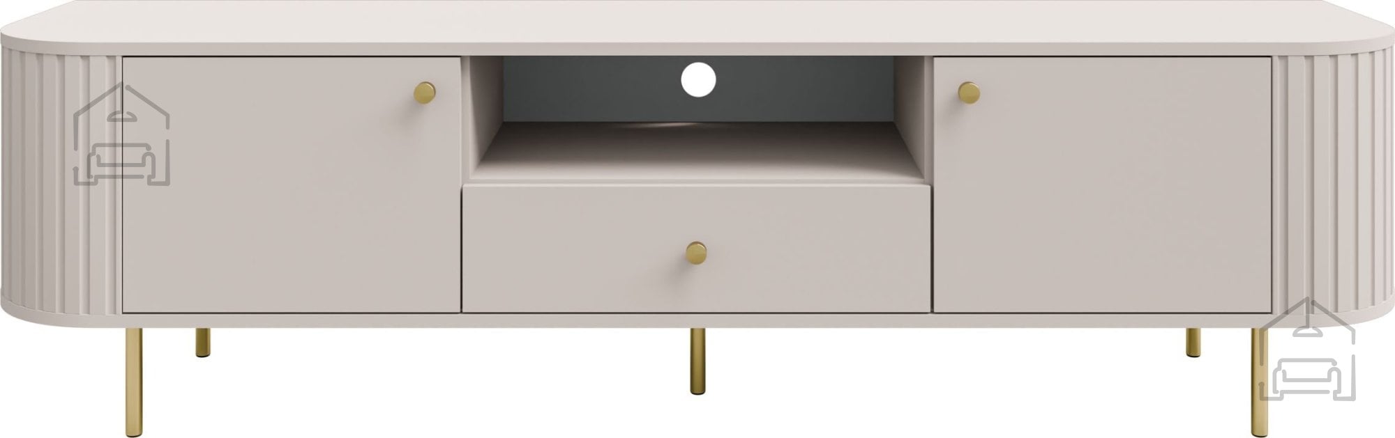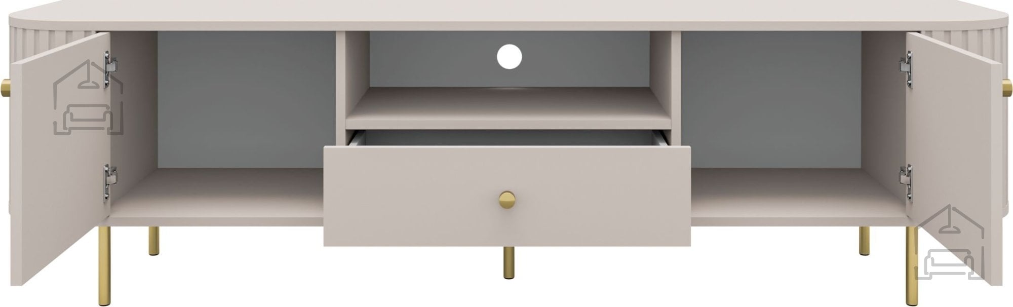 Peščeno bež barva se lepo ujema z lesenimi tlemi, svetlimi stenami ali tkaninami v toplih tonih. Komoda deluje kot osrednji element dnevne sobe, ob katerem lahko uredite urejen kotiček za televizor, dekorativne elemente ali knjige. S svojim brezčasnim videzom in nevtralno barvo se enostavno vključi v različne slogovne koncepte, zato je vsestranska izbira za sodobna stanovanja in hiše.