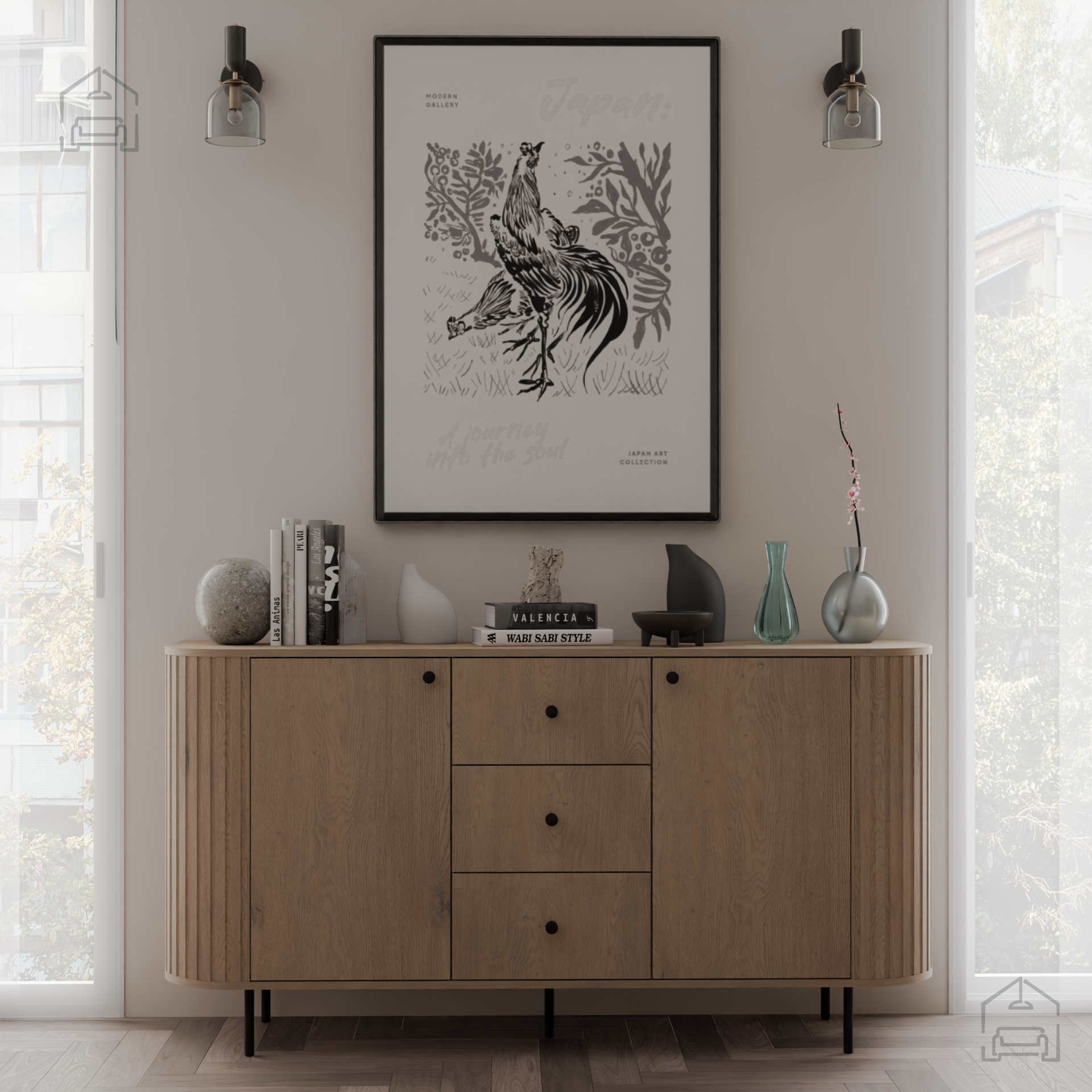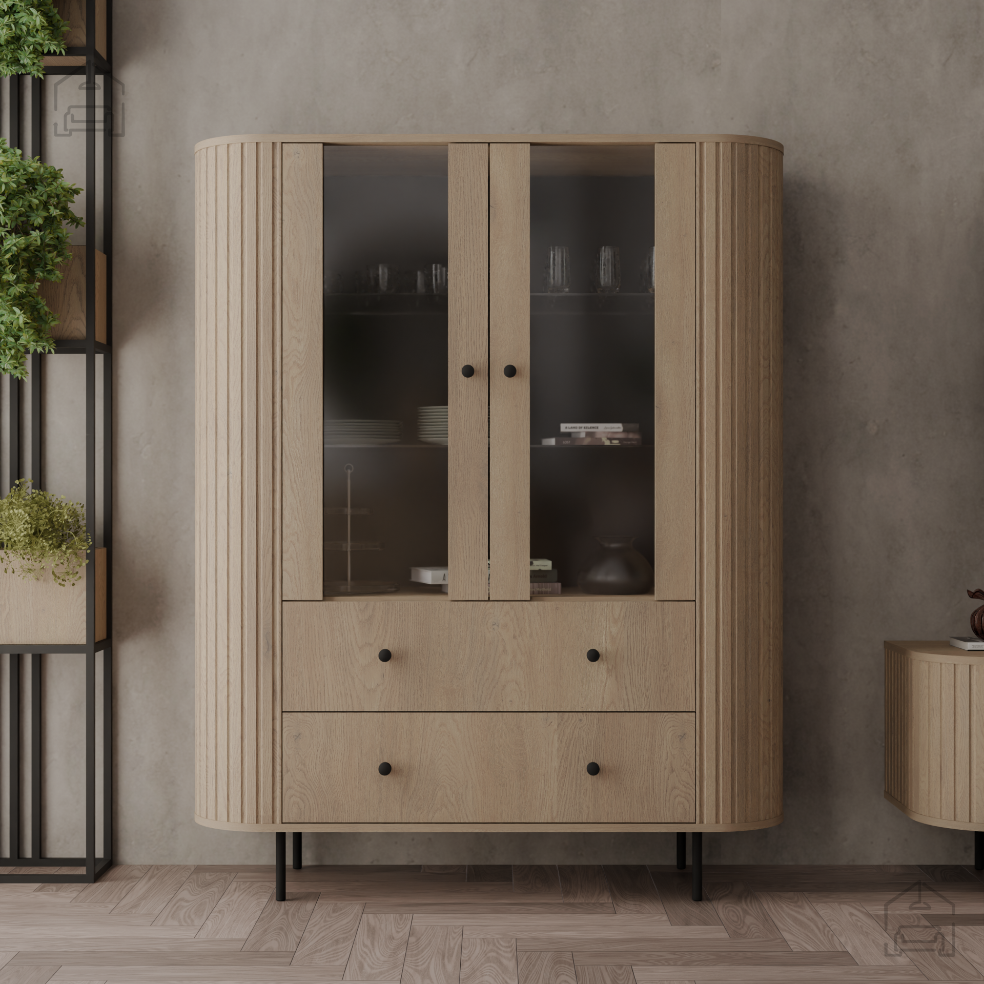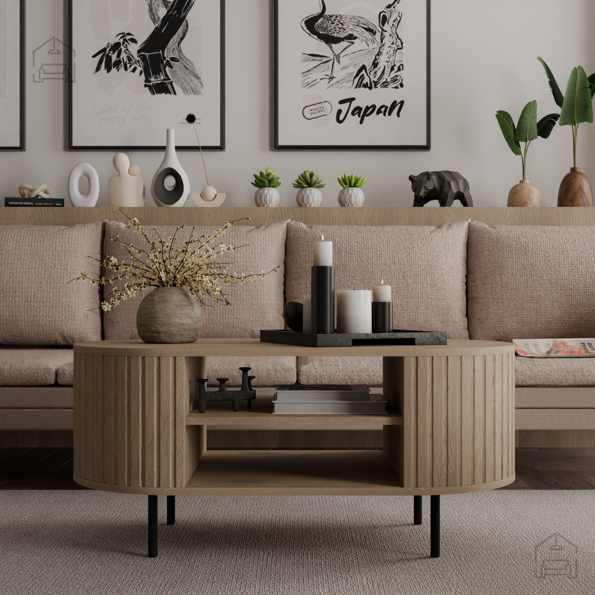 Topla bež barva z rahlimi lesnimi vzorci cremona hrasta ustvarja naraven videz prostora. Takšna barvna kombinacija se lepo poda k svetlim stenam, sivim ali bež tekstilom in drugim lesenim površinam. Kreira občutek prostornosti in svetlobe, zato je komplet Ovalio odlična izbira za manjše dnevne sobe ali stanovanja, kjer je pomembno, da prostor deluje odprto in zračno.