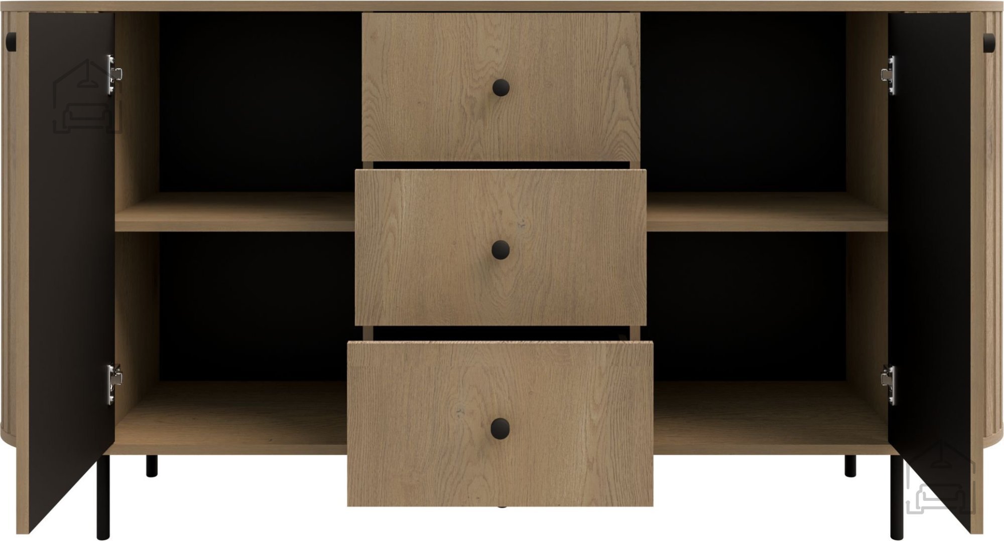 Komoda meri 164,6×42,3×85,4 cm, kar omogoča optimalno izrabo prostora. Njena struktura je razdeljena na dva prostorna predala z vratci (2F) in tri priročne predale (3S), kar omogoča učinkovito organizacijo različnih predmetov. Zgornja površina komode ponuja dovolj prostora za dekorativne elemente, kot so fotografije, cvetlični aranžmaji ali svetila, hkrati pa ostaja stabilna in odporna na vsakodnevno uporabo. Zaradi uravnoteženih proporcev in čiste linije se komoda prilega številnim interierjem, ne da bi vizualno obremenila prostor.