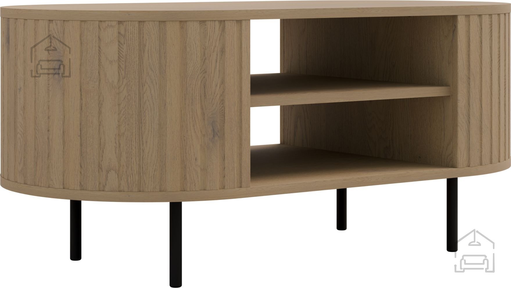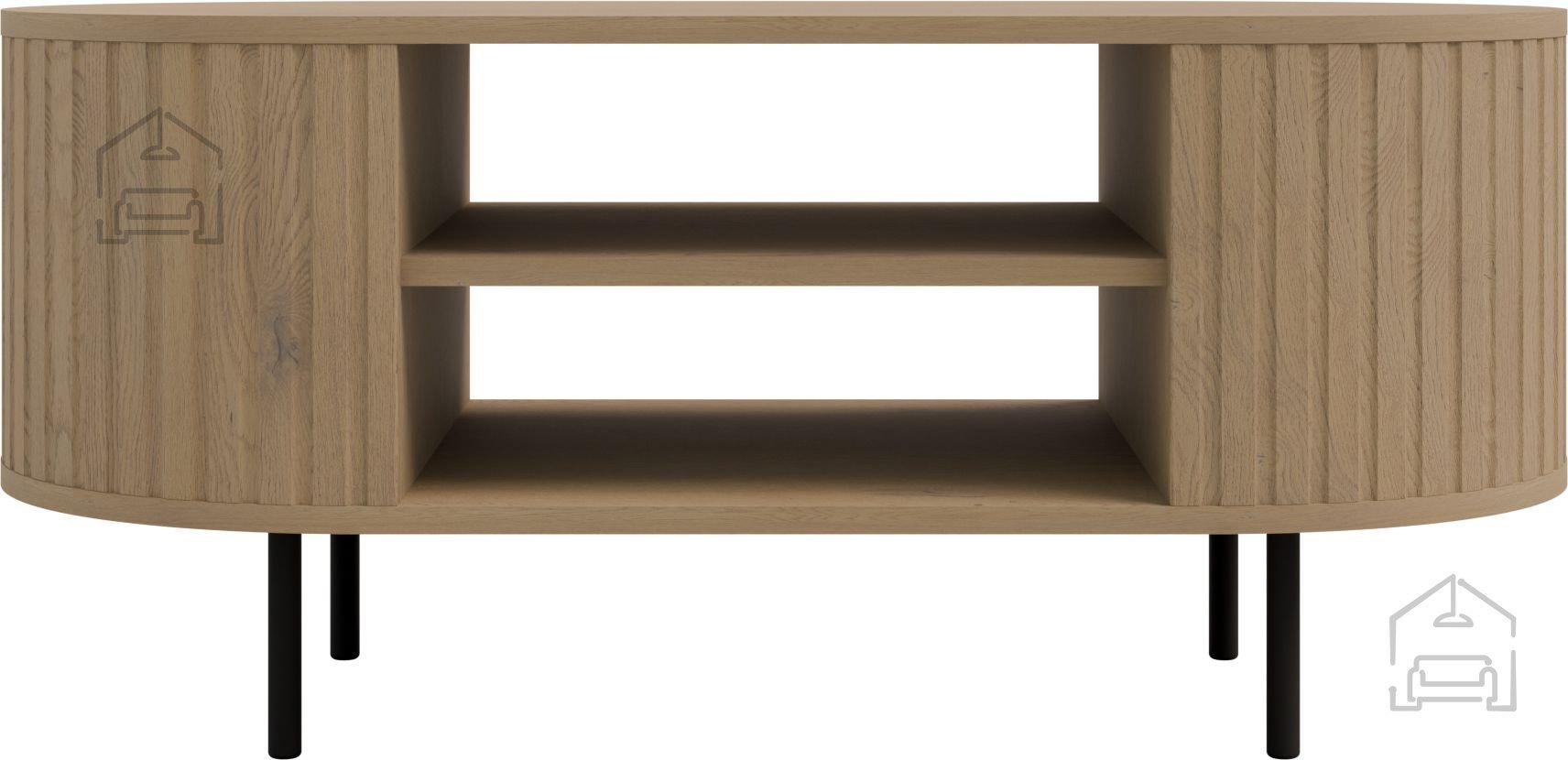 Gladke površine omogočajo hitro čiščenje z vlažno krpo, odporne so na običajne madeže in praske, ki nastanejo pri vsakodnevni uporabi. Zaradi kompaktne zasnove je miza primerna tako za manjša stanovanja kot tudi za prostorne dnevne sobe, kjer jo lahko uporabljate kot središčni kos pohištva ali dopolnitev obstoječe garniture. Njena univerzalna oblika se lepo ujema z oblazinjenim pohištvom, regali ali TV‑omaro v podobnem odtenku lesa.
