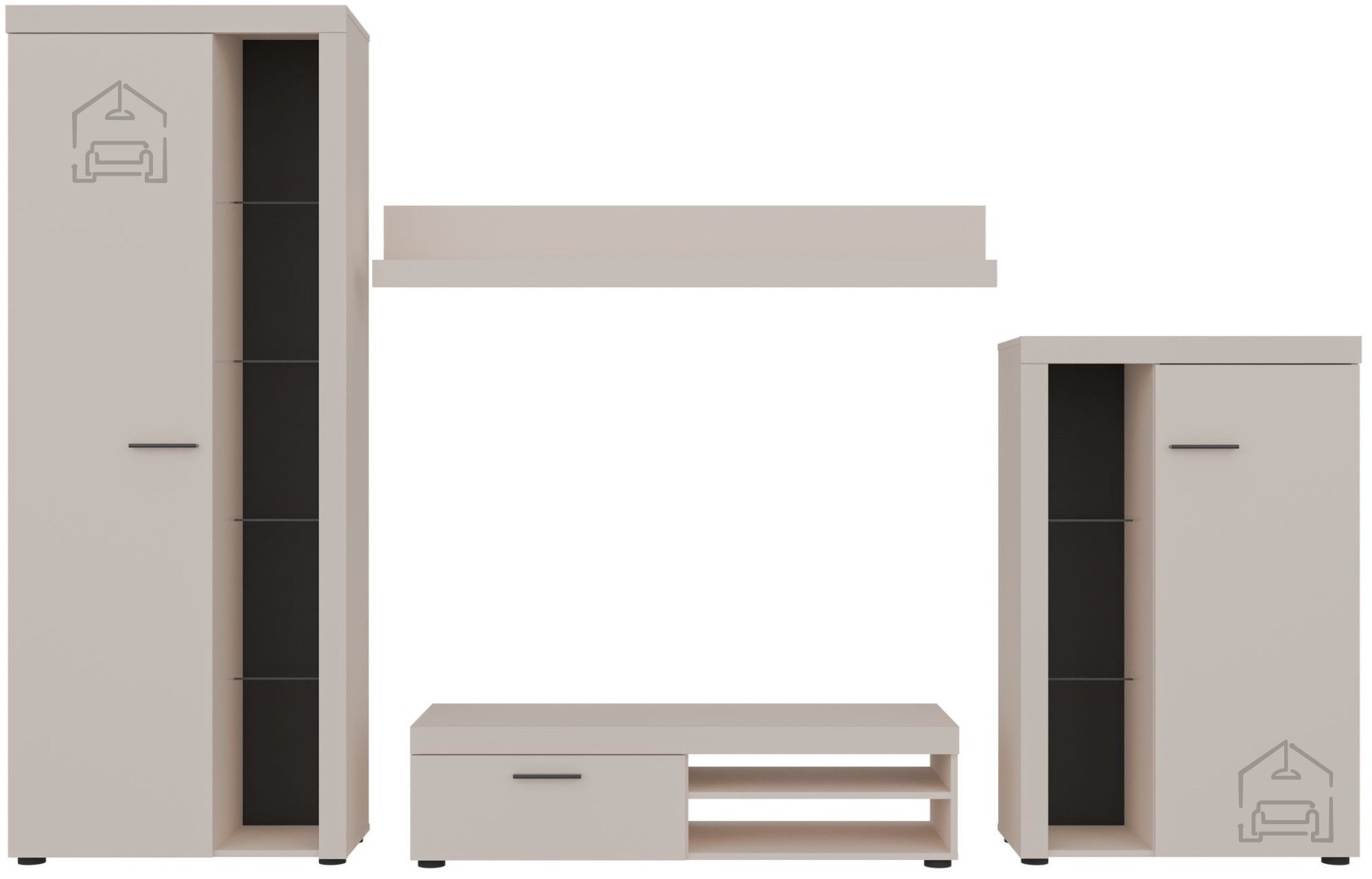 Osnova regala je laminirana plošča, ki zagotavlja visoko odpornost proti praskam, vlagi in vsakodnevni obrabi. Laminirana površina je enostavna za čiščenje in ohranja svojo barvo tudi po letih uporabe. Površina v odtenku peščeno bež ustvarja občutek svetlosti in prostornosti, zato je izdelek primeren tudi za manjše dnevne sobe. Kombinacija trpežnega materiala in skrbne obdelave omogoča dolgotrajno stabilnost ter enostavno montažo.