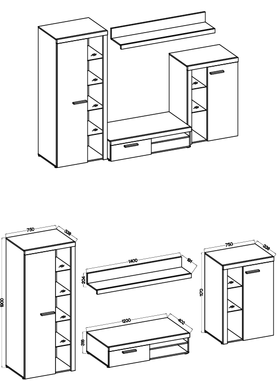 Celotne mere regala znašajo 270× 40,3 × 190 cm. Takšna širina omogoča prostorno postavitev televizorja, številnih dodatkov in dekorativnih predmetov, hkrati pa ohranja vizualno ravnotežje prostora. Višina 190 cm ponuja dovolj prostora za odprte police ali zaprte omarice, v katerih lahko shranite knjige, elektroniko ali druge osebne predmete. Globina 40,2 cm zagotavlja stabilnost konstrukcije in omogoča udobno postavitev tudi večjih naprav, kot so igralne konzole ali zvočni sistemi.