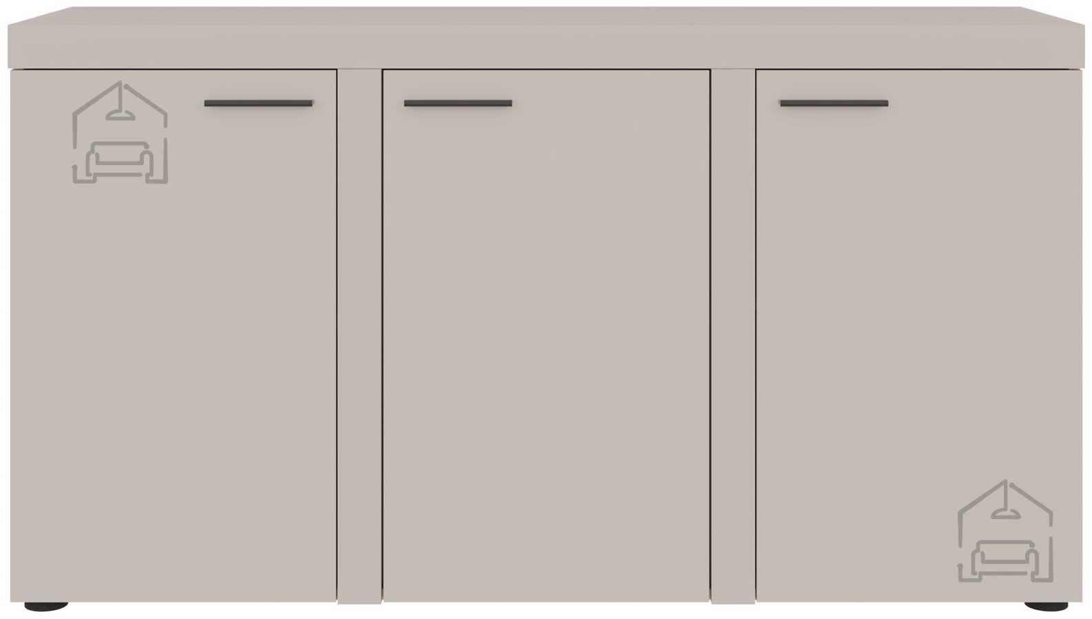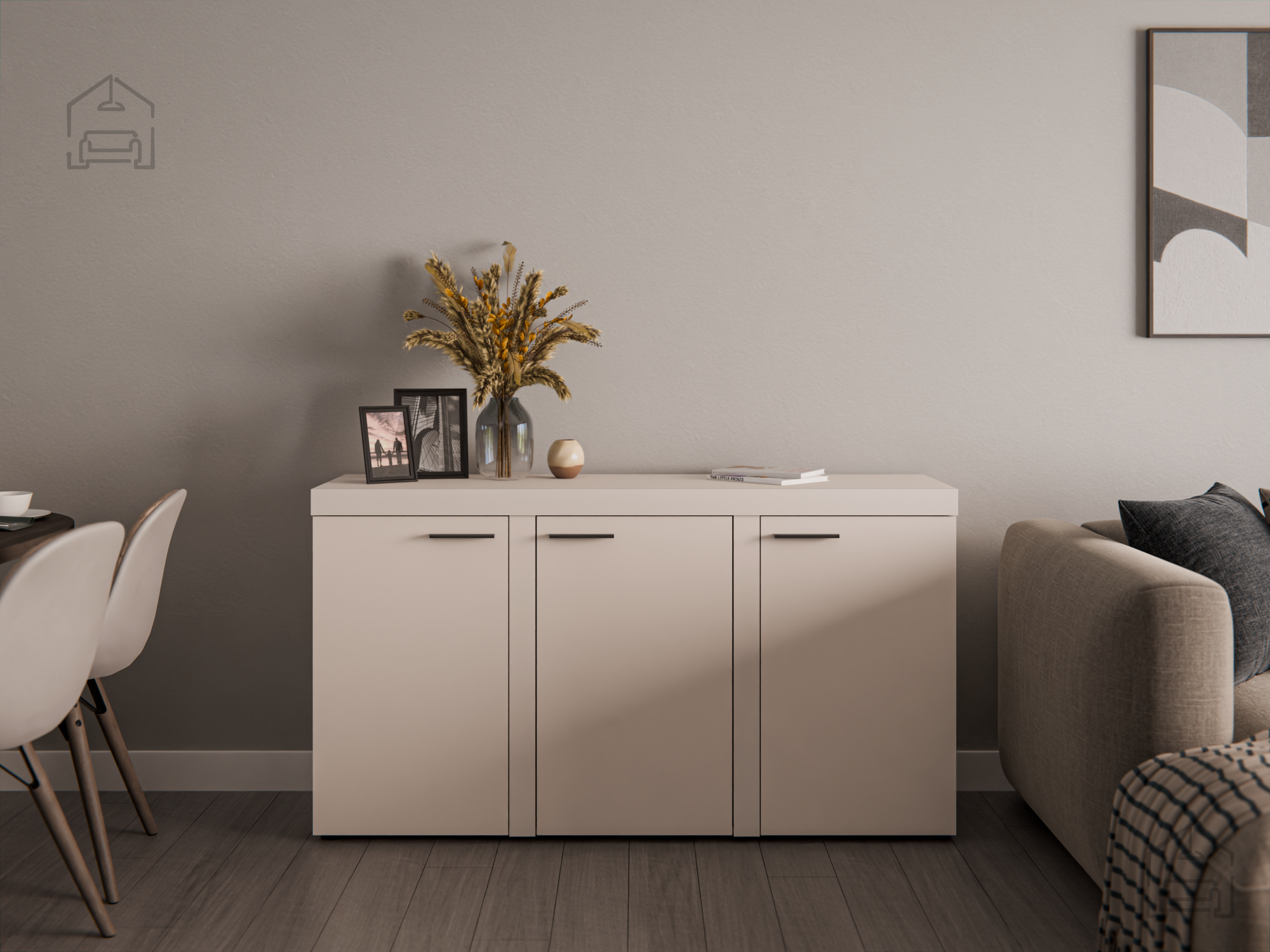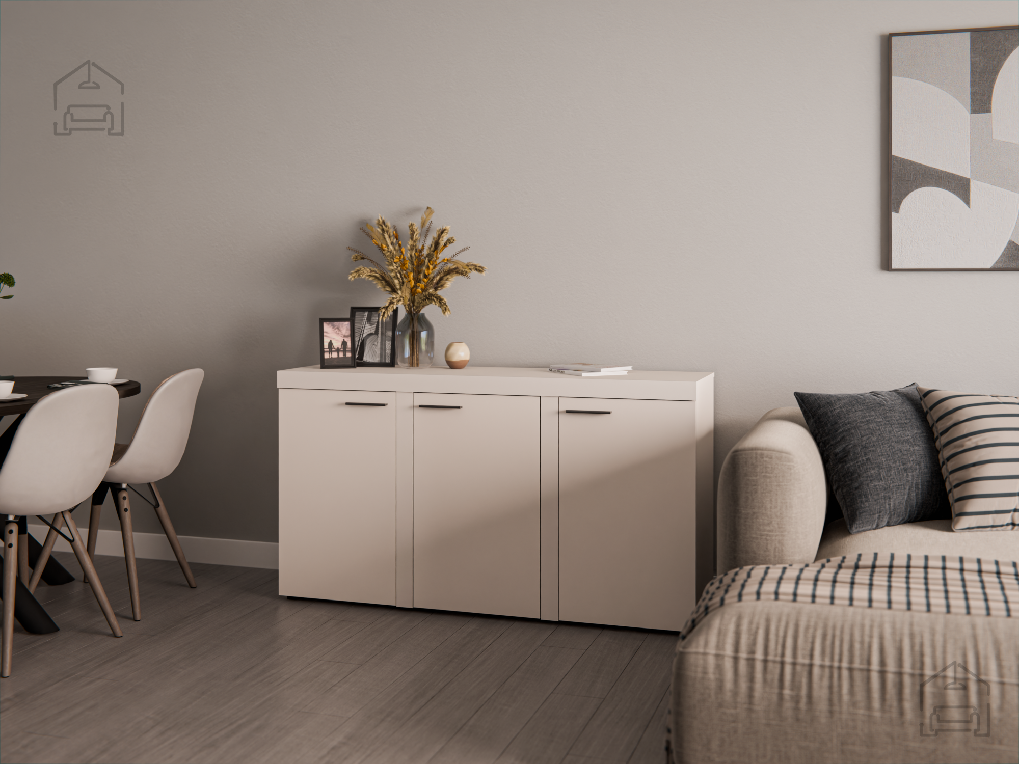Peščeno bež odtenek komode Rumba 3F ustvarja občutek topline in umirjenosti v prostoru. Njena barvna nevtralnost omogoča preprosto kombiniranje z drugimi kosi pohištva v svetlih ali temnejših tonih. Površina iz laminirane plošče ima naraven videz in gladko teksturo, kar prispeva k estetskemu vtisu urejenosti in čistosti. Zaradi preprostih linij in minimalistične zasnove se komoda lepo ujema tako z modernimi kot tudi klasično opremljenimi prostori.