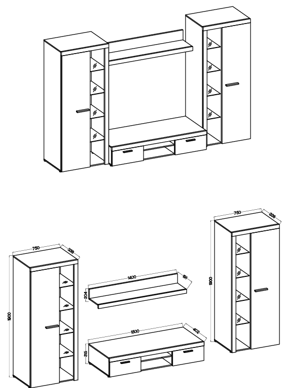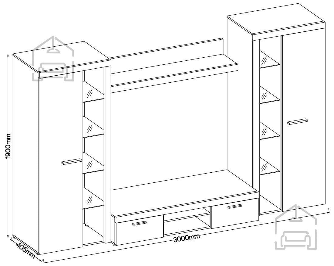 Celotne dimenzije regala znašajo 300x40,5x190 cm, kar pomeni, da ponuja veliko prostora za televizor, multimedijske naprave, knjige, dekoracijo in druge osebne predmete. Zaradi svoje višine in širine omogoča pregledno razporeditev elementov in hkrati ohranja urejen videz dnevnega prostora. Globina 40,5 cm zagotavlja stabilno postavitev televizorja in drugih naprav, ne da bi regal zavzemal preveč prostora v sobi.