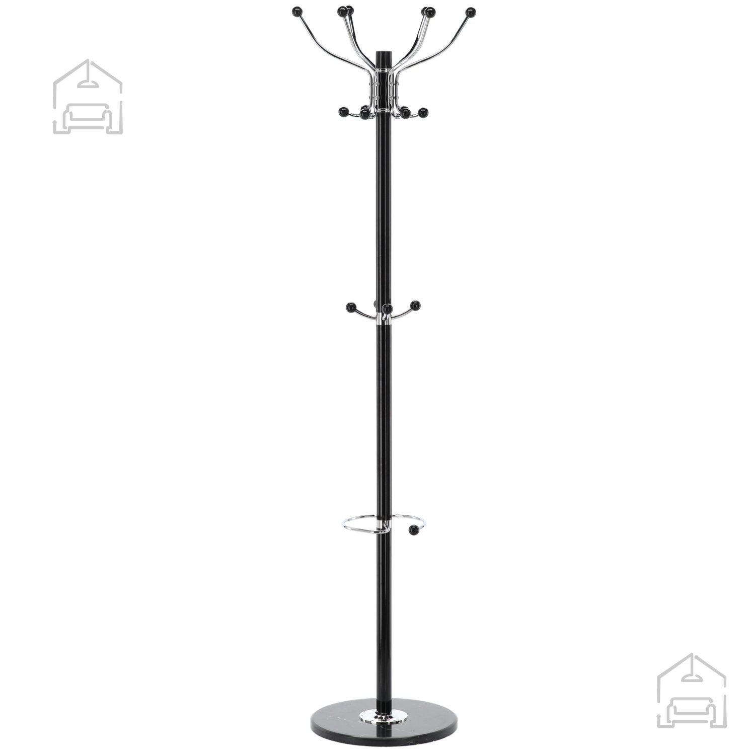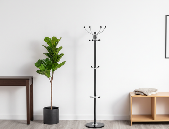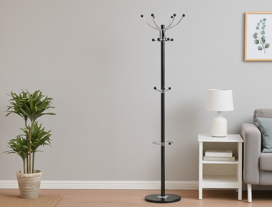 Obešalnik Kazer se s svojo preprosto, a izrazito obliko odlično poda v sodobno notranjo opremo. Črna barva se zlahka ujame z različnimi barvnimi shemami, zato ga lahko postavite tako v svetle kot temnejše prostore. Marmorna osnova deluje kot diskreten, a prestižen poudarek, ki daje izdelku poseben značaj. Zaradi višine 178 cm omogoča obešanje dolgih plaščev brez stika s tlemi, kar ohranja oblačila čista in nepoškodovana.