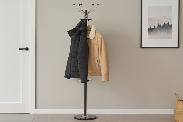 Kljub stabilni marmorni osnovi je obešalnik Kazer enostaven za prestavljanje po prostoru. Tehta 7,94 kg, kar pomeni, da ga lahko po potrebi hitro premaknete brez večjega napora. Samostoječa zasnova omogoča postavitev kjerkoli – ob vhodnih vratih, v garderobi ali ob delovni mizi. Ker ni potreben zidni nosilec ali montaža v tla, je idealen za najemna stanovanja ali poslovne prostore, kjer ne želite trajnih posegov.