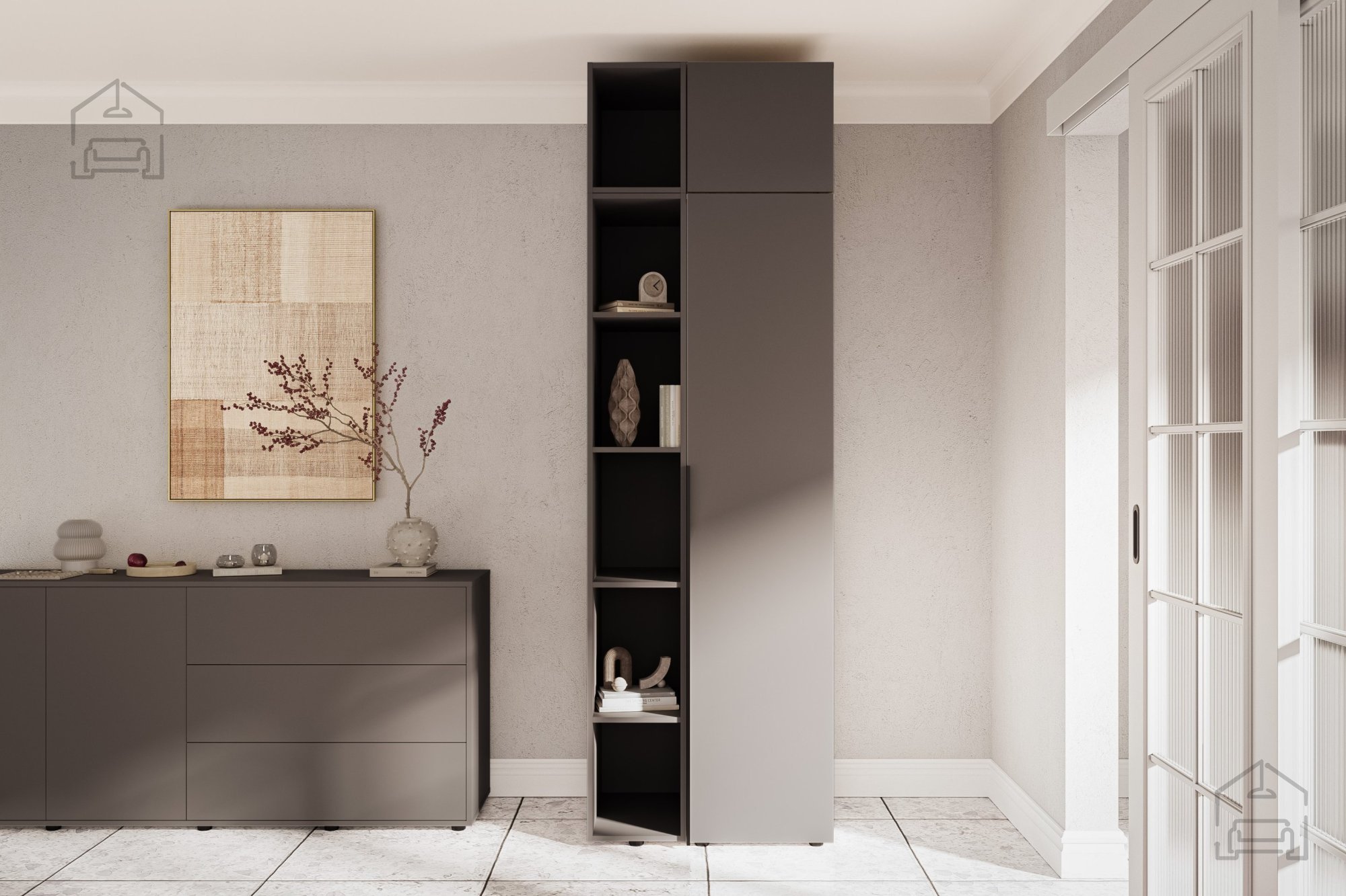 Če iščete pohištvo, ki združuje sodoben dizajn, praktičnost in prilagodljivost, potem je ta modularna kolekcija popolna izbira za vaš dom. S svojo grafitno sivo barvo in minimalističnim videzom se zlahka ujema z različnimi stili notranje opreme – od modernega urbanega stanovanja do elegantno zasnovane dnevne sobe. Zaradi premišljene zasnove in kakovostnih materialov je to pohištvo trajna rešitev, ki bo vašemu prostoru dodala red, toplino in prefinjenost.