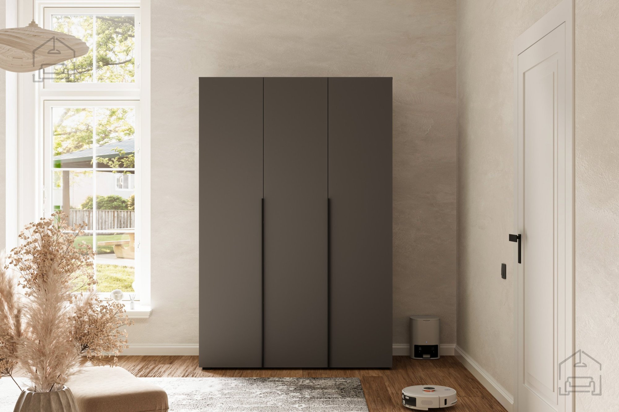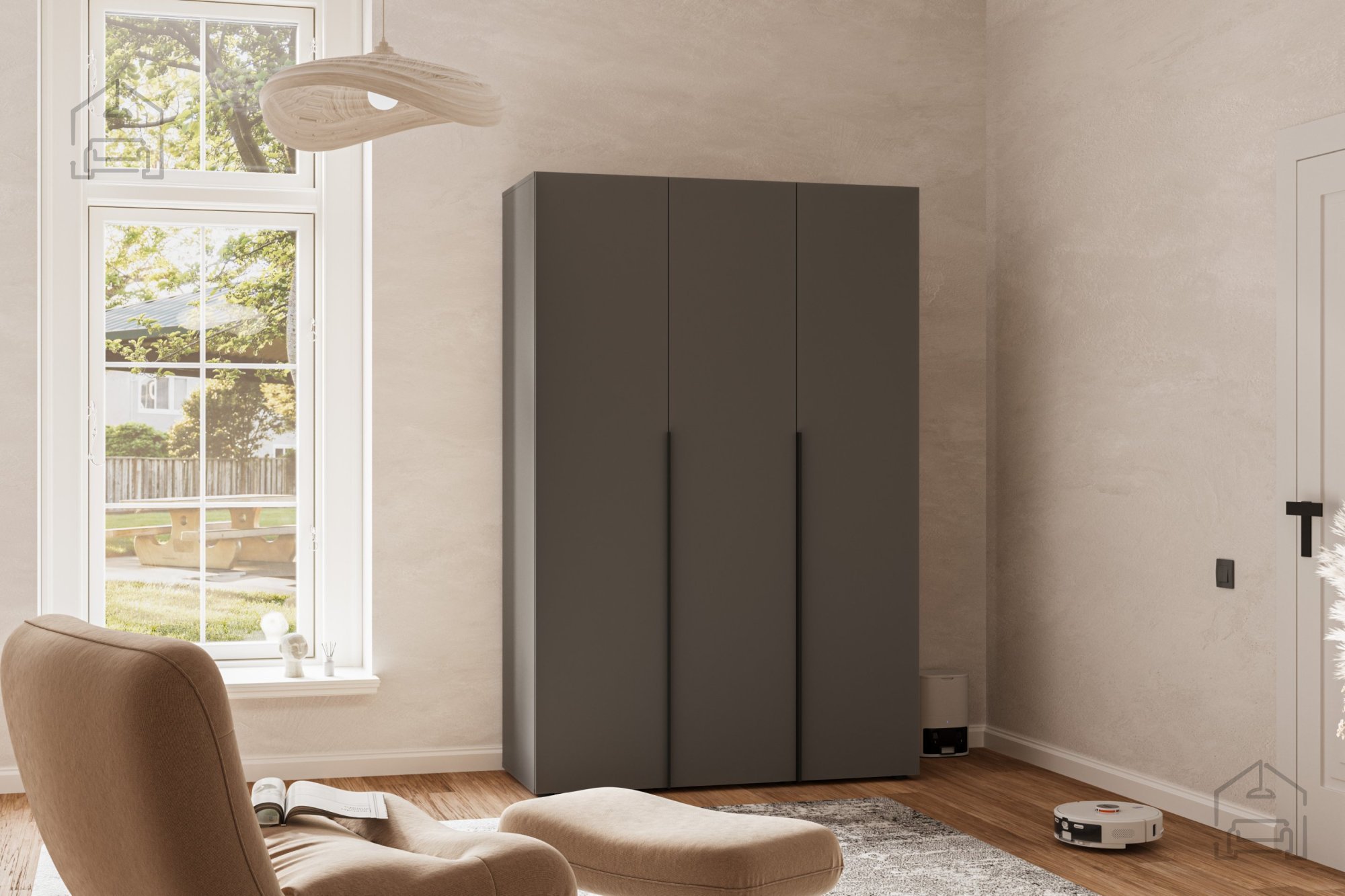 Izdelana je iz 16 mm laminirane plošče, ki zagotavlja trpežnost in enostavno vzdrževanje. Laminirana površina je odporna na praske, vlago in vsakodnevno uporabo, kar pomeni, da bo pohištvo dolgo ohranilo svoj izviren videz. Kovinski ročaji dodajo pridih elegance, medtem ko skrite nastavljive noge omogočajo stabilnost tudi na nekoliko neravnih tleh. Grafitno siva barva je vsestranska in se lepo poda k svetlim ali temnim notranjim tonom, zato je odlična izbira za vsak ambient.