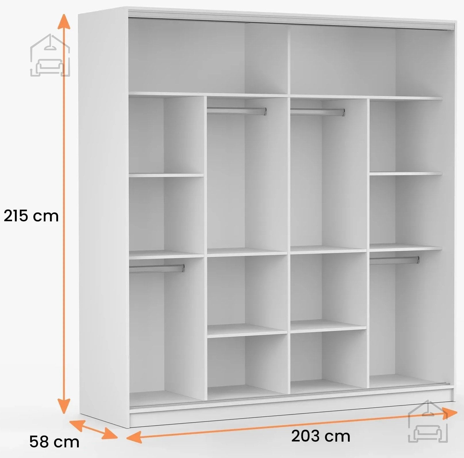 Notranjost garderobne omare je zasnovana tako, da uporabniku omogoča pregledno shranjevanje oblačil, obutve in dodatkov. Glede na širino 203 cm nudi dovolj prostora za osnovno garderobo, pri čemer so posamezni deli notranjosti prilagojeni za obešanje srajc, jaken ali oblek ter za zlaganje manjših kosov tekstila na police. Tovrstna razporeditev zagotavlja praktičnost in urejenost, ki olajša vsakodnevno izbiro oblačil.