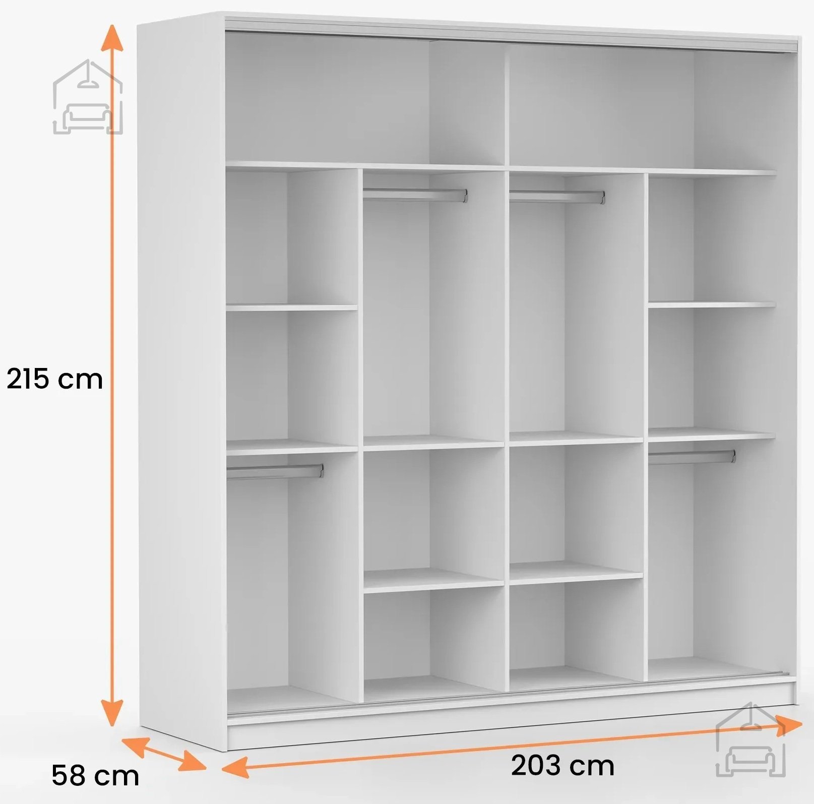 Te dimenzije omogočajo, da je omara Tokyo M hkrati prostorna in kompaktna. Višina 215 cm izkorišča vertikalni prostor, medtem ko širina 203 cm omogoča postavitev ob steno ali v nišo. Zaradi svoje globine 58 cm je primerna tudi za obešanje daljših oblačil, kot so plašči ali obleke, brez mečkanja tkanin.