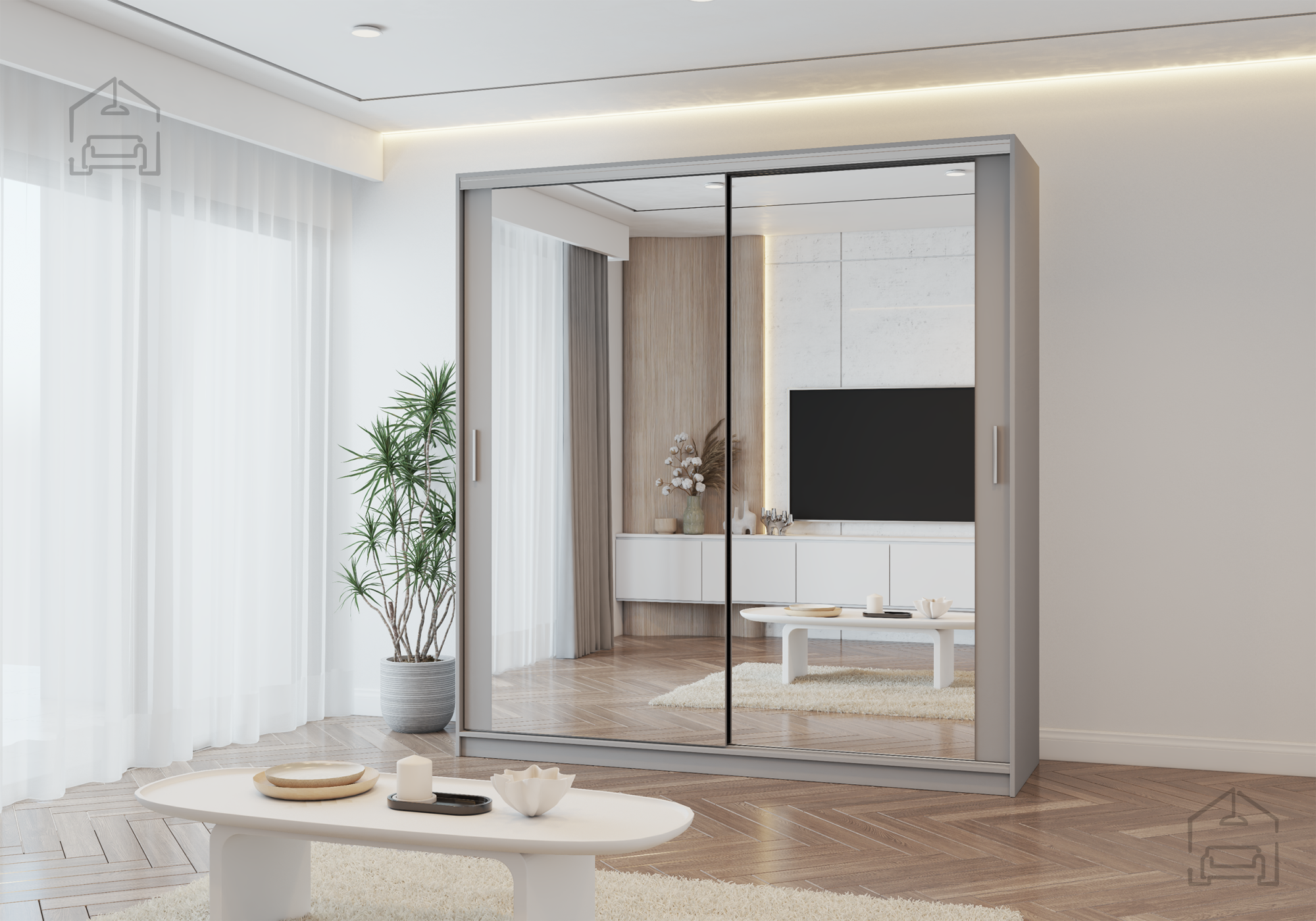 Garderobna omara z drsnimi vrati Tokyo M je popoln odgovor za vse, ki želijo združiti sodoben dizajn, praktičnost in kakovostno izdelavo. S svojo širino 203 cm, globino 58 cm in višino 215 cm ponuja dovolj prostora za vsakodnevna oblačila, modne dodatke ter druge osebne predmete, ne da bi pri tem zavzela preveč prostora v spalnici ali predsobi. Siva barva in čiste linije ustvarjajo uravnotežen videz, ki se enostavno ujema z različnimi notranjimi stili – od minimalističnega do klasičnega.