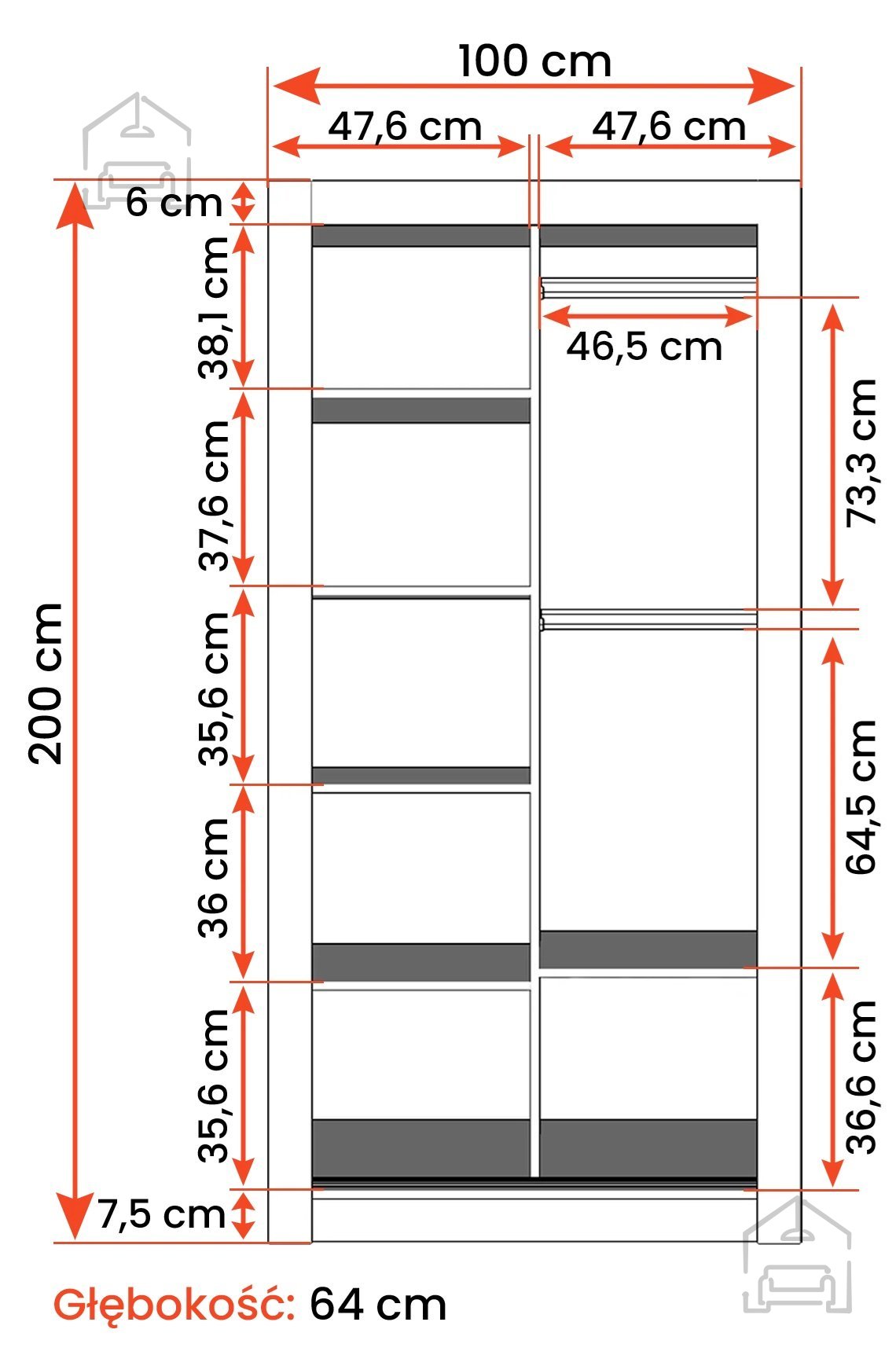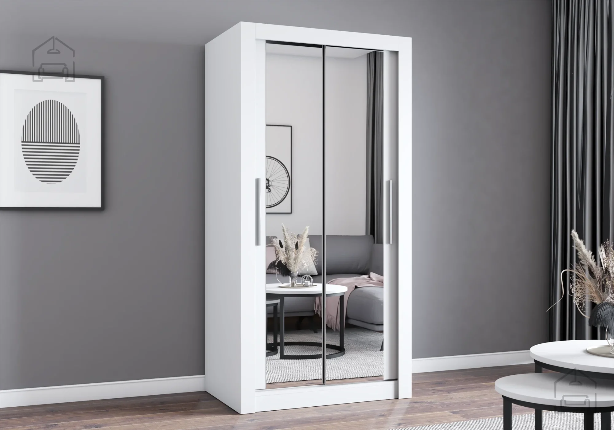 Omara Milan – Idżczak Meble je zasnovana z mislijo na preglednost in organizacijo. Notranjost nudi dovolj prostora za shranjevanje oblačil, posteljnine ali dodatkov. Prostorna notranja razporeditev omogoča kombinacijo polic in obešalnega dela, kar pomaga ohraniti red in preglednost. Zaradi drsnih vrat je dostop do vsebine hiter in enostaven, obenem pa površina vrat ostaja gladka in moderna.