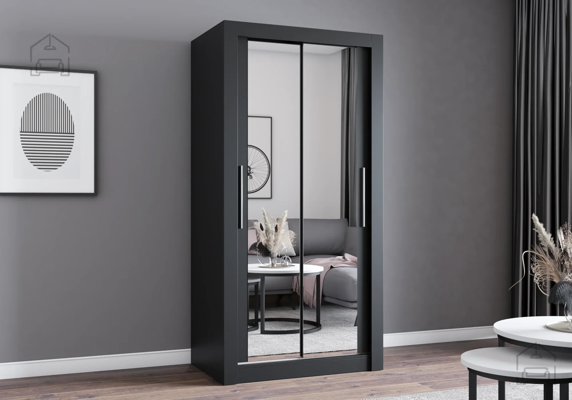Ta garderobna omara združuje sodoben dizajn, praktičnost in dolgotrajno kakovost v enem izdelku. S svojo elegantno črno barvo, čistimi linijami in funkcionalnimi drsnimi vrati je idealna izbira za tiste, ki želijo svoj prostor ohraniti urejen in estetsko dovršen. Proizvajalec Idžczak meble iz Poljske je znan po natančni izdelavi in uporabi kakovostnih materialov, zato je omara Milan trpežna in primerna za vsakodnevno uporabo v spalnici, predsobi ali garderobi.