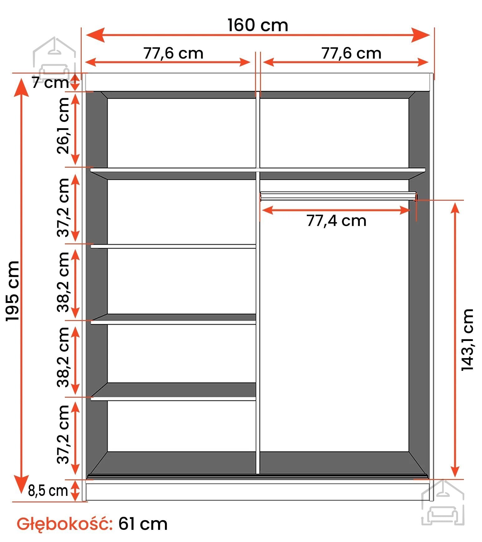 Dimenzije so premišljeno izbrane tako, da omara ponuja veliko prostora za shranjevanje, obenem pa ne deluje preveč masivno. Višina 195 cm omogoča, da v zgornjem delu shranite sezonska oblačila ali manj pogosto uporabljene predmete, medtem ko spodnji del zagotavlja dovolj prostora za vsakodnevno garderobo.