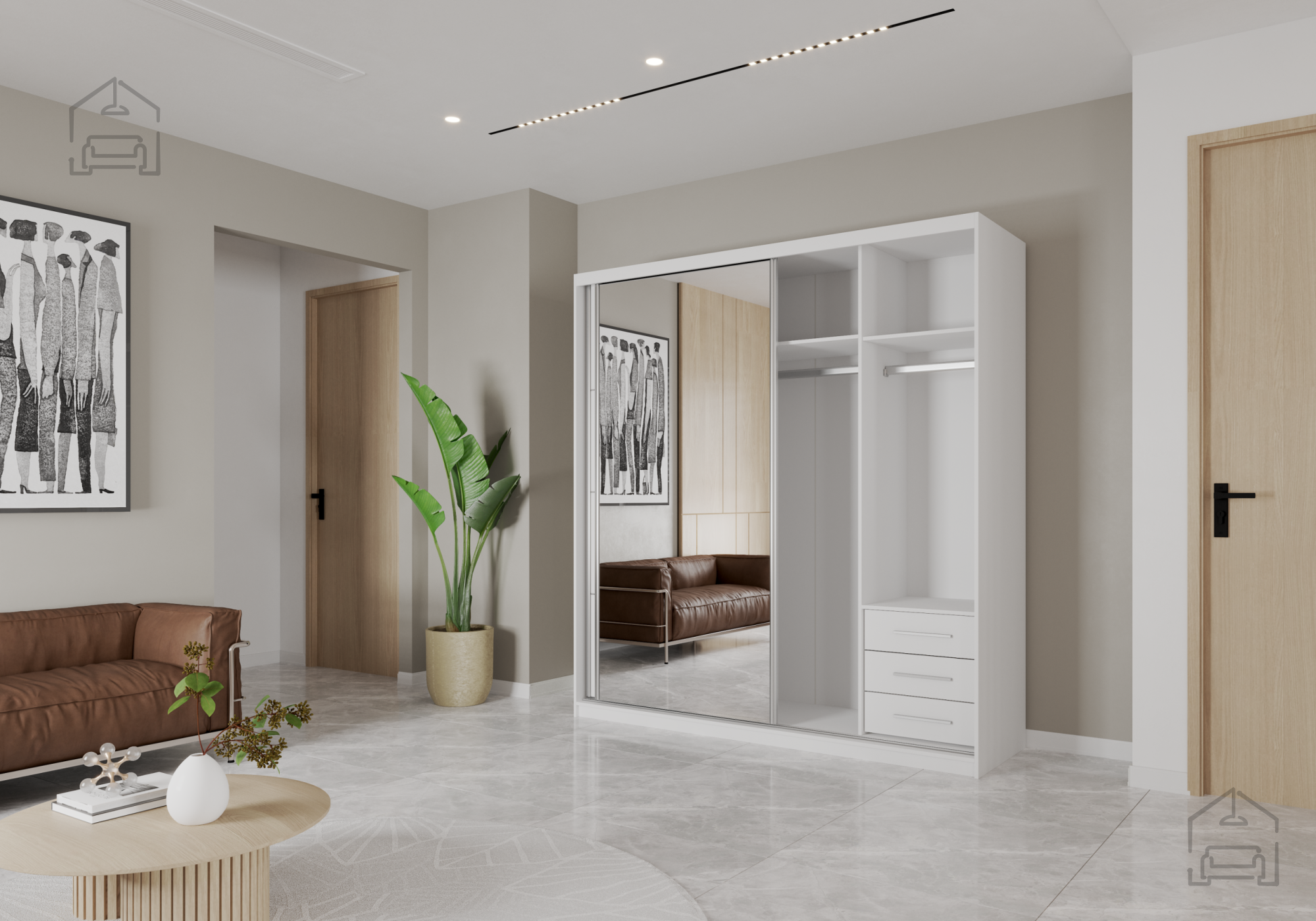 Bela barva garderobne omare Pola 42 203B je izjemno vsestranska. Dobro se ujema z modernimi minimalnimi ambienti, pa tudi s klasičnimi pohištvenimi slogi. Gladke površine in ravne linije poudarjajo sodobno estetiko, medtem ko nevtralni ton omogoča ustvarjanje harmoničnega in svetlega prostora.