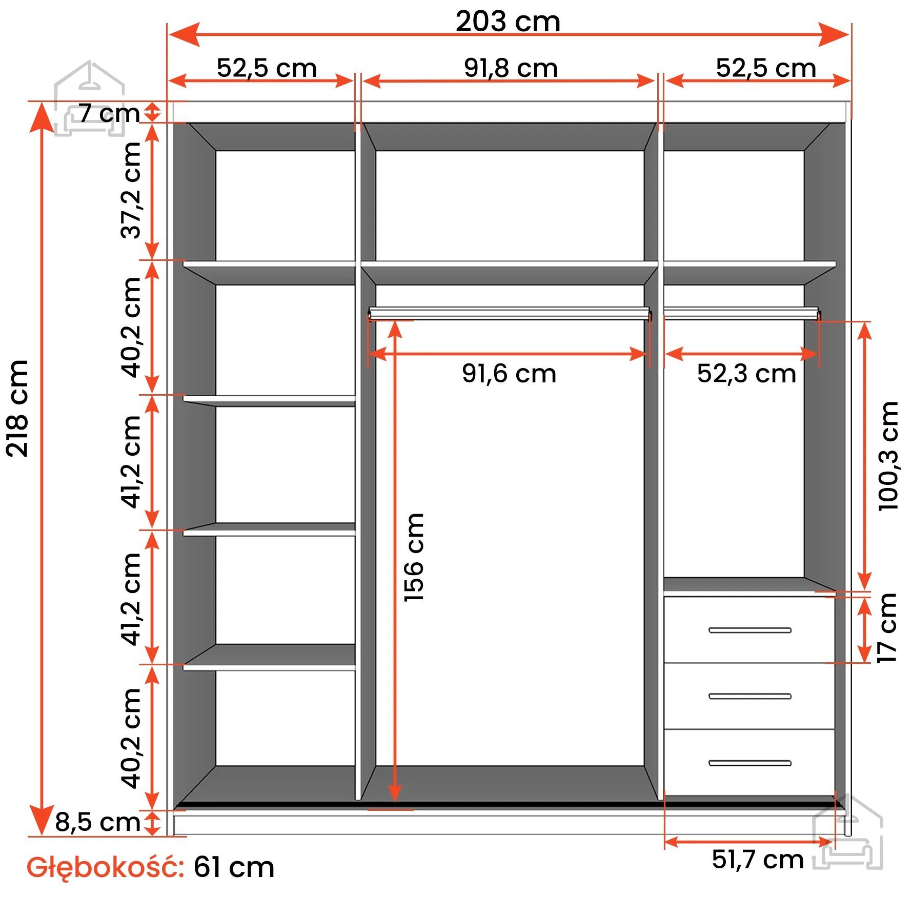 Drsna vrata so vgrajena na stabilen mehanizem, ki omogoča gladko in tiho premikanje. Takšna rešitev je posebej praktična v prostorih, kjer je pomembna racionalna izraba prostora. V notranjosti omare se običajno nahajajo police in prostori za obešanje oblačil, kar omogoča pregledno razporeditev garderobe. Zaradi dobro izkoriščene višine omare, ki meri 218 cm, lahko vanjo brez težav shranite tudi sezonska oblačila ali večje predmete.