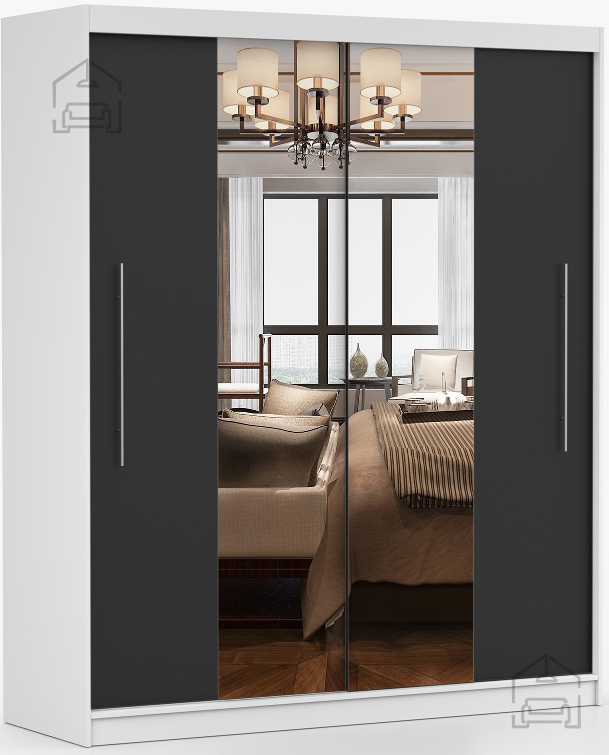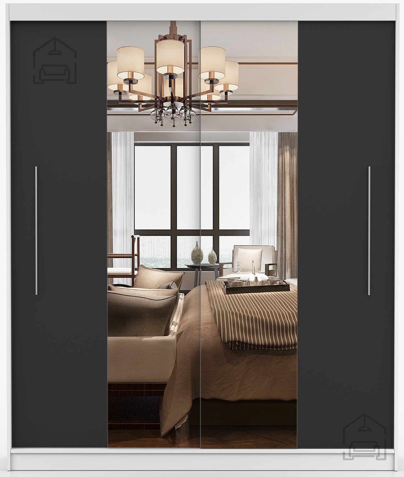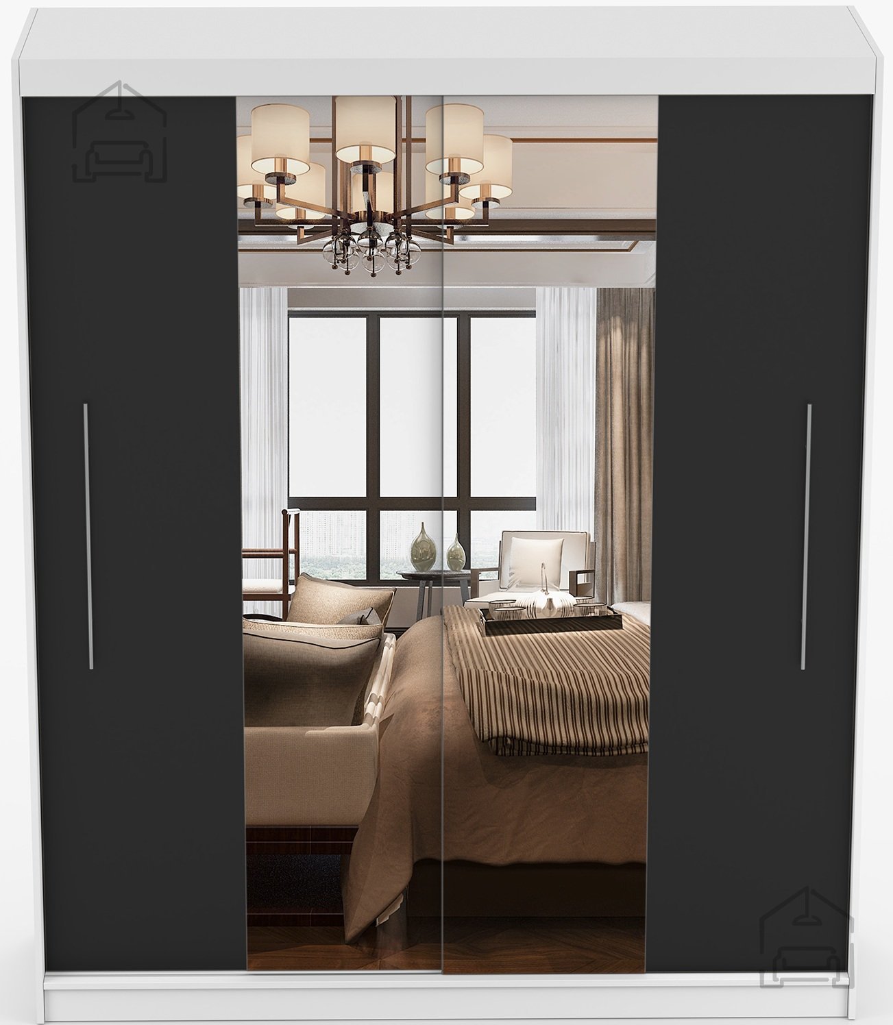 Garderobna omara z drsnimi vrati Torino z ogledalom predstavlja sodoben pristop k organizaciji prostora, kjer se prepletata funkcionalnost in eleganca. Zasnovana je v kombinaciji bele in črne barve, kar daje prostoru občutek ravnotežja ter vizualne globine. Omara, izdelana v priznani tovarni Idżczak meble na Poljskem, združuje natančno obdelavo površin, kakovostne materiale in premišljeno notranjo razporeditev. Njene dimenzije, 203x58x218 cm, omogočajo prostorno shranjevanje oblačil, dodatkov in drugih predmetov, ne da bi pri tem zavzela preveč prostora v sobi.