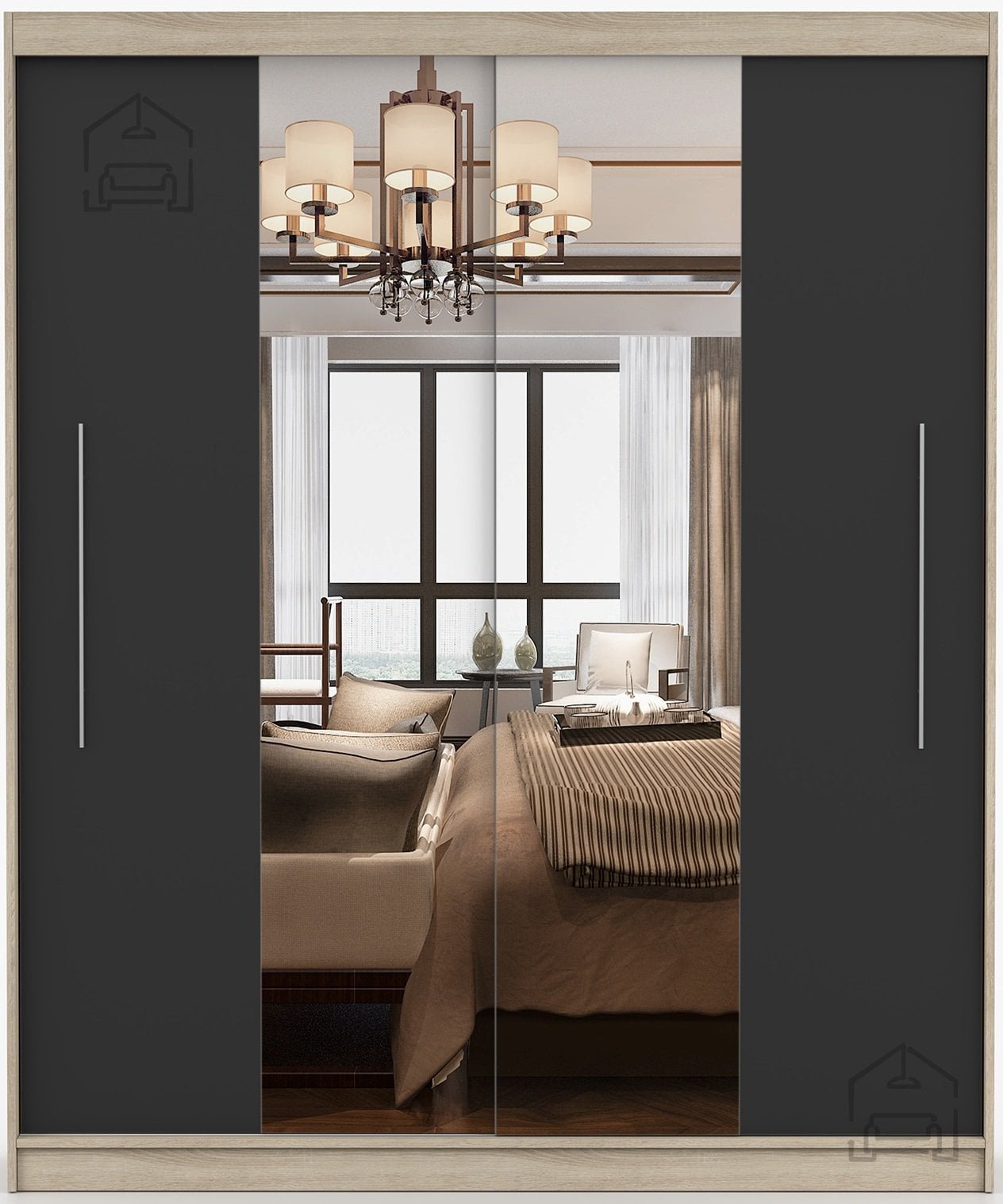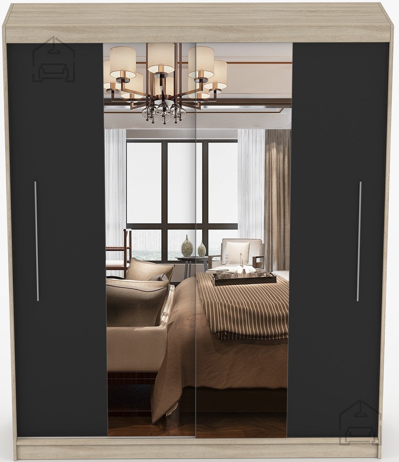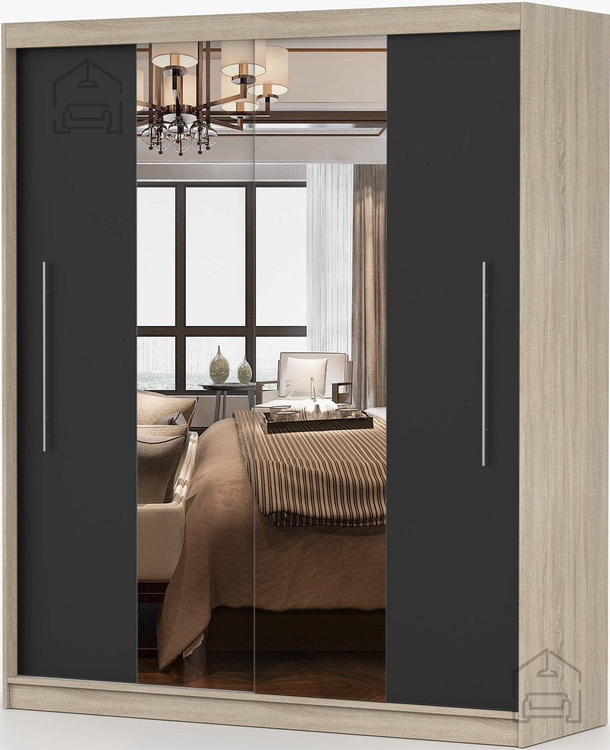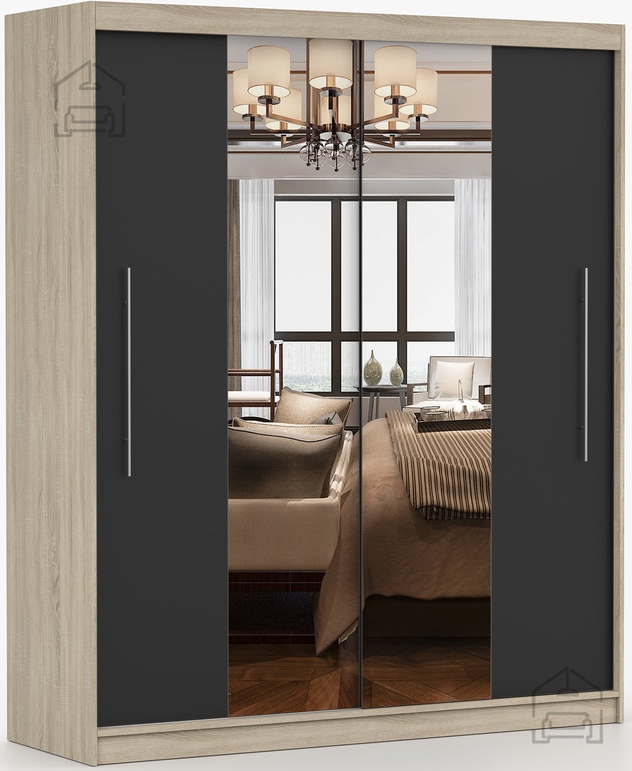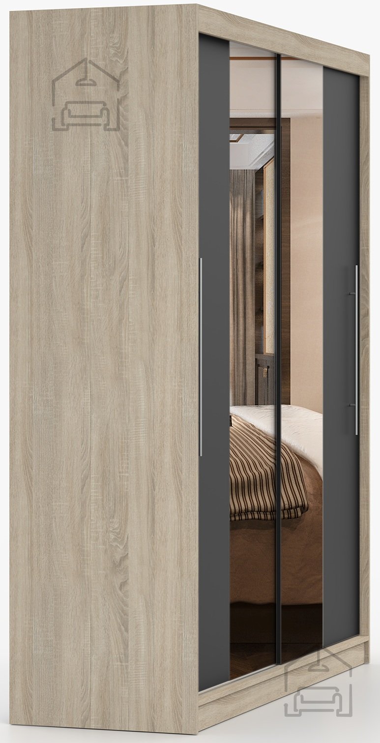 Ta prostorna garderobna omara združuje funkcionalnost, sodoben videz in kakovostno izdelavo. Zasnovana je za tiste, ki želijo v enem kosu pohištva pridobiti dovolj prostora za shranjevanje in obenem estetsen dodatek za spalnico ali predsobo. Izdelana je iz trpežne laminirane plošče, kar zagotavlja dolgo življenjsko dobo in enostavno vzdrževanje. Elegantna barvna kombinacija sonoma hrasta in črne ustvari prijeten kontrast, ki se lepo ujema z različnimi notranjimi slogi – od klasičnega do modernega.