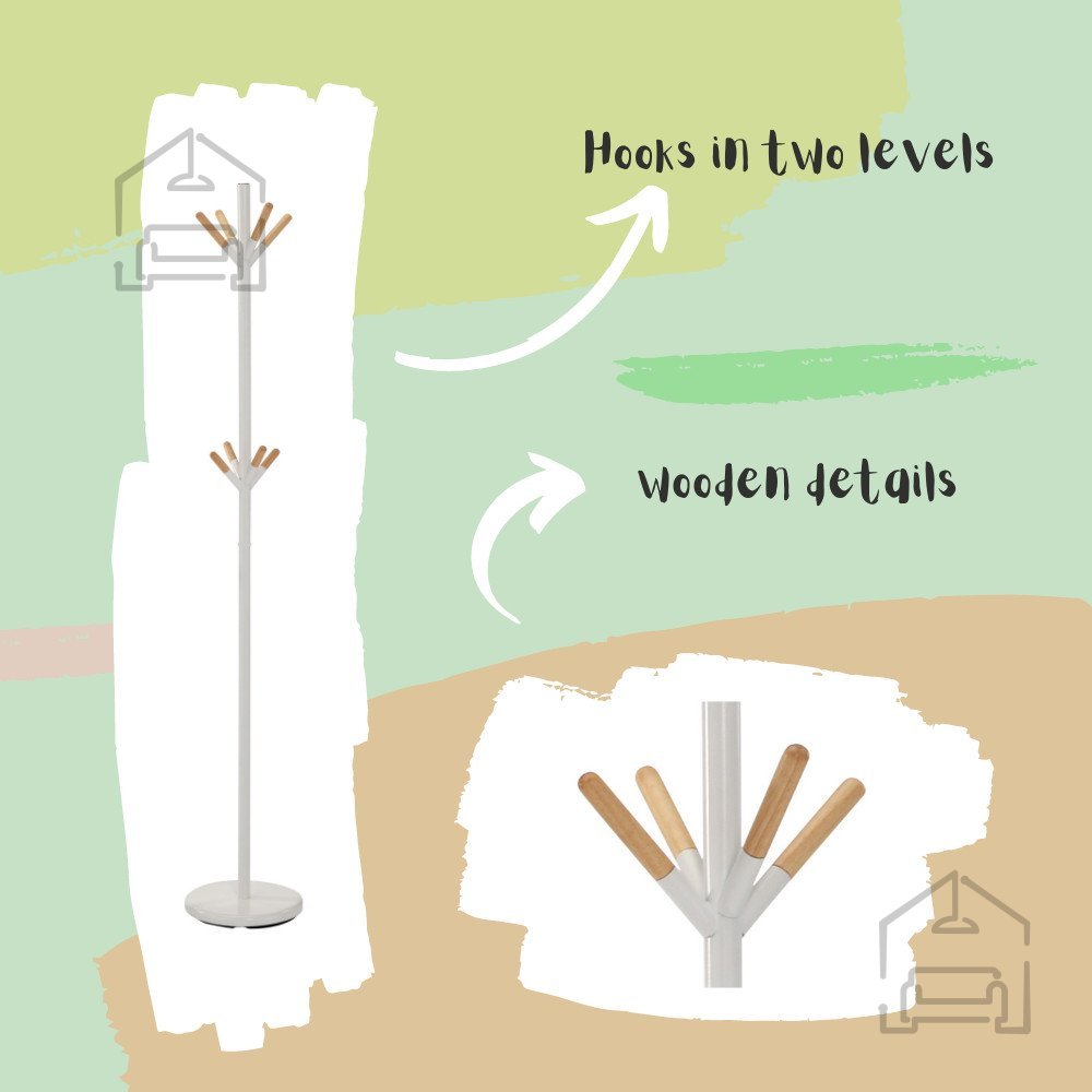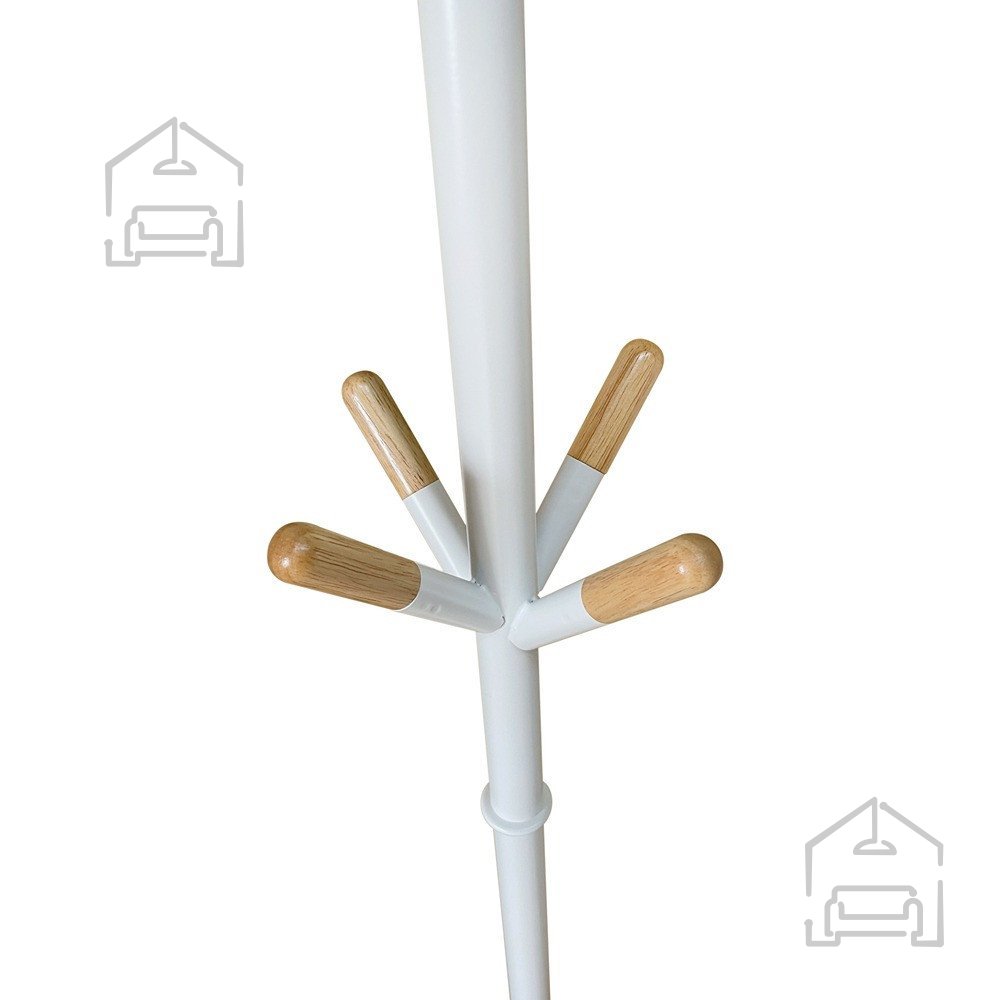 Obešalnik Desy je oblikovan tako, da poudari estetiko prostora, v katerem se nahaja. Bela in naravna barva lesa ustvarjata občutek zračnosti in topline, kar ga naredi primerno izbiro za predsobe, spalnice ali pisarne. Leseni deli iz kavčukovca dodajo pridih naravnosti, medtem ko kovinsko ogrodje s prašnim lakiranjem zagotavlja stabilnost in sodoben videz. Prašno lakiranje dodatno ščiti kovino pred praskami in korozijo, zato je obešalnik primeren tudi za dolgoročno uporabo v prostorih z večjo obremenitvijo.