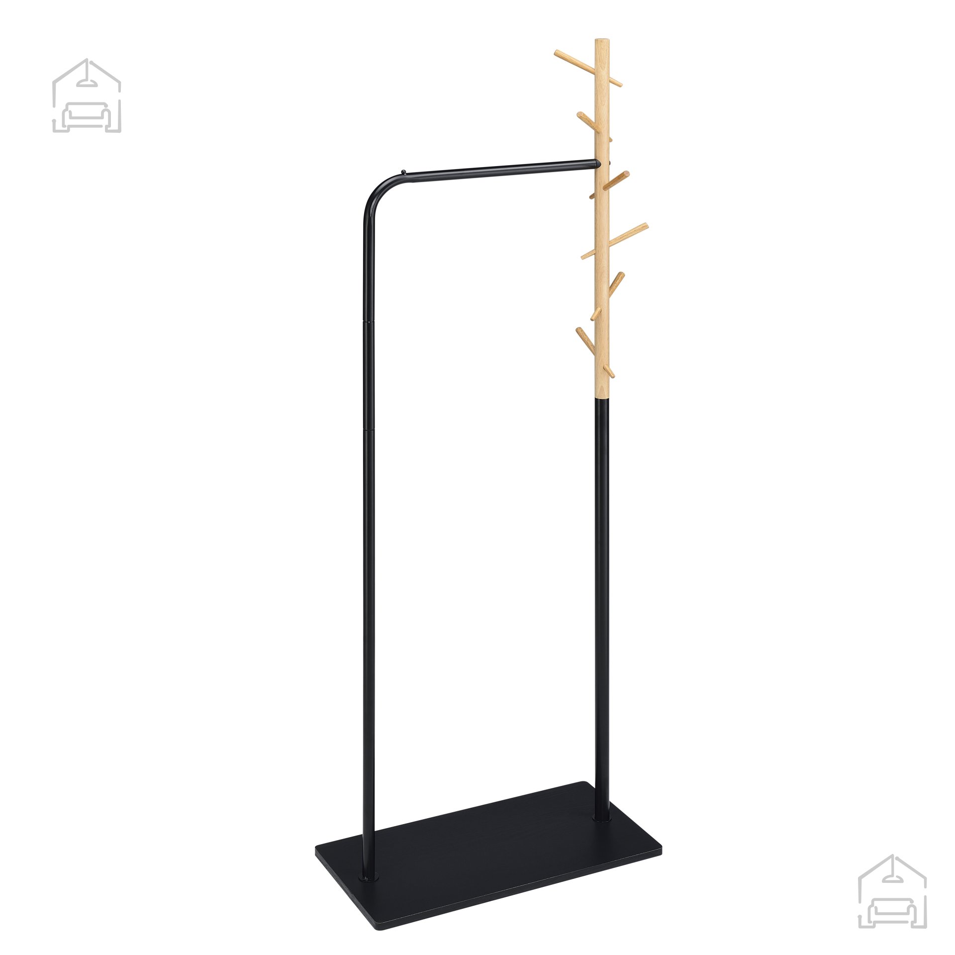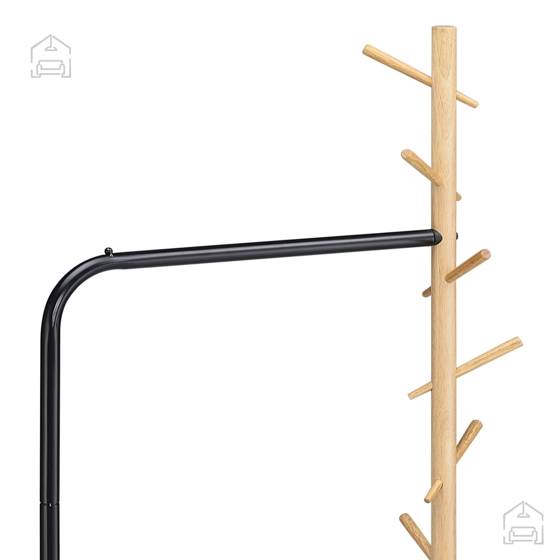 Najvišji del stojala sestavlja lesen steber z več kljukami, ki so razporejene na različnih višinah. Ta premišljena razporeditev omogoča enostavno obešanje plaščev, jaken, torb, rut ali drugih dodatkov različnih dolžin. Vsaka kljuka je trdno pritrjena in omogoča varno shranjevanje tudi težjih kosov oblačil, ne da bi se konstrukcija upognila ali izgubila stabilnost. Zaradi svoje višine in razmerja med širino ter globino (63x30x173 cm) stojalo ponuja dovolj prostora, ne da bi zavzelo preveč površine v prostoru.